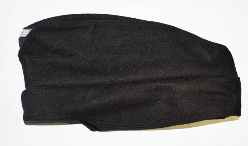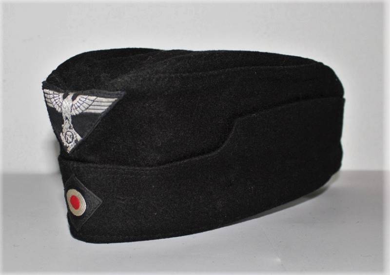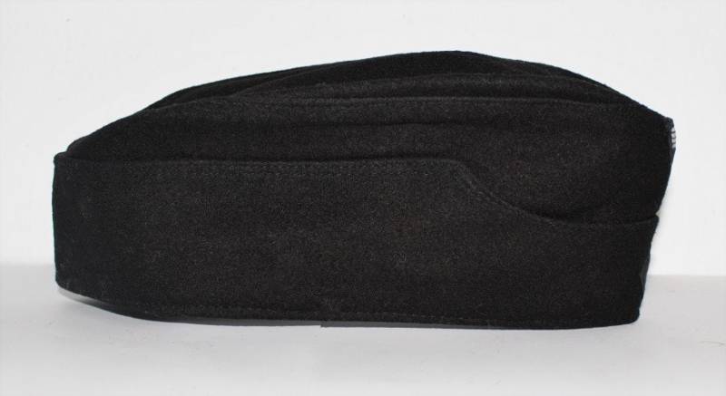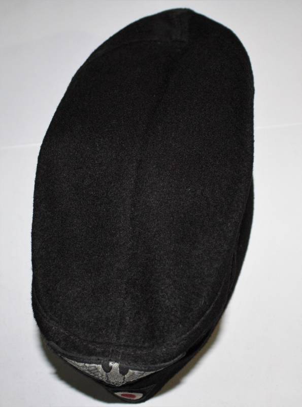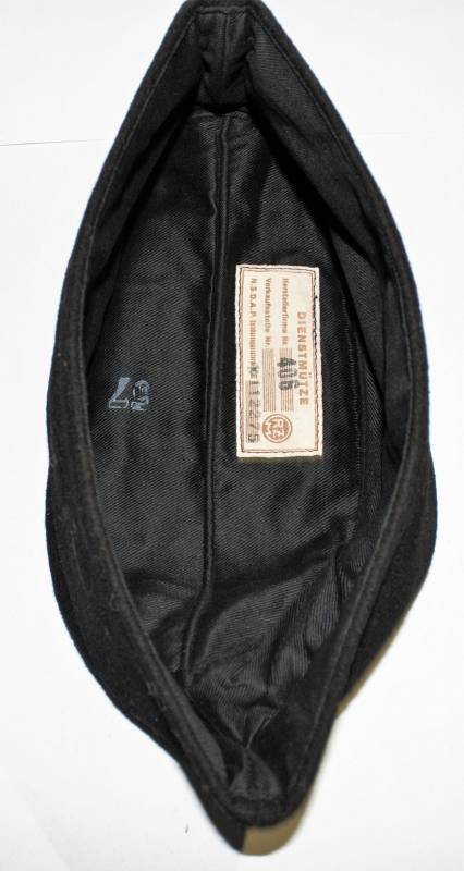 Bustina N.S.D.A.P. della TeNo in condizioni stupende pari al nuovo, mai usata, fondo di magazzino, nata in panno di lana nero, con fregi Bevo ricamati in filo metallico argentato cuciti a macchina dŽepoca, internamente cartellino cucito N.S.D.A.P RZM, con numeri di lotto del produttore. Taglia 56-57. Originale 100% WWII periodo.