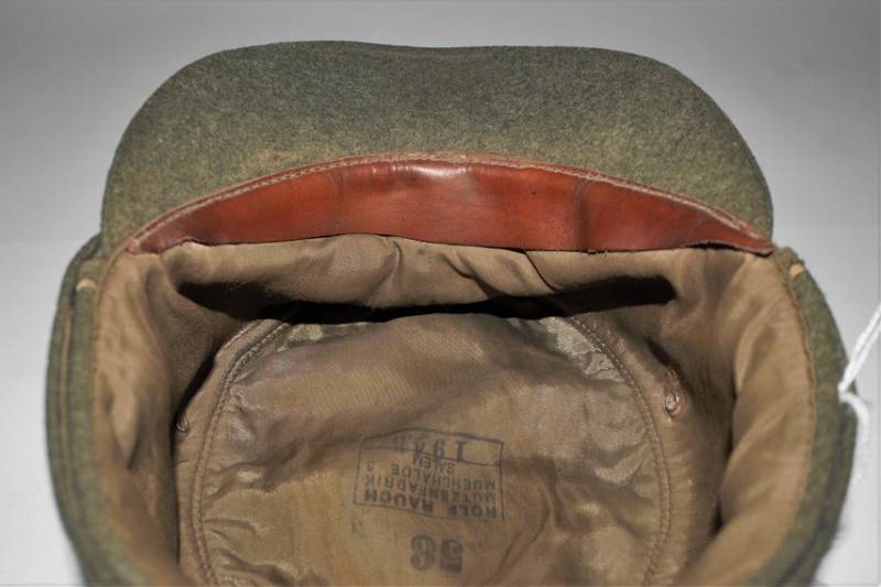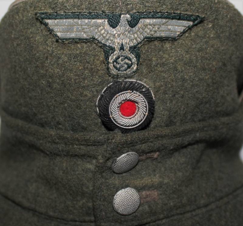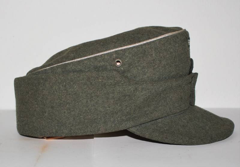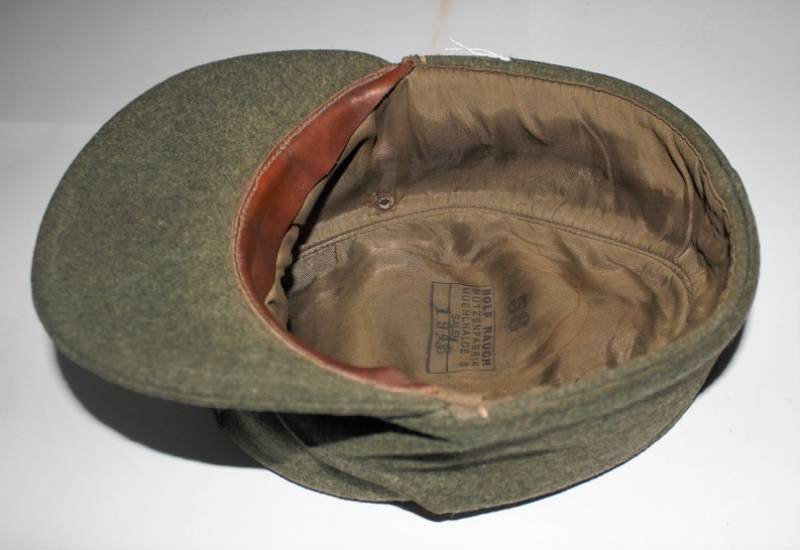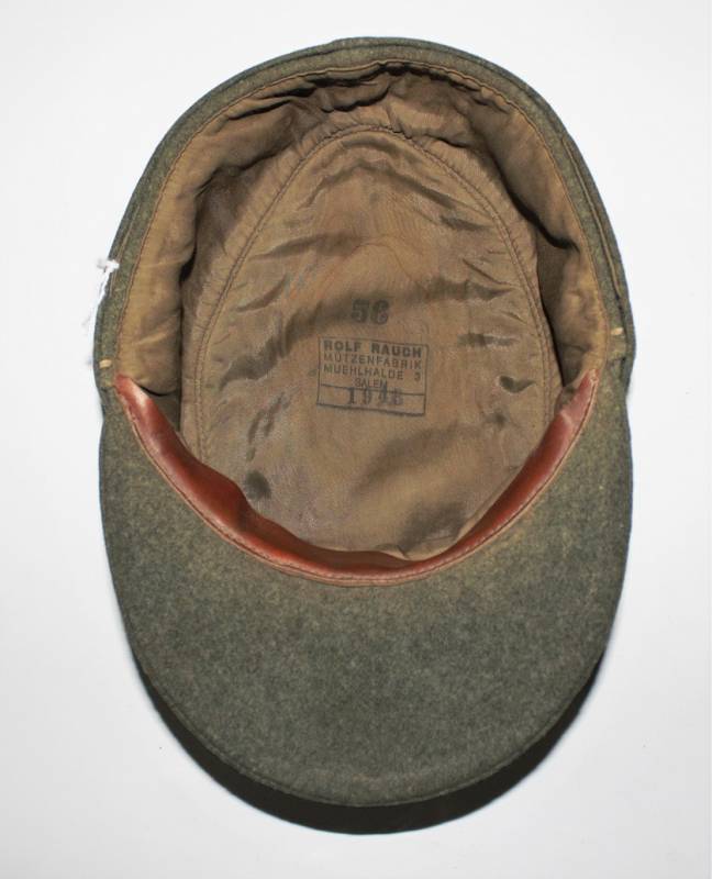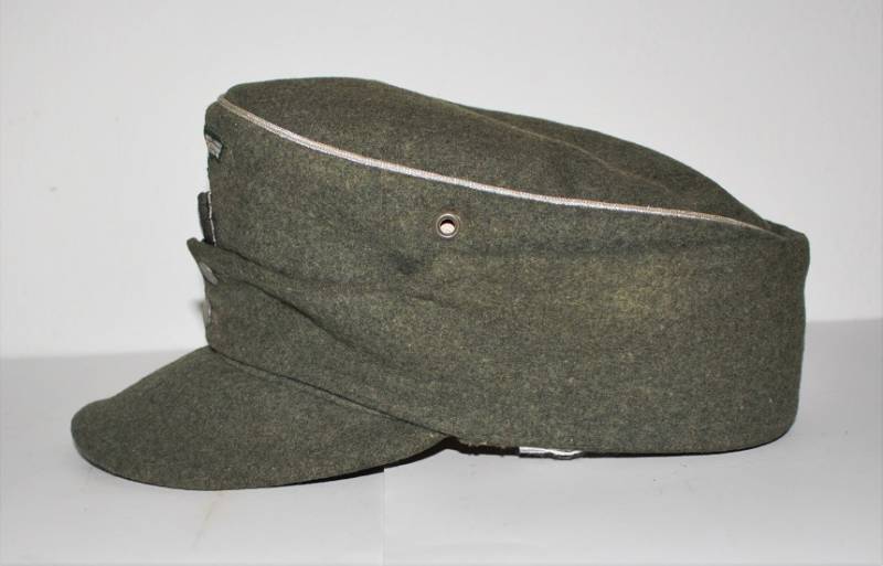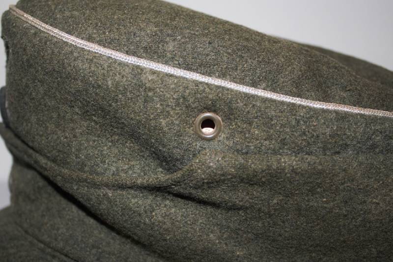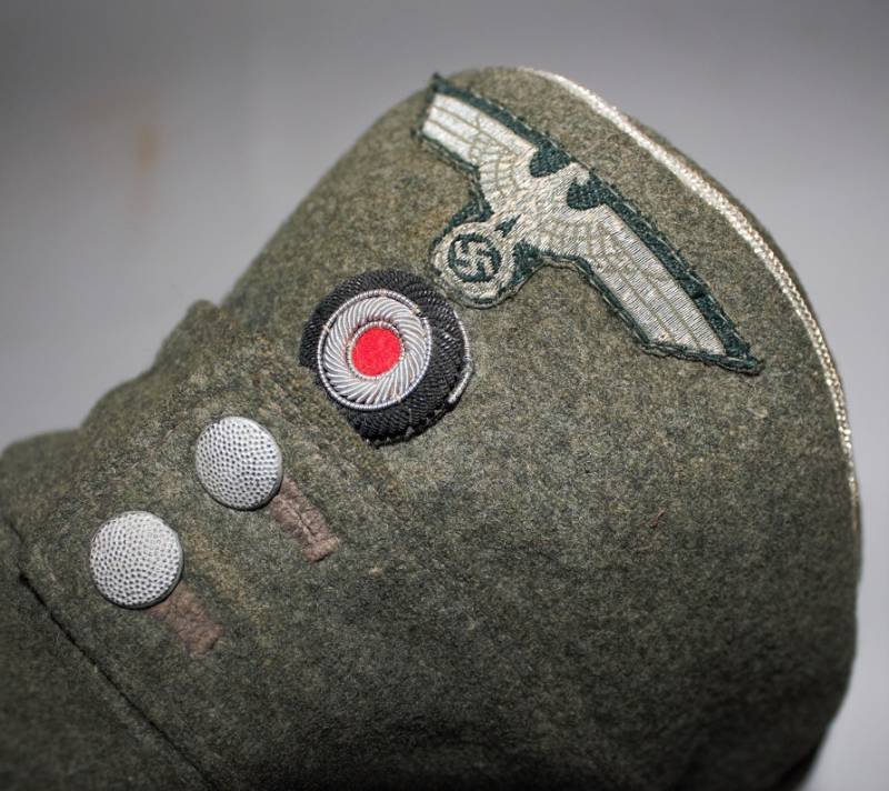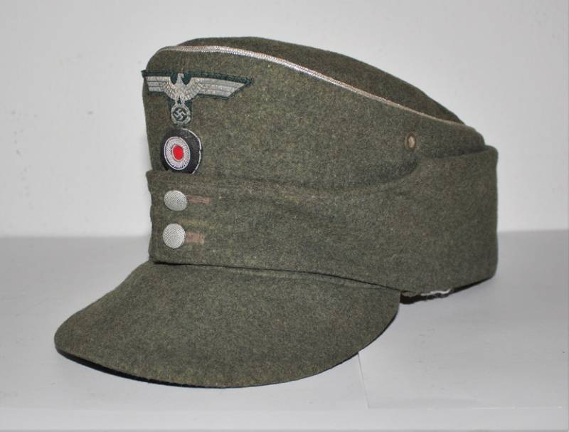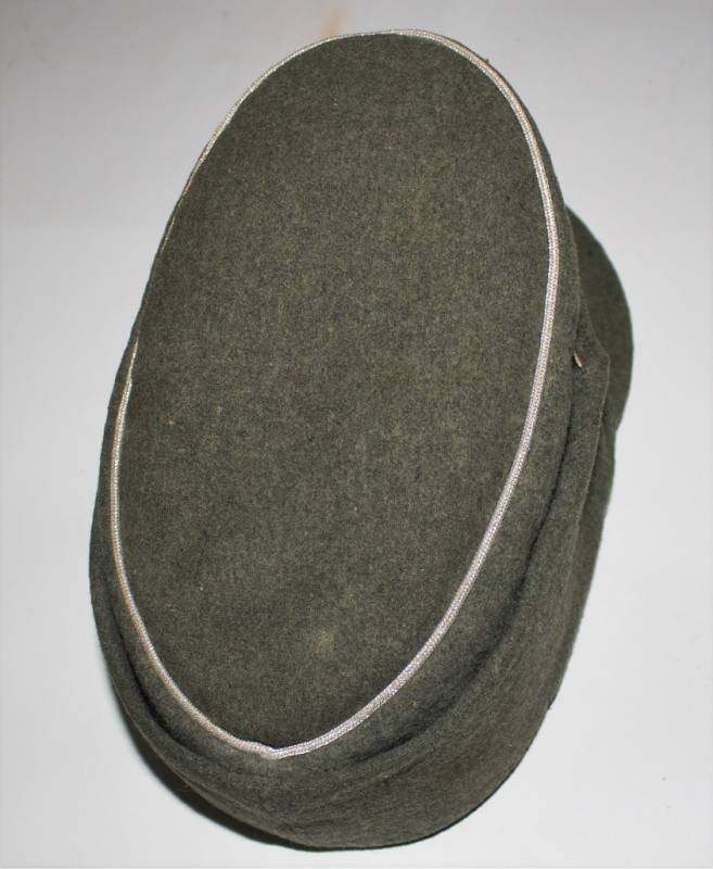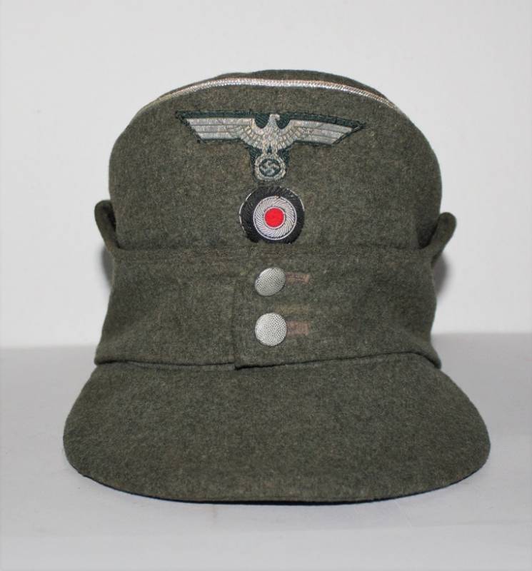 Berretto mod. M43 Ufficiale WH in ottime condizioni, completo in ogni sua parte, con aquila regolamentare in filo di alluminio per ufficiali cucito a macchina, leggera patina del tempo e dellŽuso, senza buchi e strappi, realizzato in panno di lana feldgrau da combattimento, marcato internamente con logo del fabbricante, data 1943 e taglia 58. Originale 100%. WWII periodo.