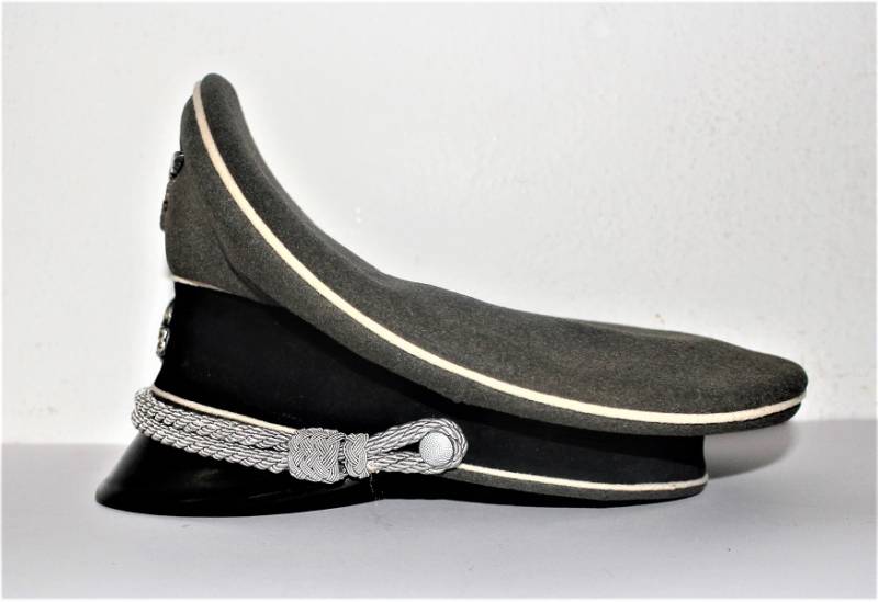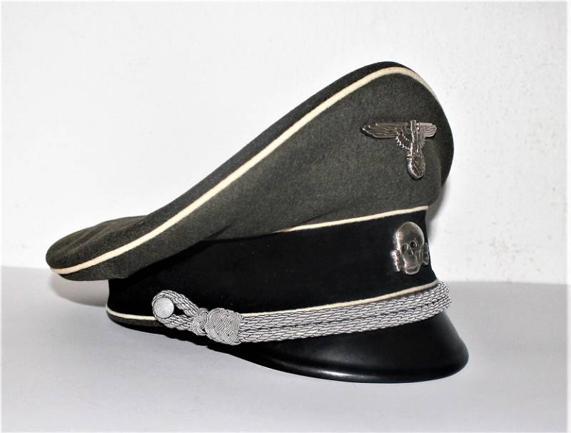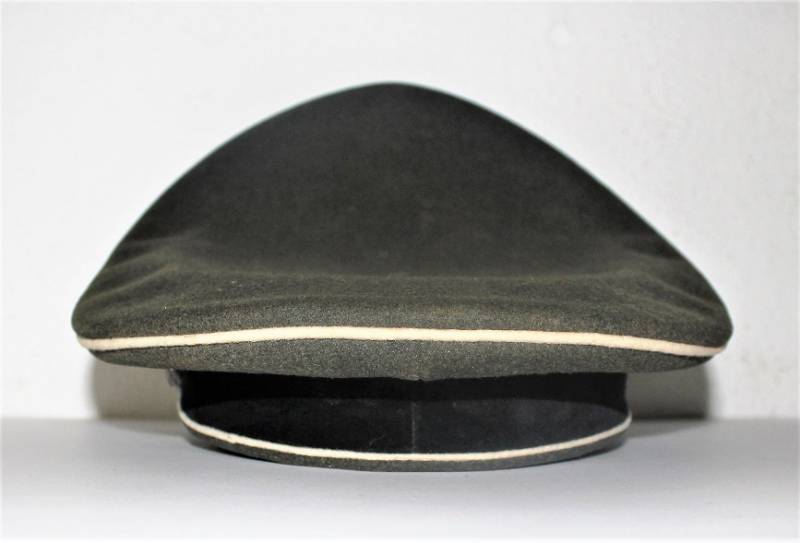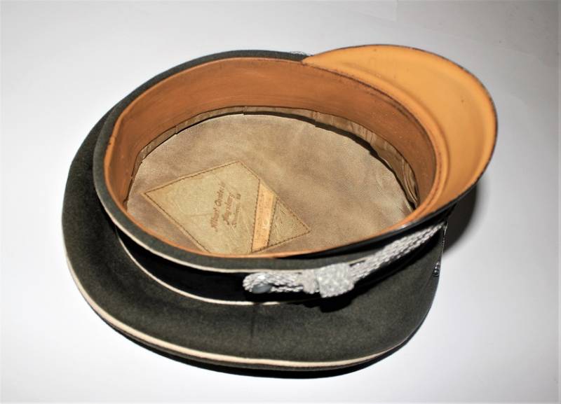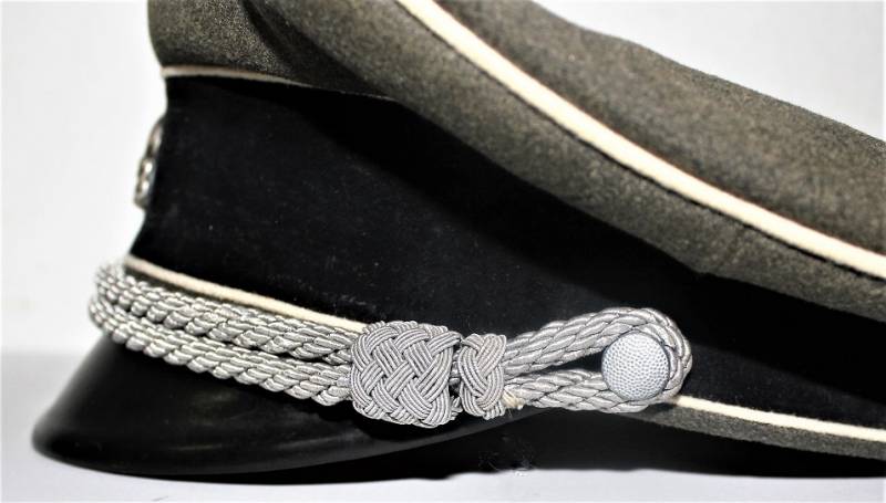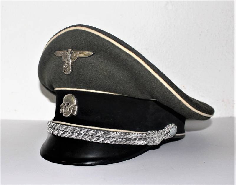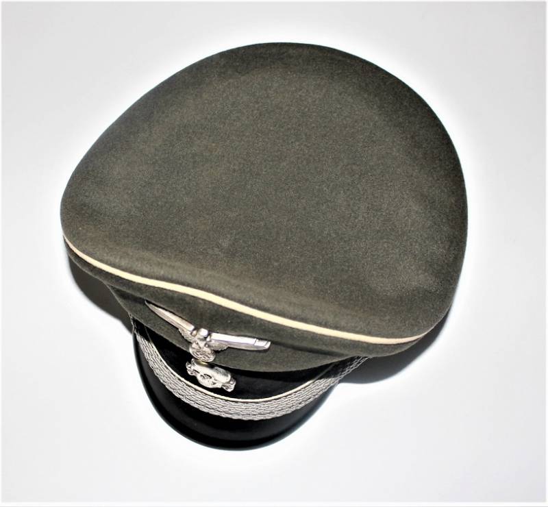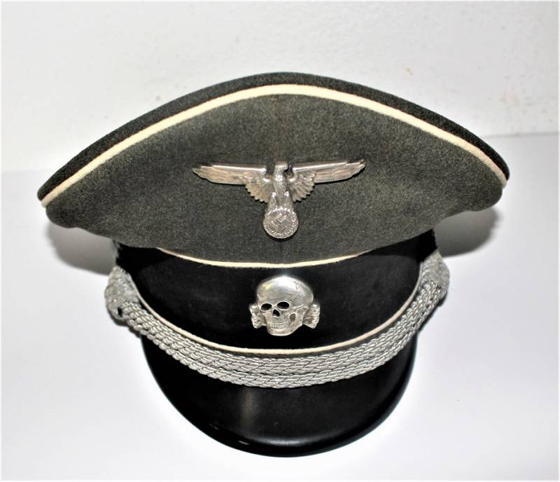 Bellissimo schirmmutze da Ufficiale W.SS fanteria waffenfarbe bianco in ottime condizioni, leggeri segni di usura e del tempo, realizzato in elegante panno di lana pettinata color grigio-verde, completo in ogni sua parte senza buchi o strappi, fregi mai rimossi, interno con diamante in celluloide con logo del fabbricante, cartellino con grado e nome del soldato sotto il diamante di celluloide. Taglia circa 57. Originale 100%. WWII periodo.