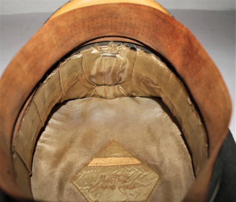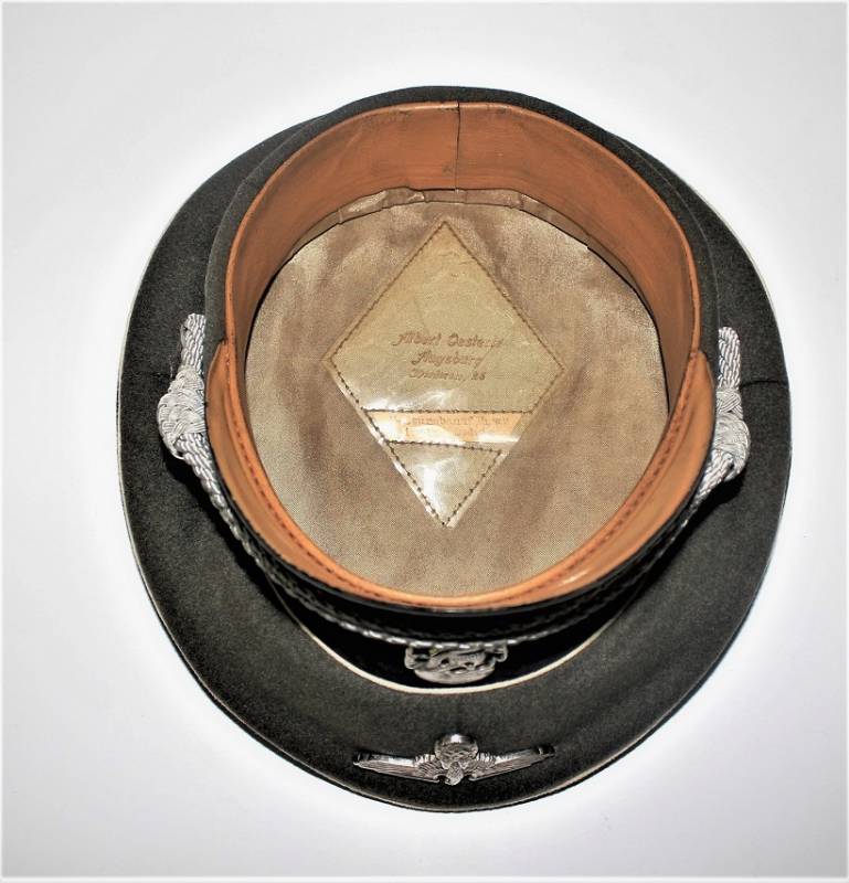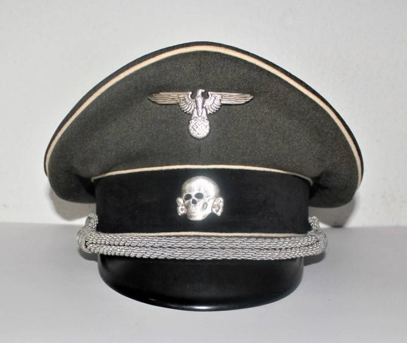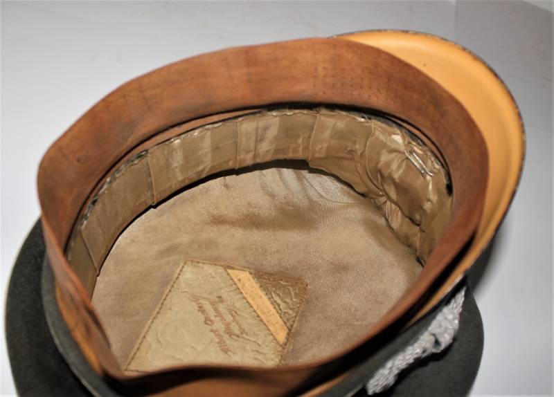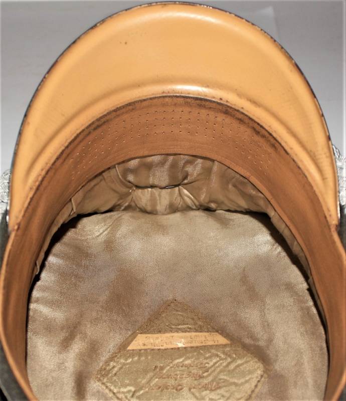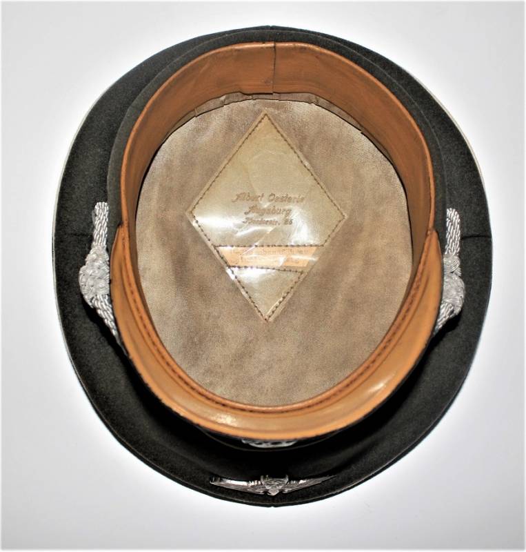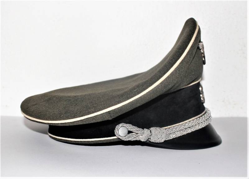 Bellissimo schirmmutze da Ufficiale W.SS fanteria waffenfarbe bianco in ottime condizioni, leggeri segni di usura e del tempo, realizzato in elegante panno di lana pettinata color grigio-verde, completo in ogni sua parte senza buchi o strappi, fregi mai rimossi, interno con diamante in celluloide con logo del fabbricante, cartellino con grado e nome del soldato sotto il diamante di celluloide. Taglia circa 57. Originale 100%. WWII periodo.