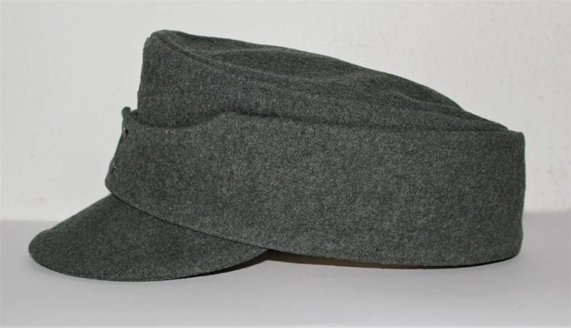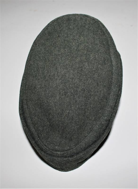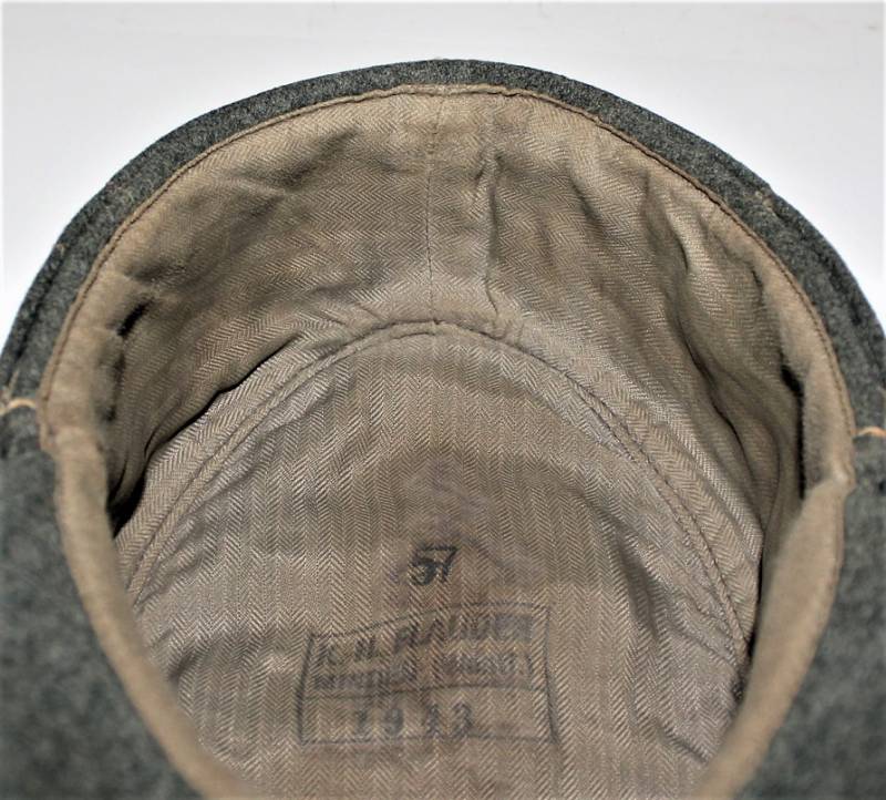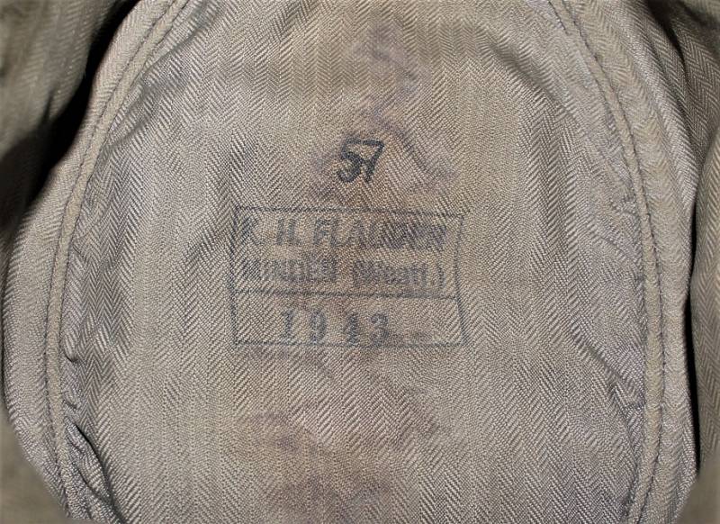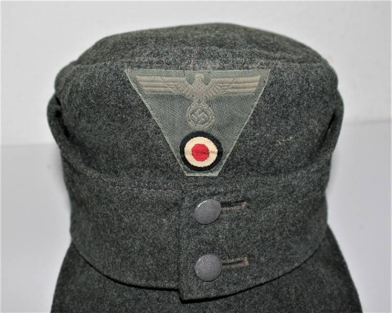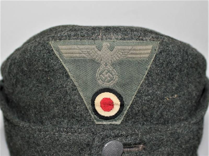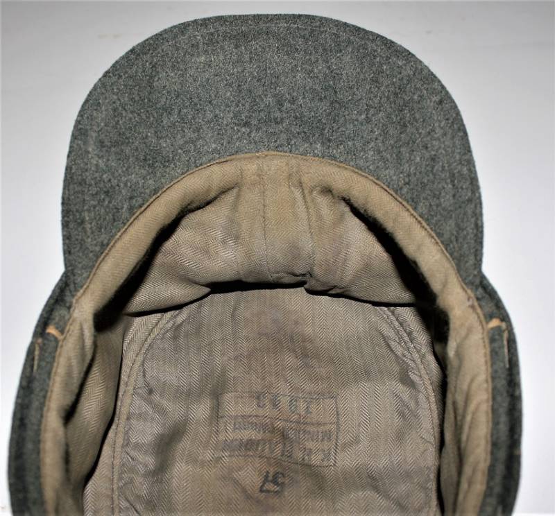Berretto M43 da truppa della WH, in ottime condizioni con leggerissimi segni di portatura e del tempo, completo in ogni sua parte, con fregio triangolare mai rimosso, realizzato in panno di lana feldgrau, marcato internamente con logo del fabbricante, data 1943 e taglia 57. Originale 100% WWII periodo.