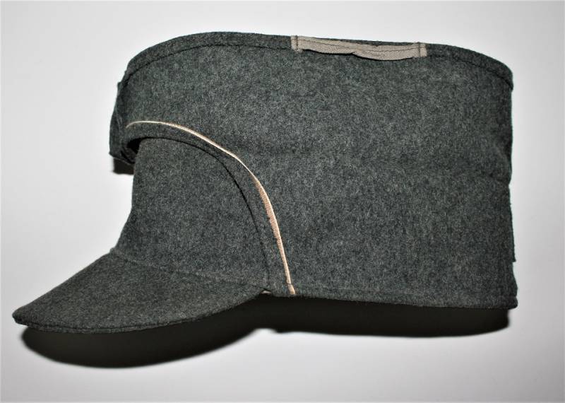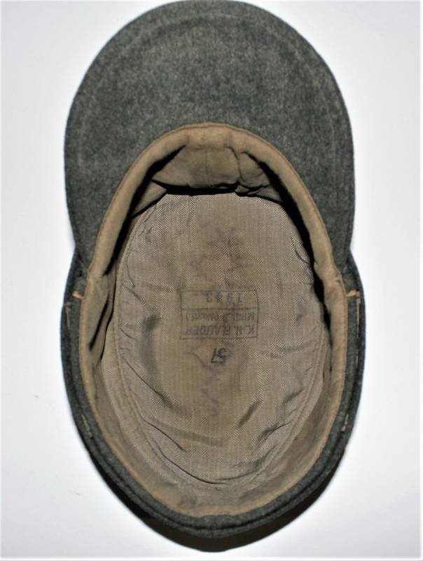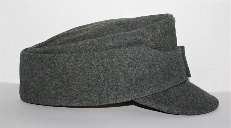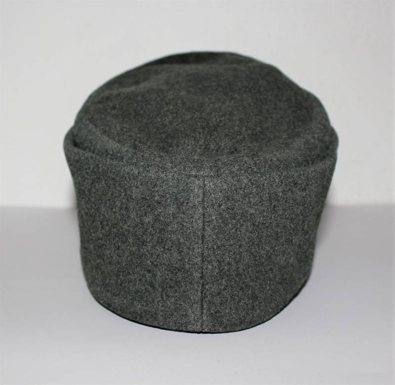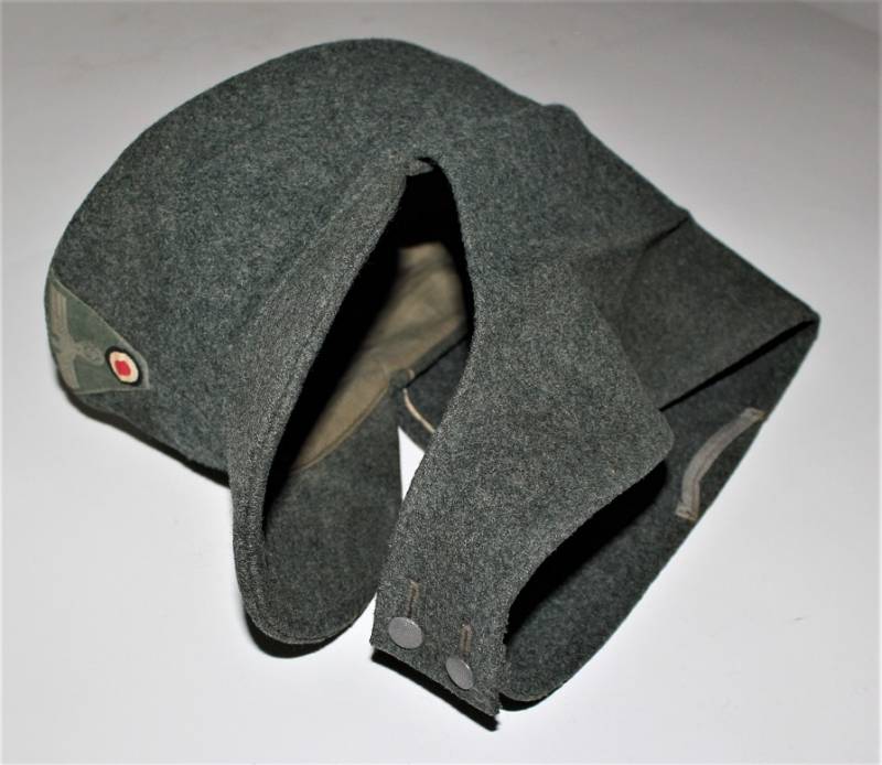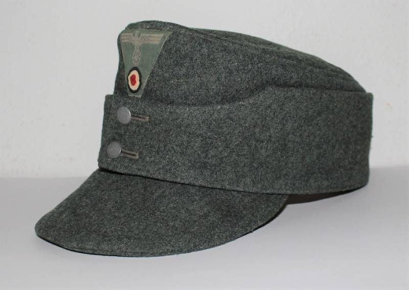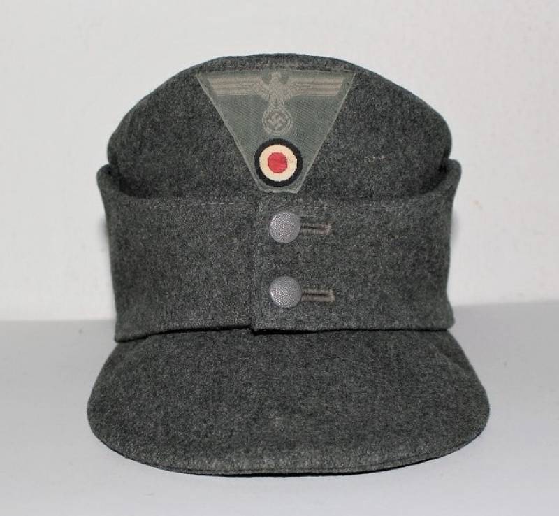 Berretto M43 da truppa della WH, in ottime condizioni con leggerissimi segni di portatura e del tempo, completo in ogni sua parte, con fregio triangolare mai rimosso, realizzato in panno di lana feldgrau, marcato internamente con logo del fabbricante, data 1943 e taglia 57. Originale 100% WWII periodo.