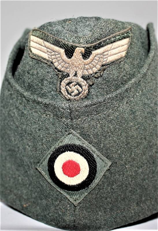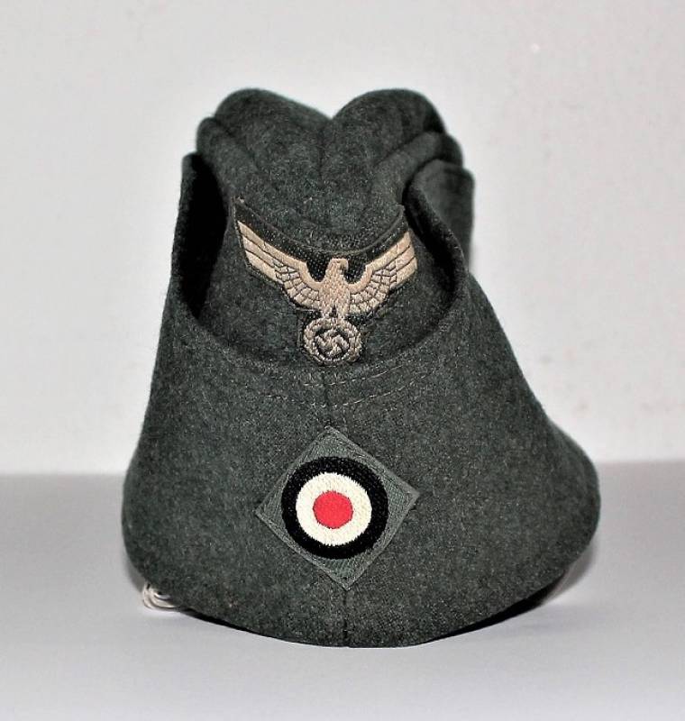 Bustina mod.40 della WH in ottime condizioni con leggerissimi segni del tempo e dellŽuso, non restaurata o riparata, senza buchi o strappi, fregi montati in epoca mai rimossi. Non marcata. Taglia circa a 57-58. Probabile costruzione fine guerra. Originale 100% WWII periodo.