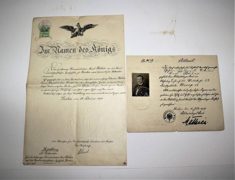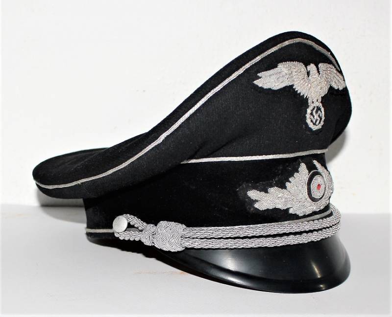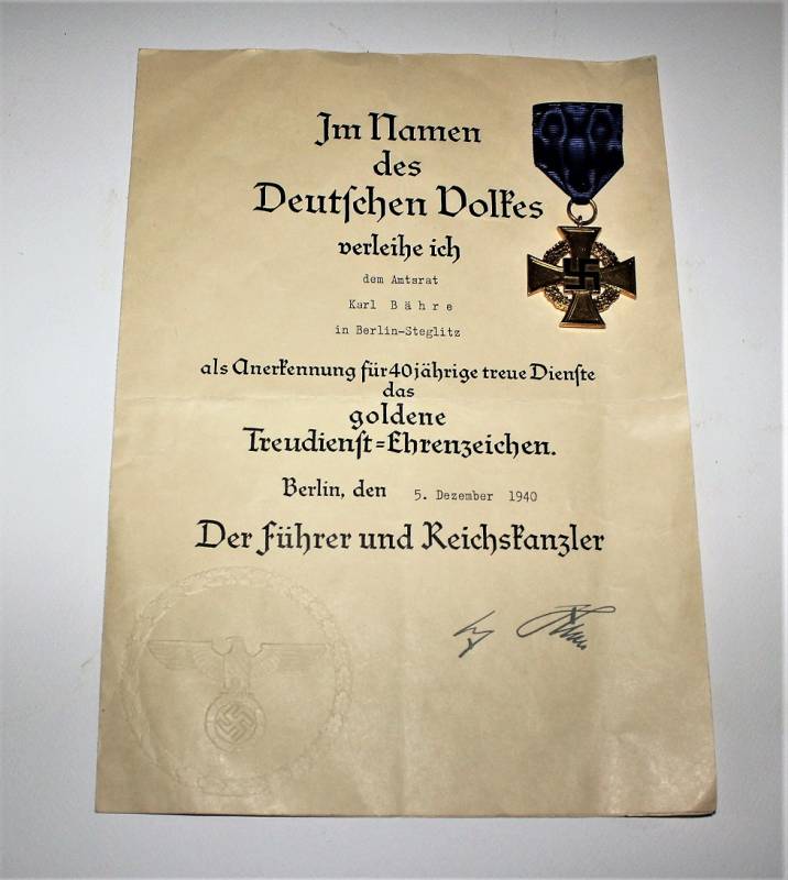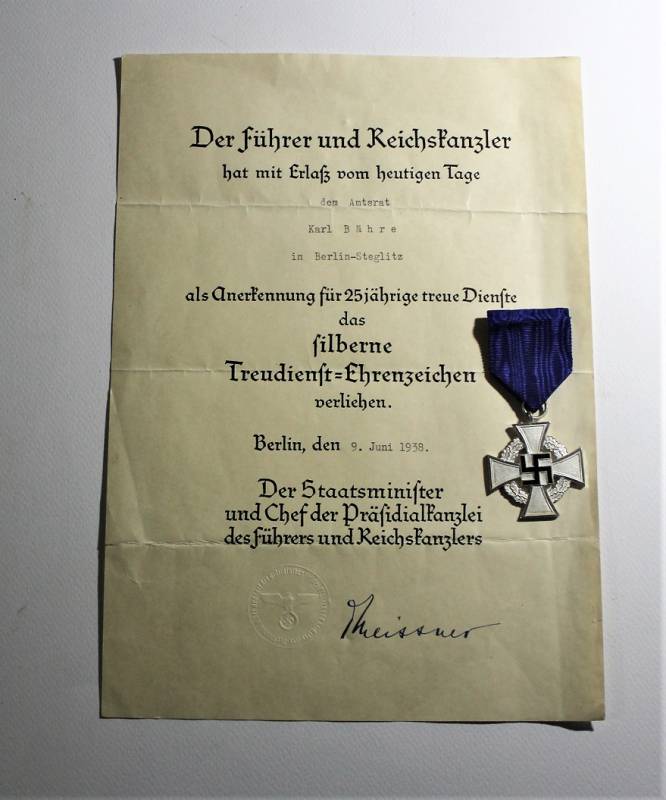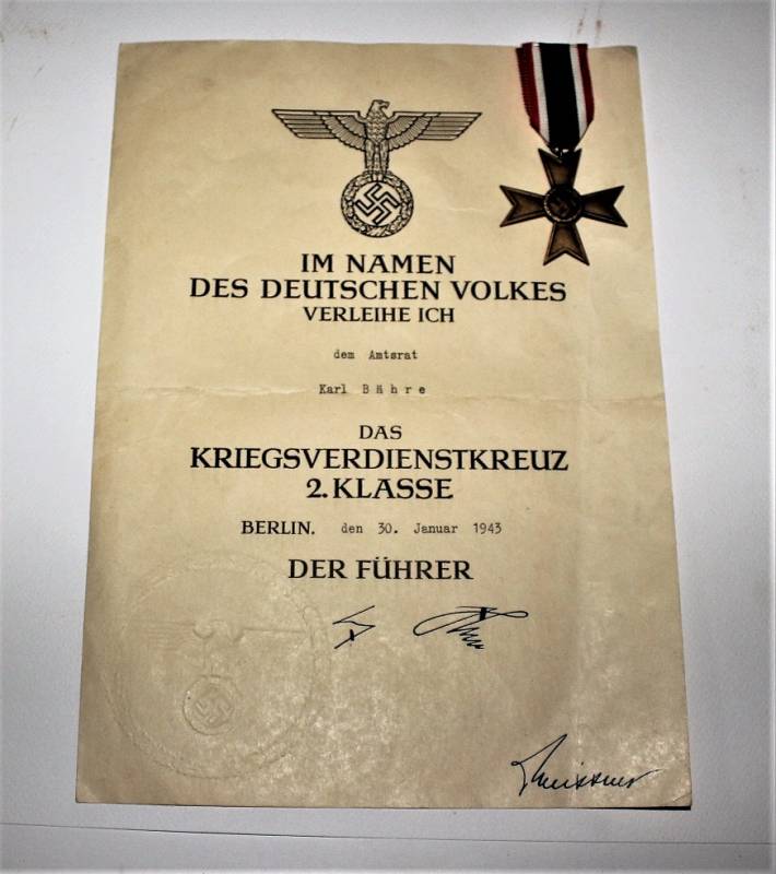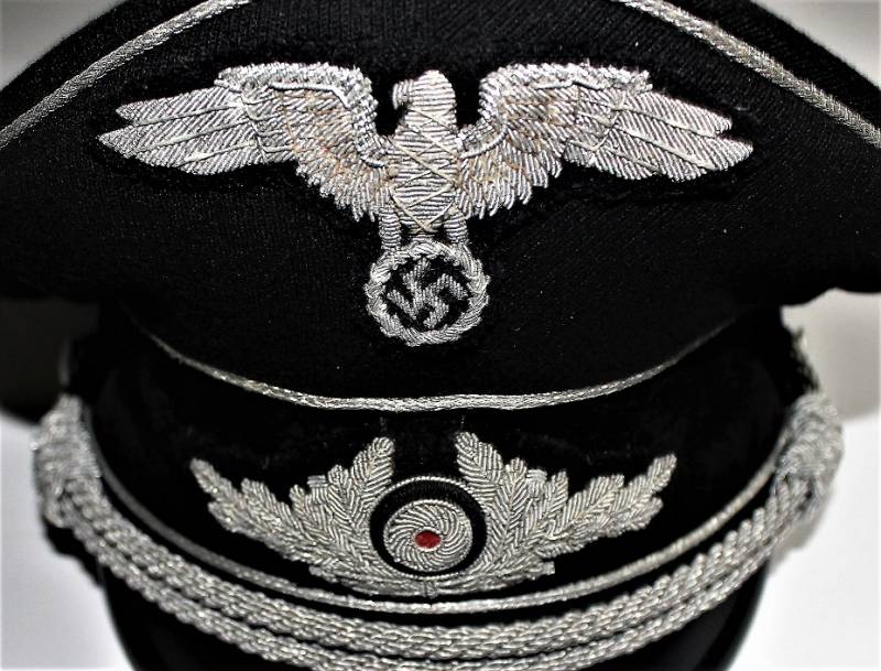 Bellissimo set di un Diplomatico comprendente stupendo schirmmutze di alto grado in condizioni perfette, con leggerissimi segni del tempo e dell“uso, completo di stupendi fregi ricamati in canottiglia montati in epoca, realizzato in stoffa di gabardina-tricot, completo del suo diamante di celluloide, non restaurato o riparato; taglia circa 57. Inoltre accompagnato da documenti personali con decorazioni di anzianitą di servizio e croce al merito di 2° classe con relativi diplomi di conferimento, due dei quali con firma di Adolf Hitler e timbro a secco pił altri documenti prebellici. Il tutto berretto e documenti nominativi appartenuti allo stesso funzionario diplomatico. Originale 100% WWII periodo.