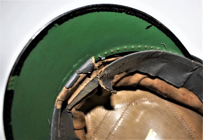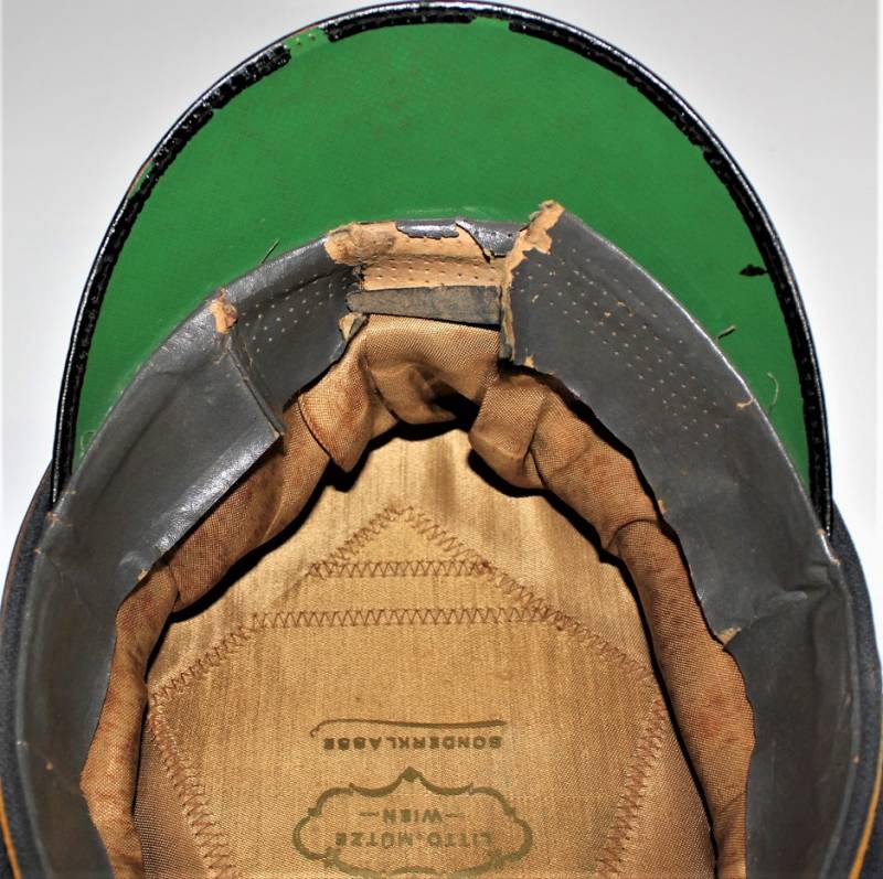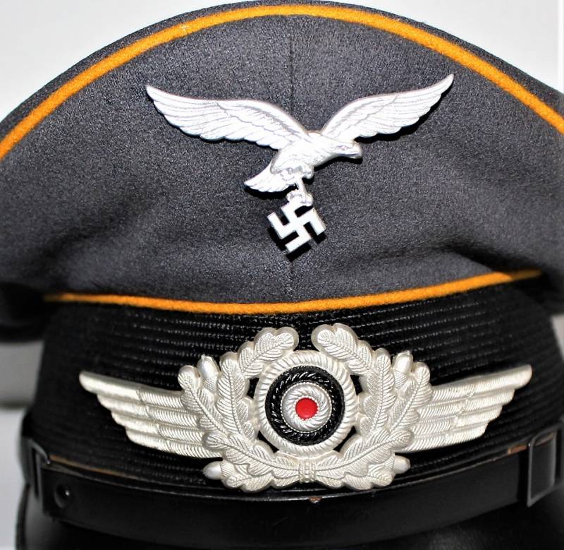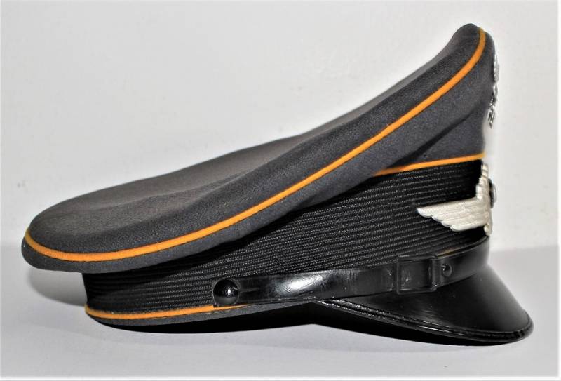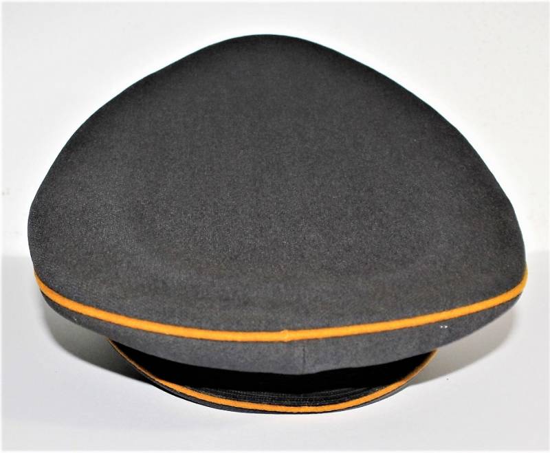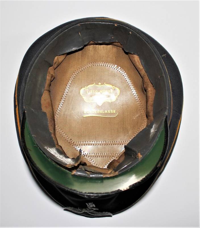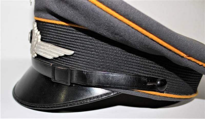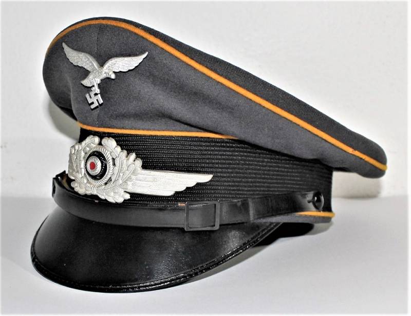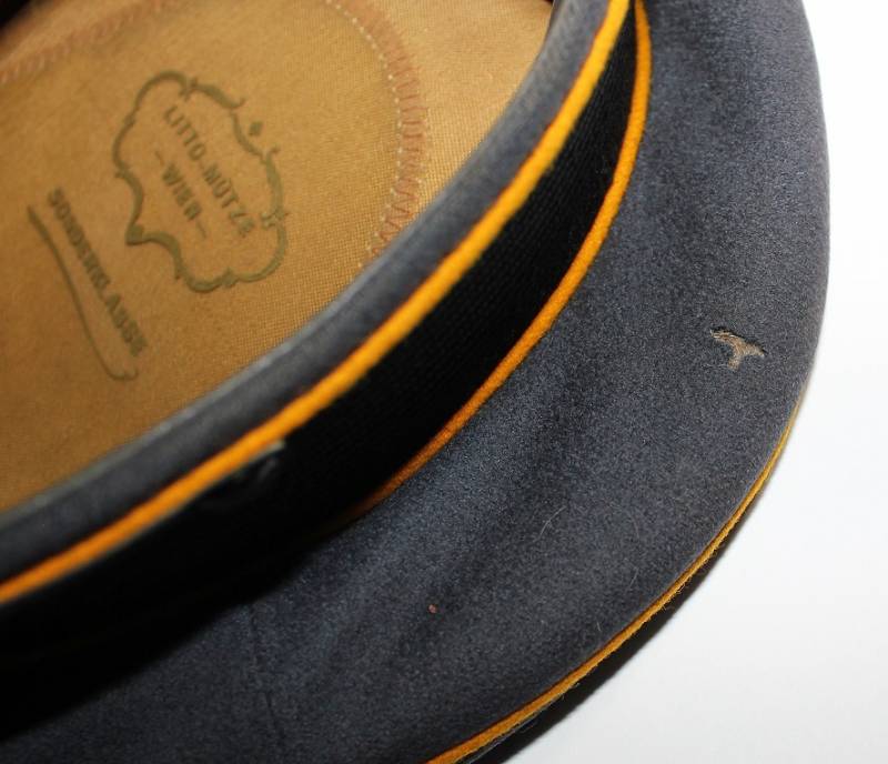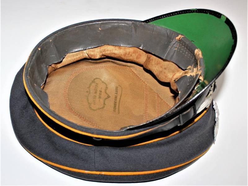 Schirmmutze da Sottufficiale della LW waffenfarbe giallo per paracadutisti o personale di volo, condizioni discrete, bella forma, completo in ogni sua parte. Interno purtroppo lesionato sulla parte interiore, completo con diamante di celluloide con nome del fabbricante. Originale 100% WWII periodo.