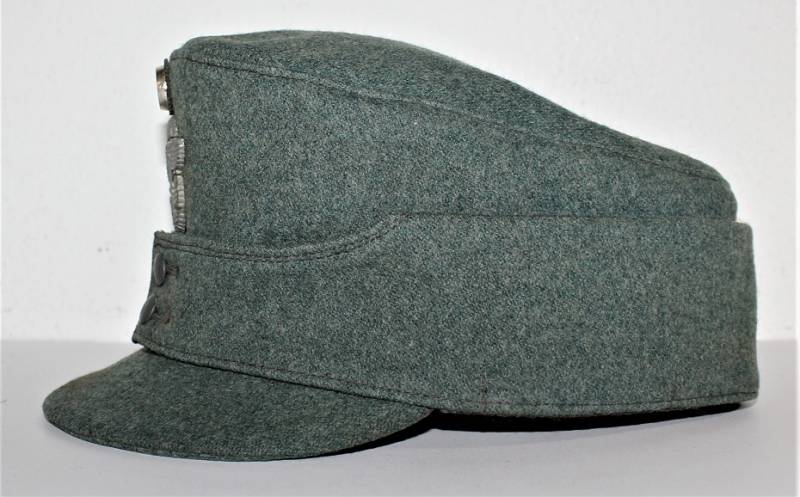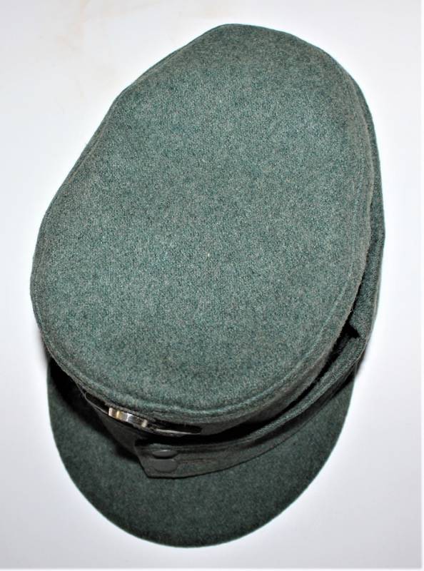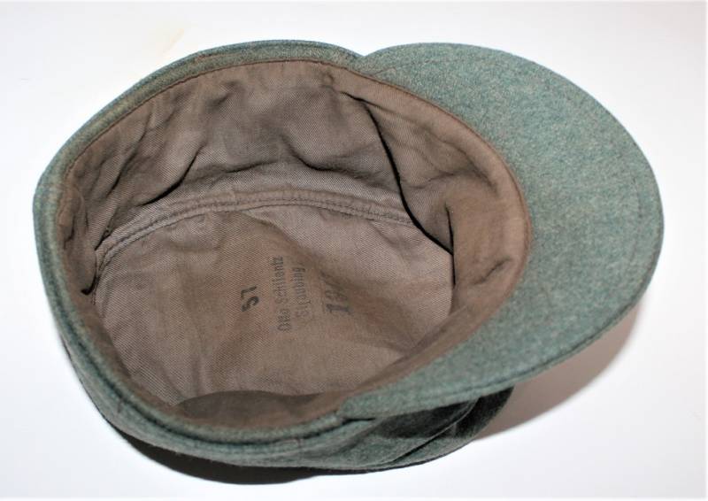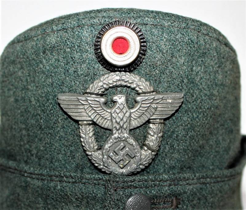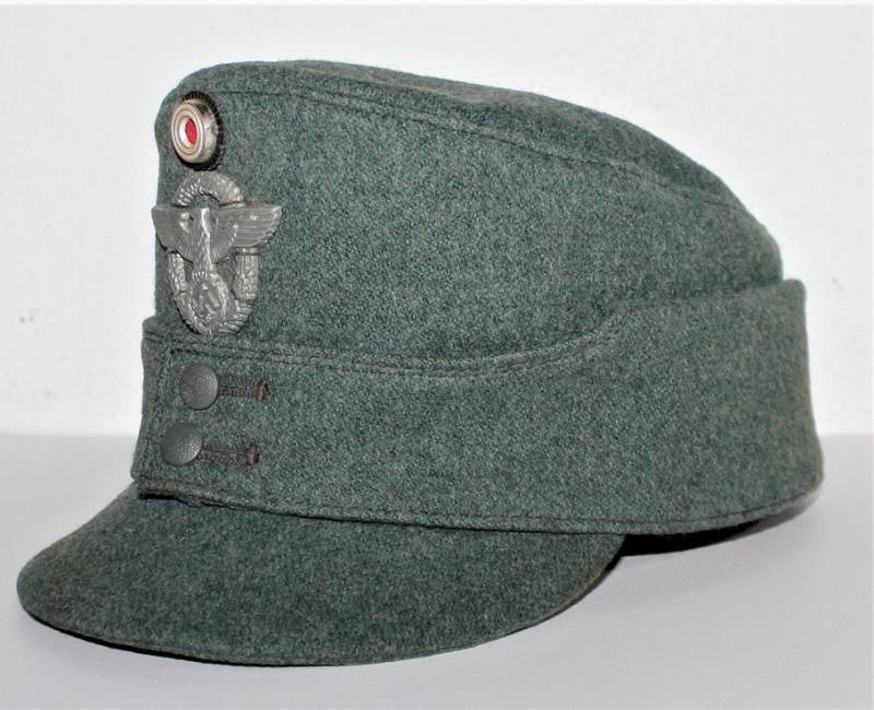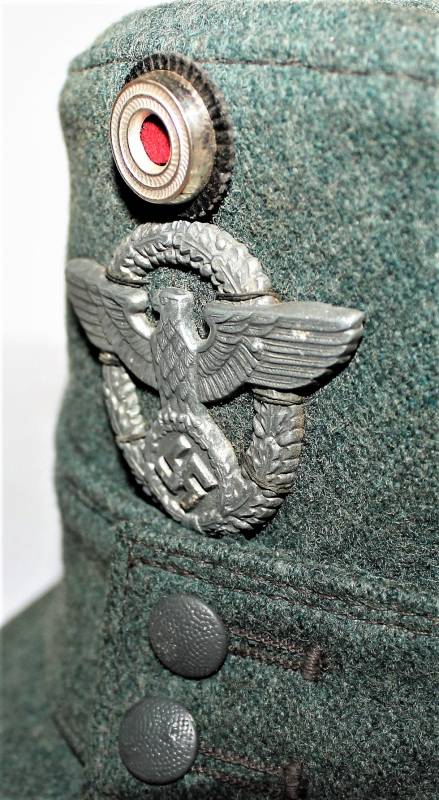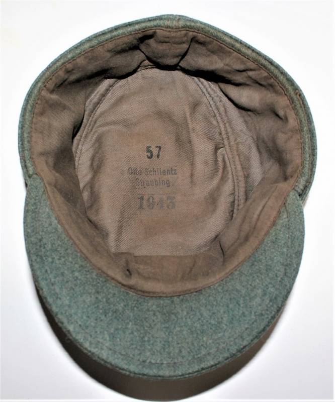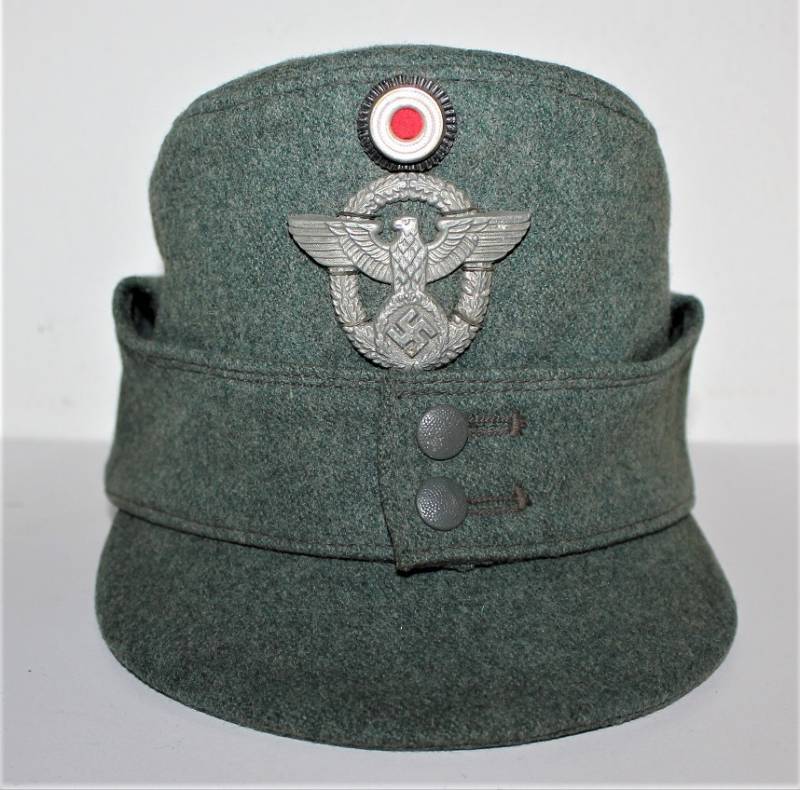 Berretto M43 da Truppa della Polizia in ottime condizioni, usato pochissimo, non restaurato o riparato, completo in ogni sua parte, senza buchi o strappi, cuciture perfette, fregi montati in epoca, marcato internamente con nome del fabbricante, data 1943 e taglia 57. Original 100% WWII periodo.