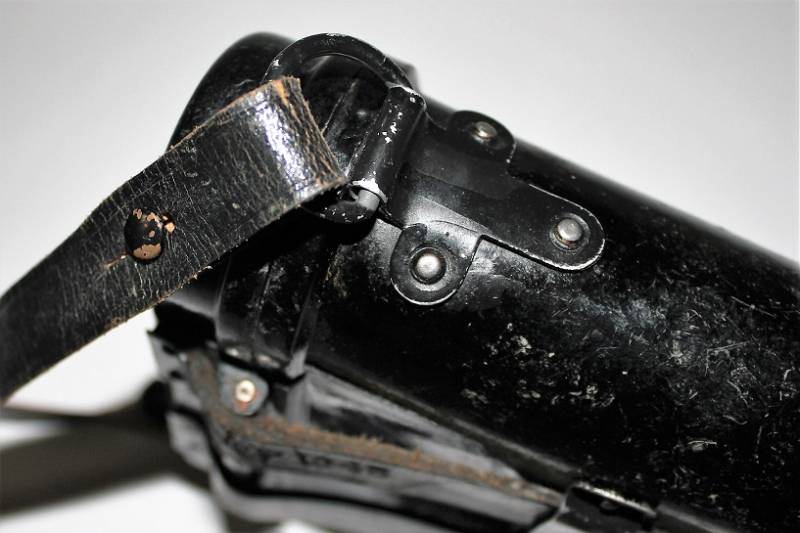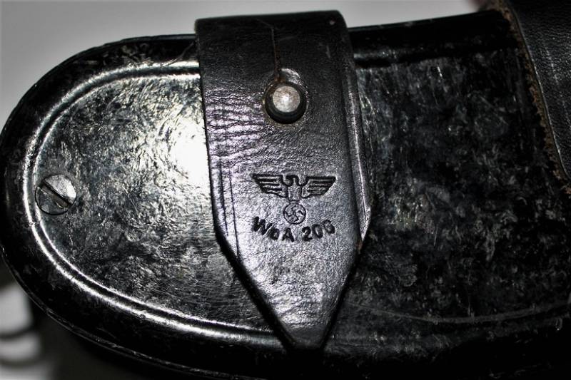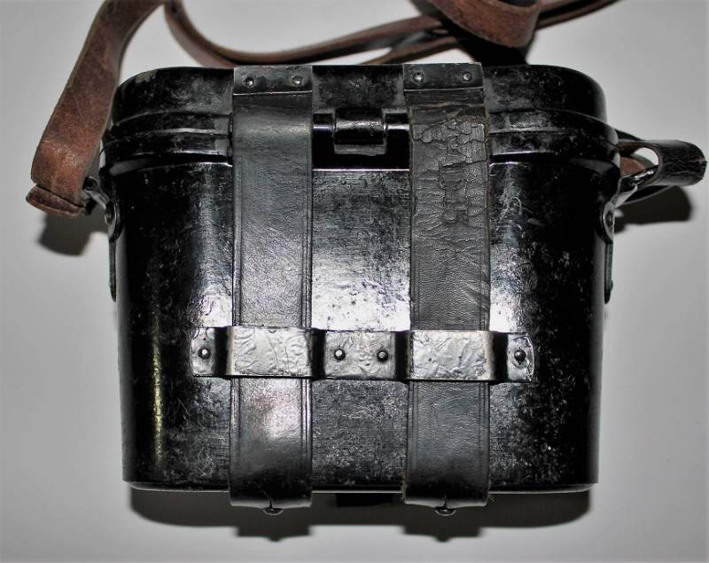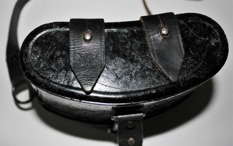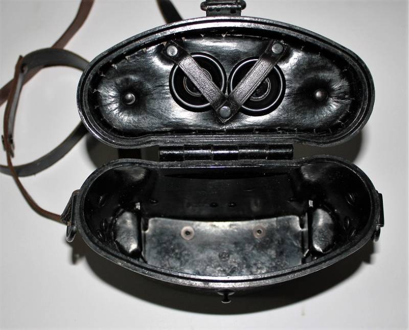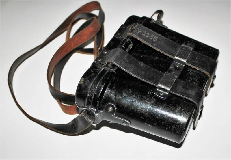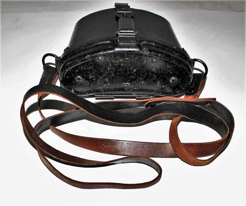 Contenitore in bakelite per binocolo 6x30, di colore nero, completo di passanti in cuoio neri, tracolla e numero due lenti a filtro per oculari, il tutto in ottime condizioni, con leggerissimi segni del tempo e uso, marcato con codice fabbricante e waffenamt sul passante in cuoio. Originale 100% WWII periodo.