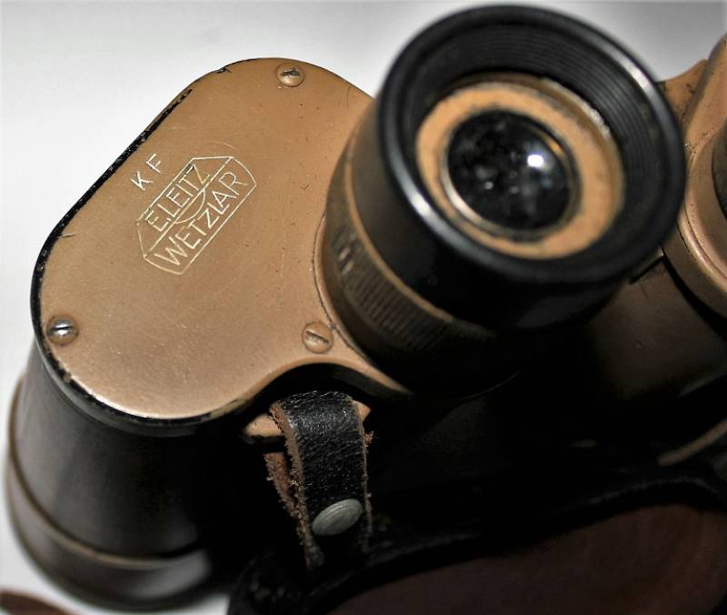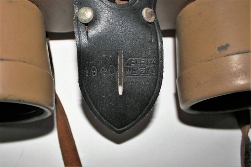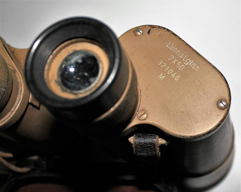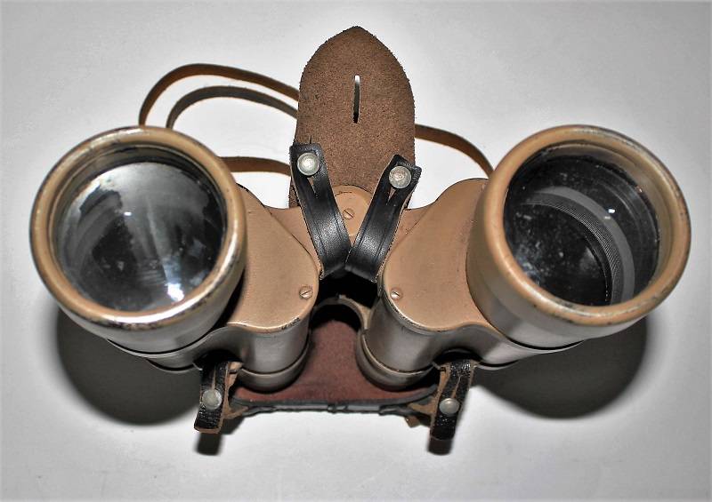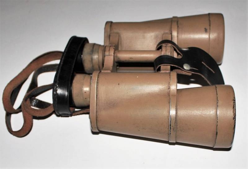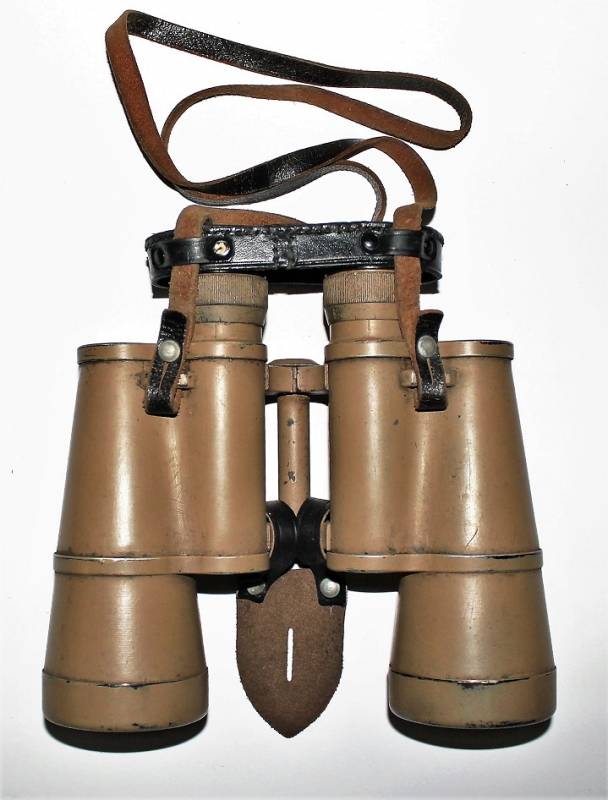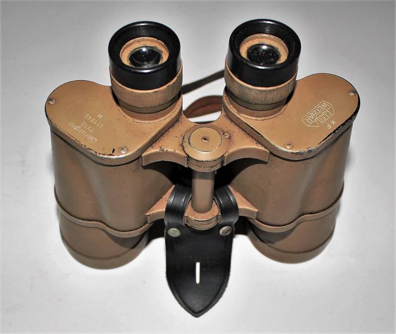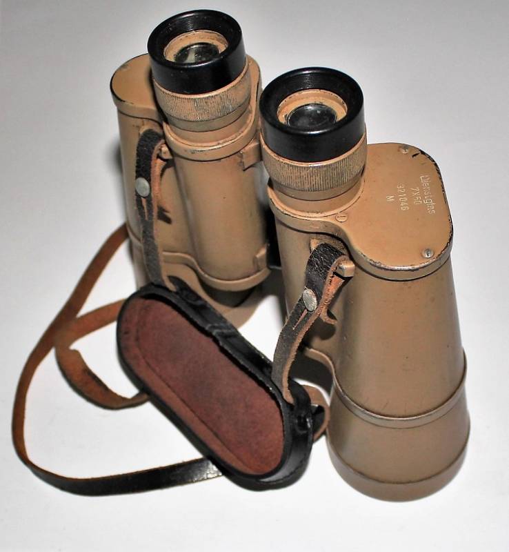 Binocolo in colorazione gialla tropicale 7x50 completo di accessori, condizioni buone con patina del tempo e dell´uso, ma la colorazione camo č al 90%. Visuale buona, leggermente opacizzata, un oculare č bloccato, nato senza reticolo. Gli accessori in pelle, il paraoculare e la fettuccia per il bottone, sono delle perfette riproduzioni indistinguibili dagli originali, marcati correttamente.