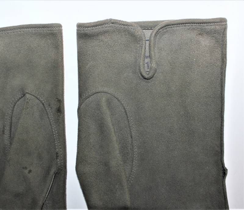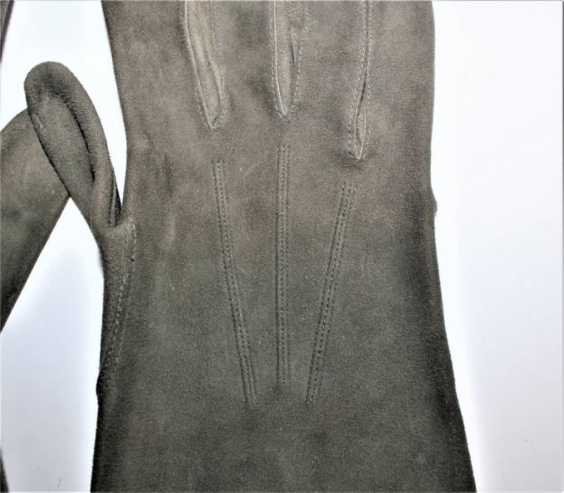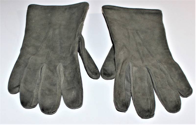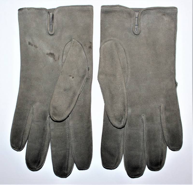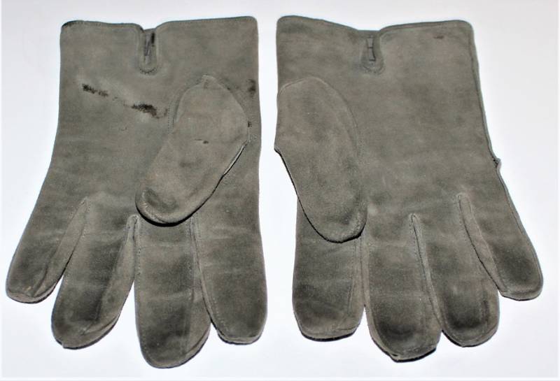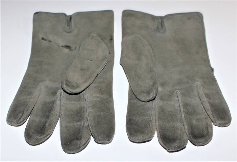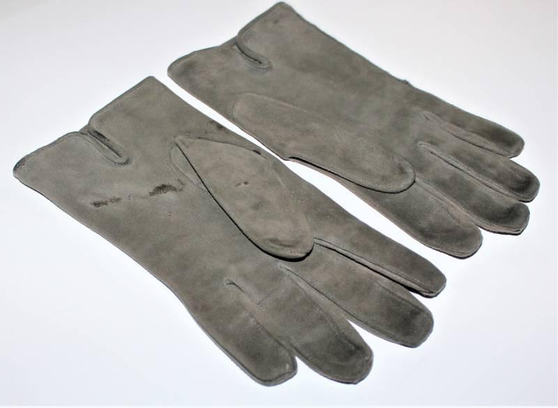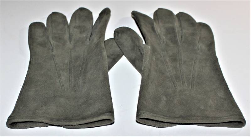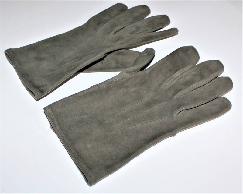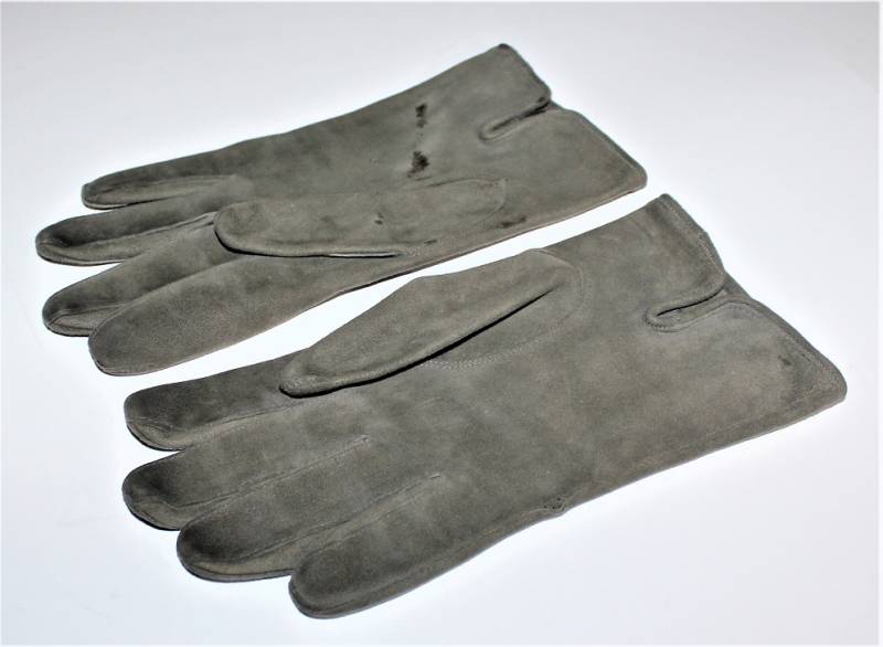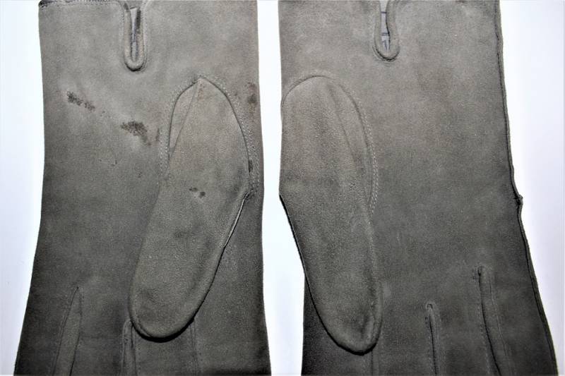 Guanti in pelle scamosciata color grigio in dotazione agli Ufficiali WH-LW-SS, condizioni ottime quasi pari al nuovo senza buchi o strappi, cuciture ottime, taglia medio piccola, marcati internamente con numero taglia (8). Molto rari. Originale 100% WWII periodo.