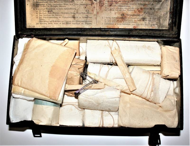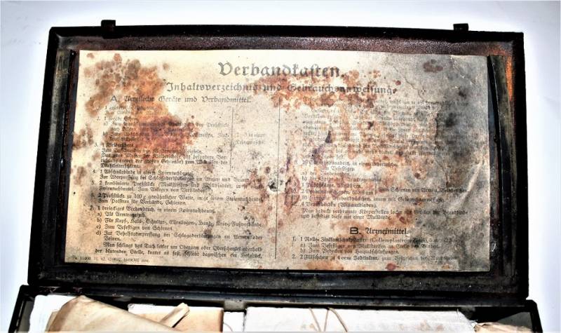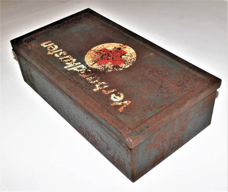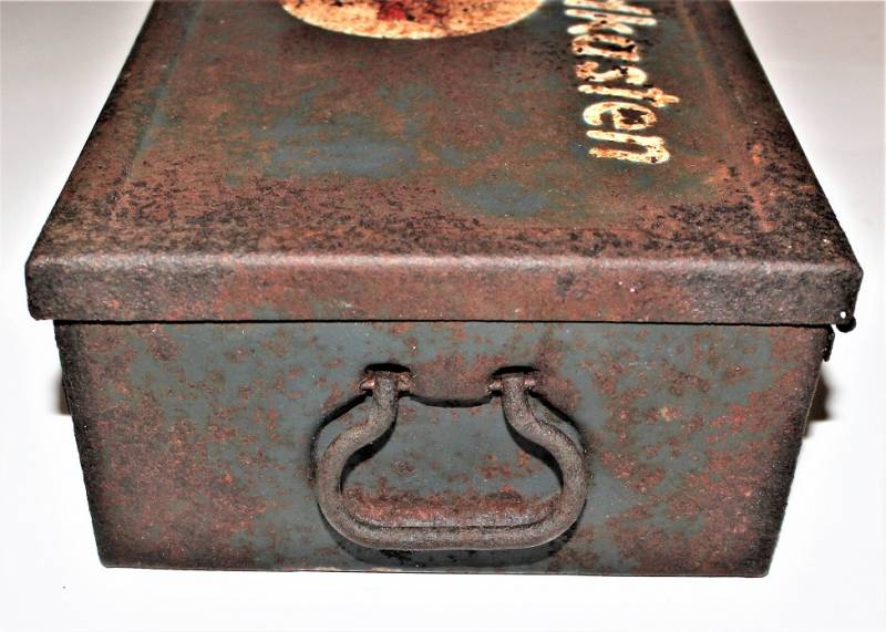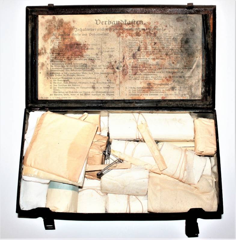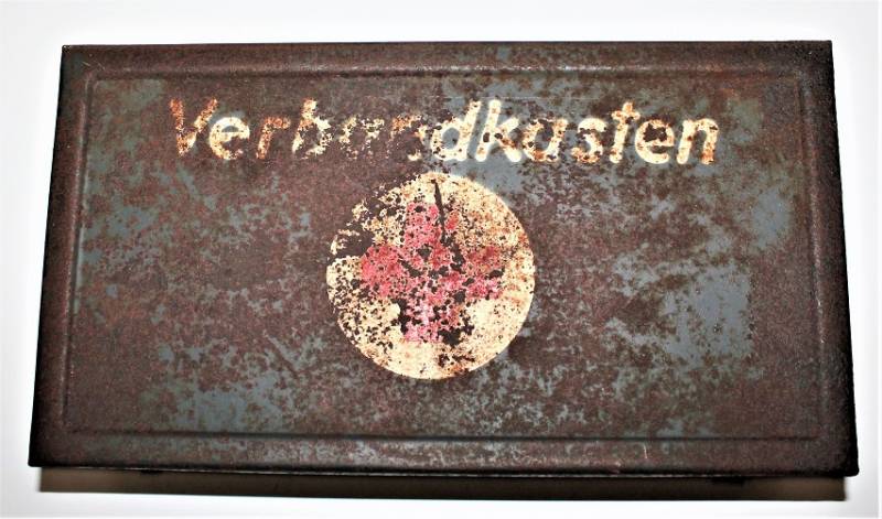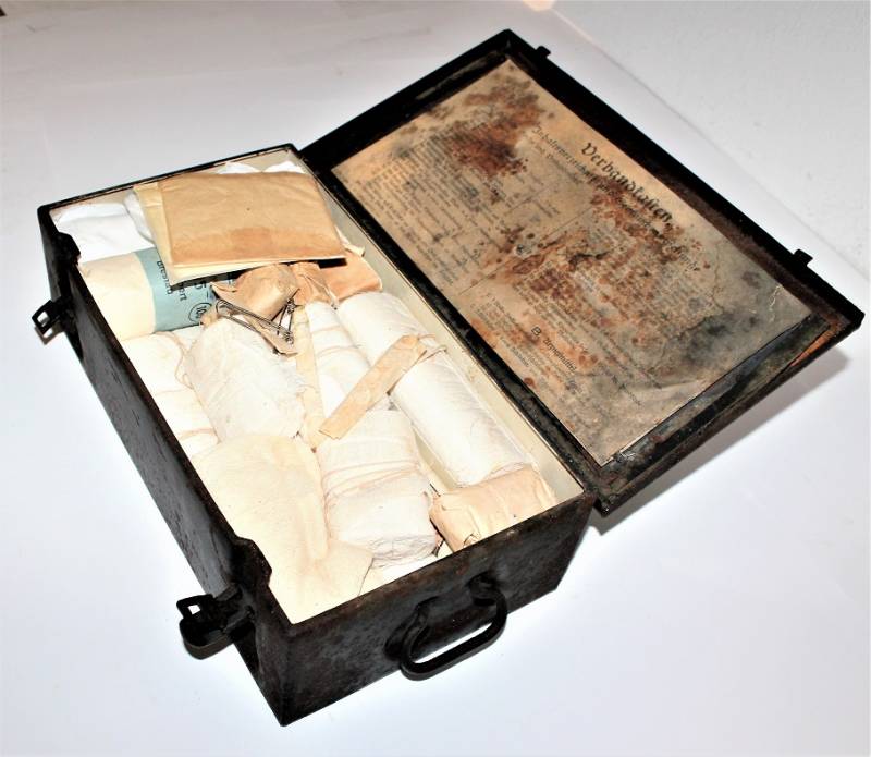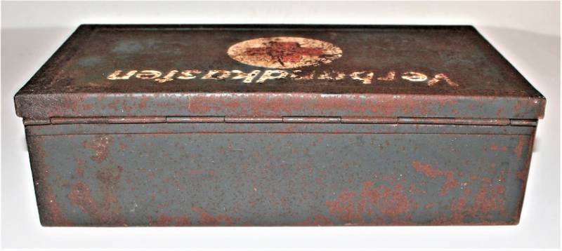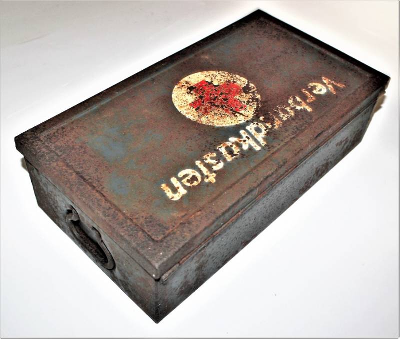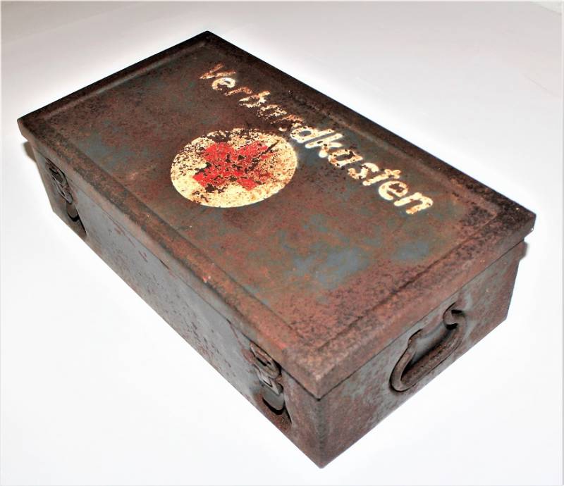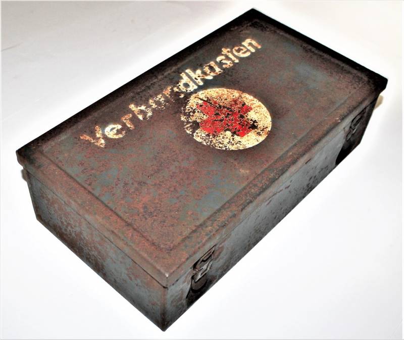 Cassetta di metallo VERBANDSKASTEN mod.1930 in colorazione blu Luftwaffe in buone condizioni, con vernice al 60% con patina del tempo e dellŽuso, coperchio parzialmente con ruggine, completa in ogni sua parte, non riparata o restaurata, con allŽinterno tutti gli accessori necessari per il 1°intervento medico (come da foto). Originale 100% WWII periodo.