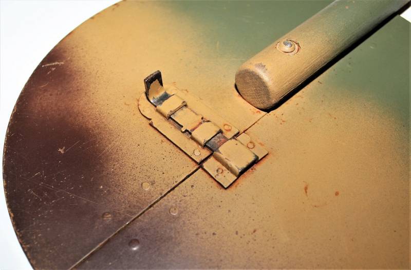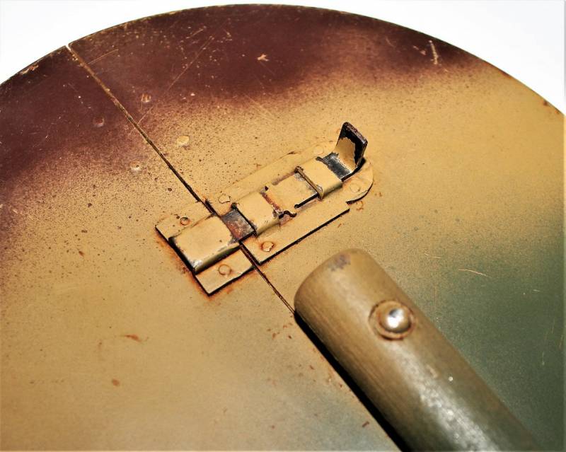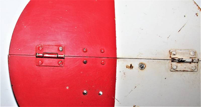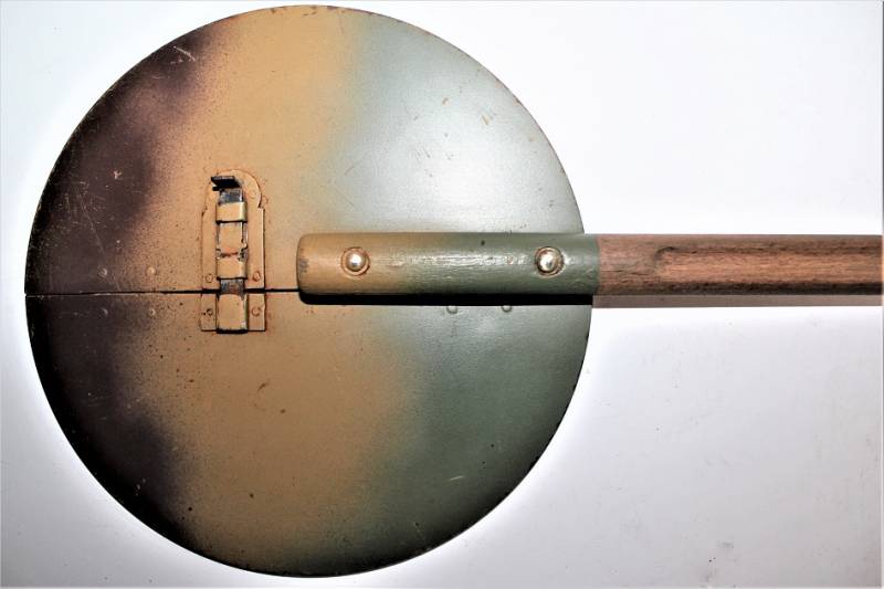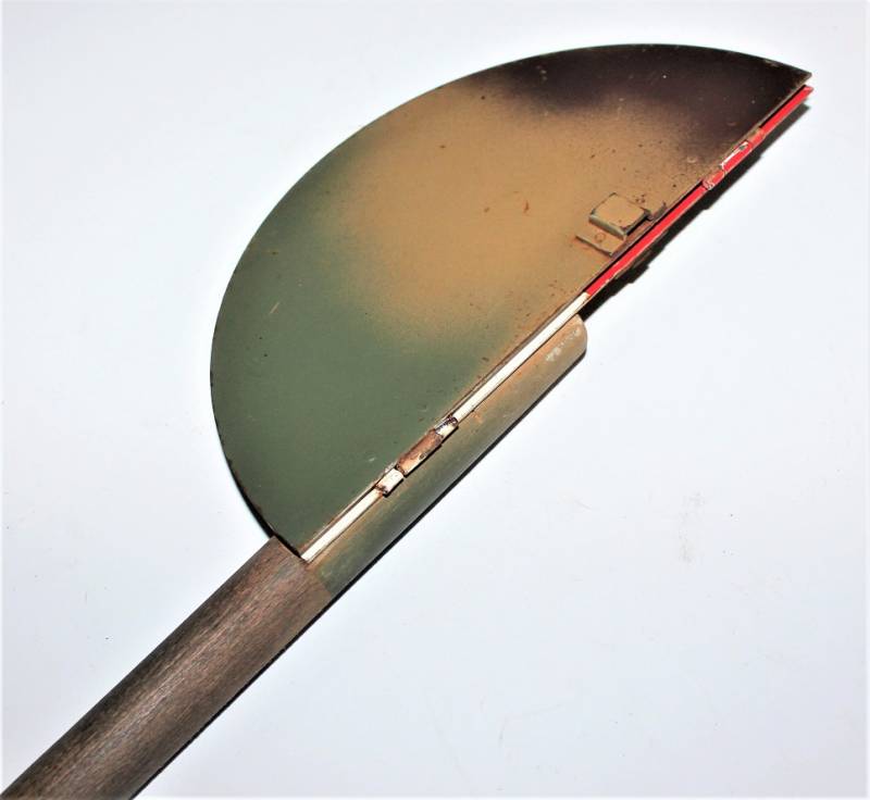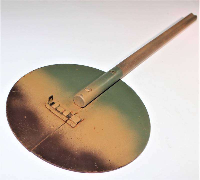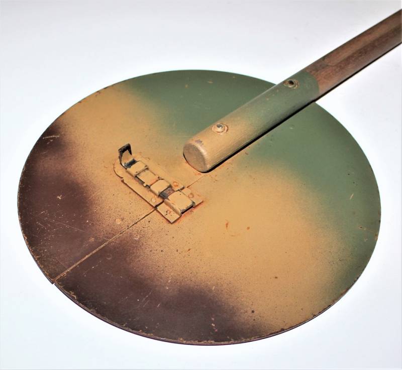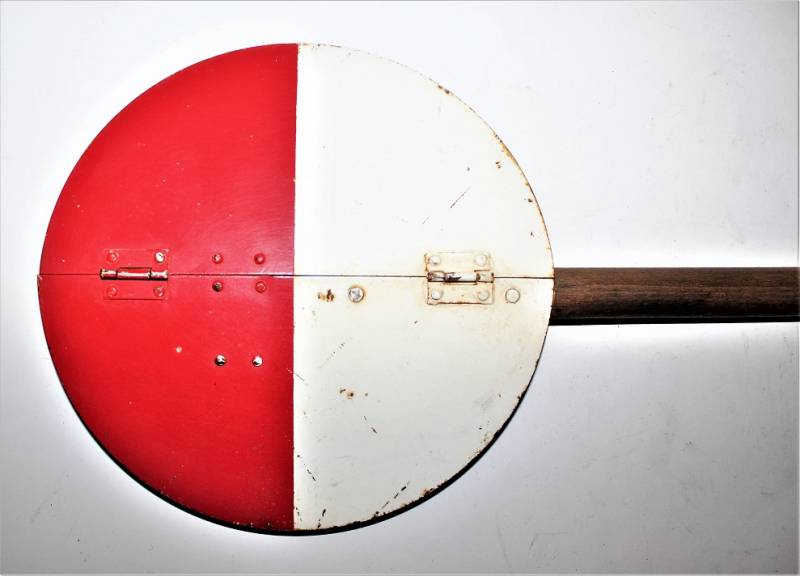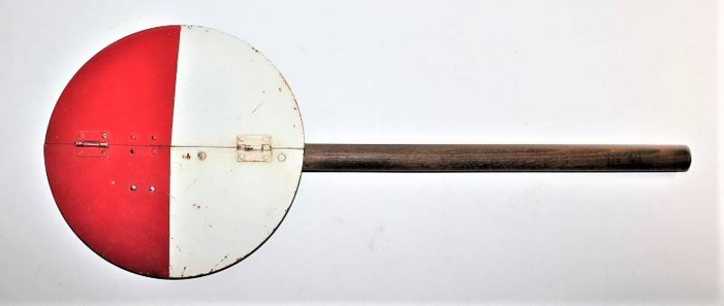 Paletta di segnalazione e comunicazione Artiglieria della WH modello incernierato pieghevole in buone condizioni, non restaurata o riparata, ma con patina del tempo e dellŽuso, nei colori regolamentari rosso e bianco e lato interno mimetico tre colori, impugnatura in legno rivettata sulla paletta, sullŽimpugnatura sŽintravede il waffenamt.