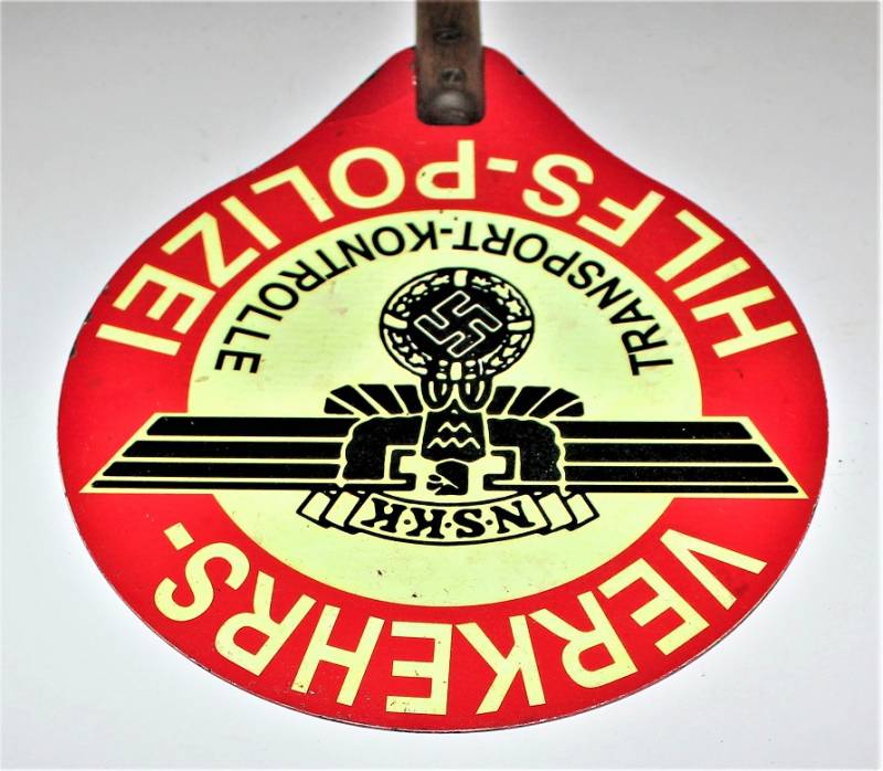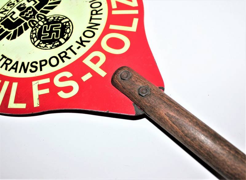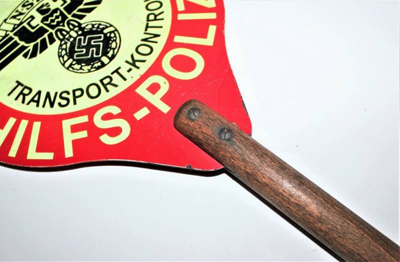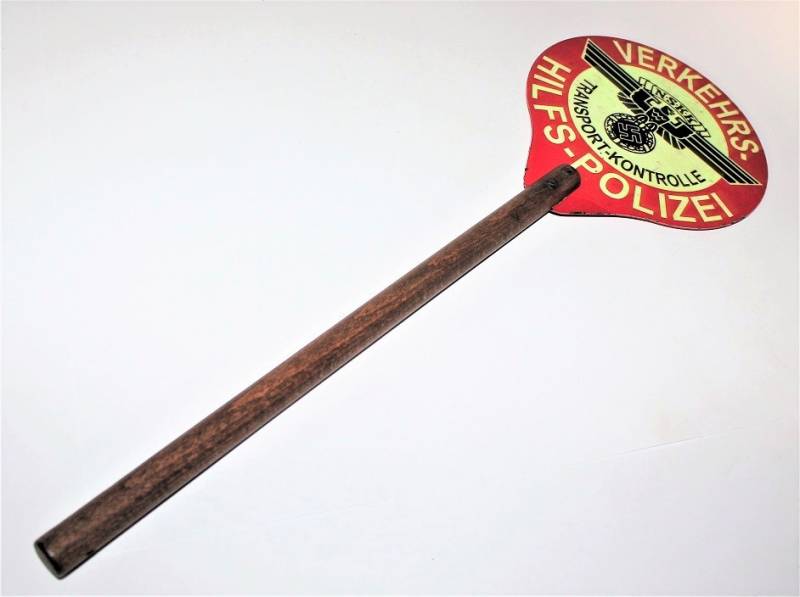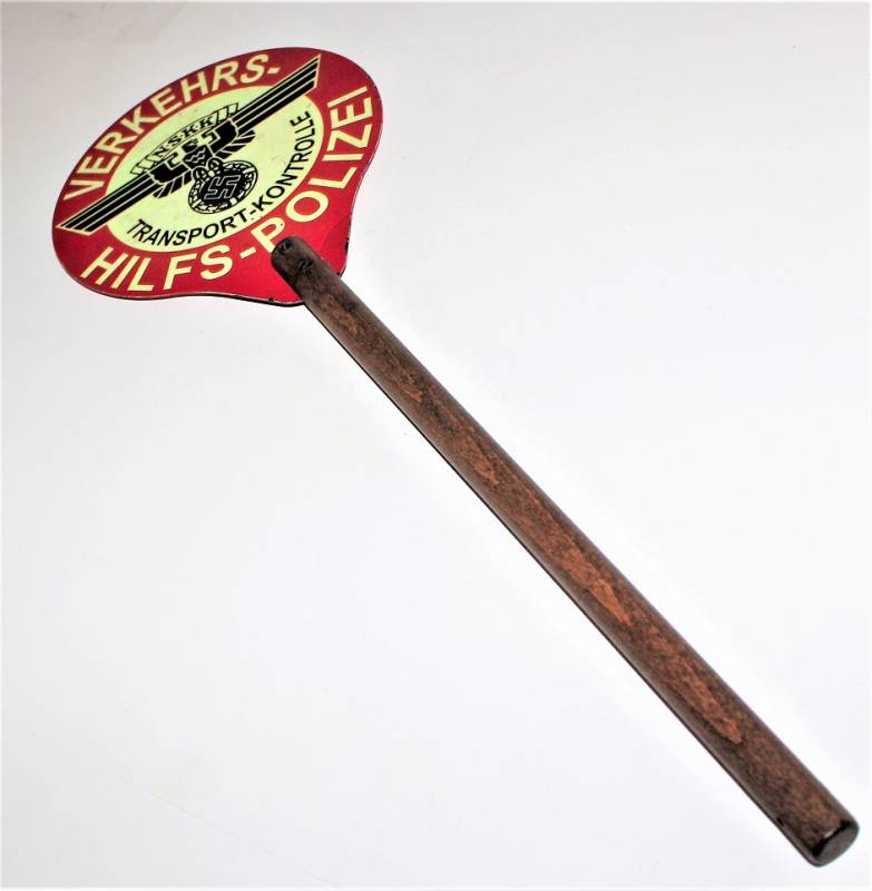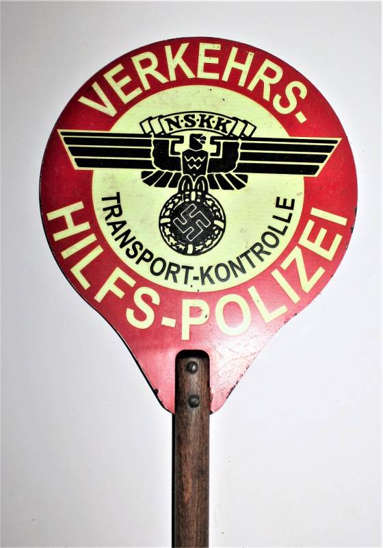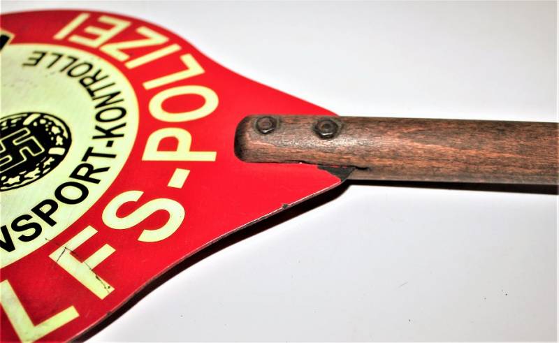 Rara e bella paletta di controllo traffico NSKK Polizia in ottime condizioni solo con leggeri segni del tempo e dellŽuso, non restaurata o riparata e completa in tutte le sue parti, colori e scritte perfettamente leggibili e ben conservate, impugnatura in legno in perfette condizioni. Originale 100% WWII periodo.