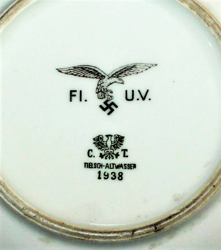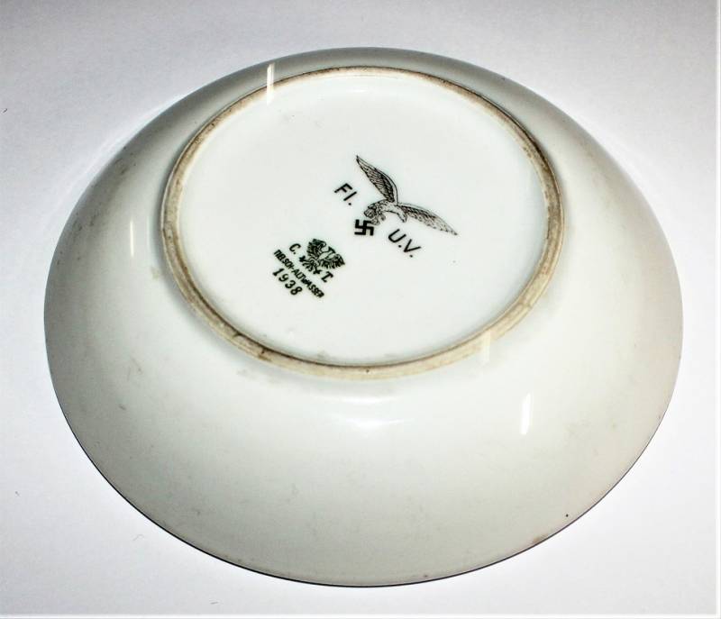 Piattino in porcellana della Luftwaffe in ottime condizioni senza scheggiature, marcato con fabbricante e data 1938.