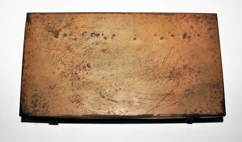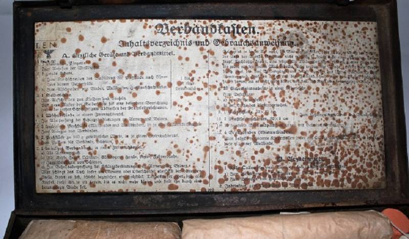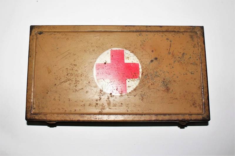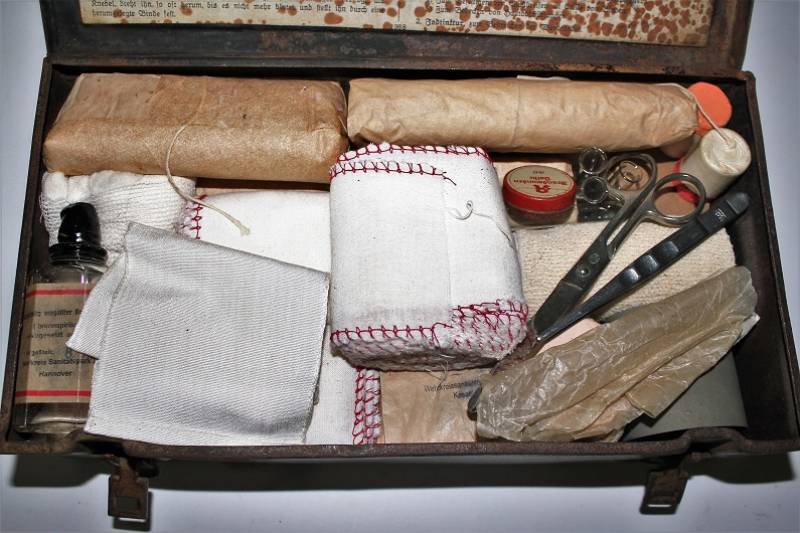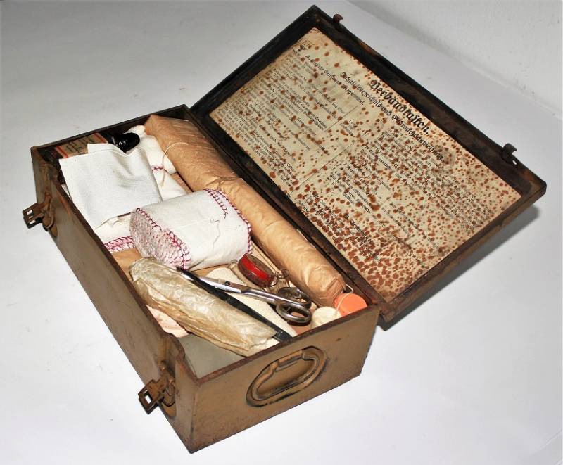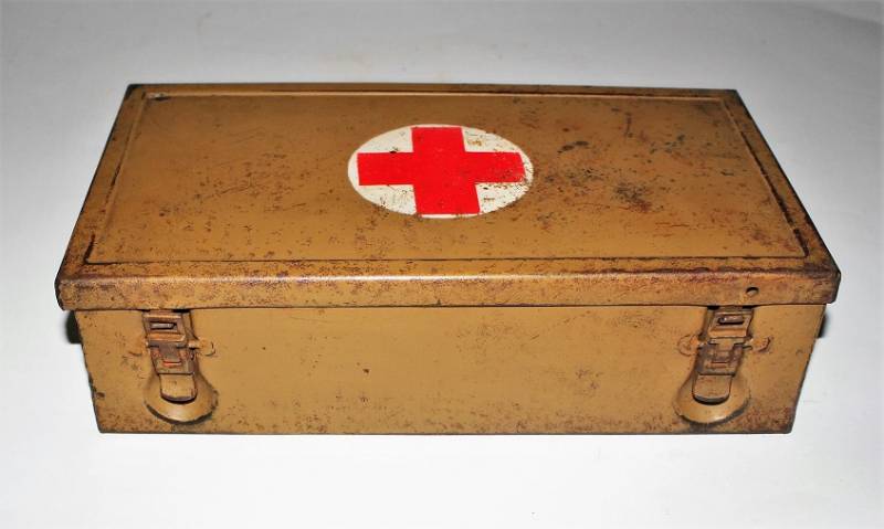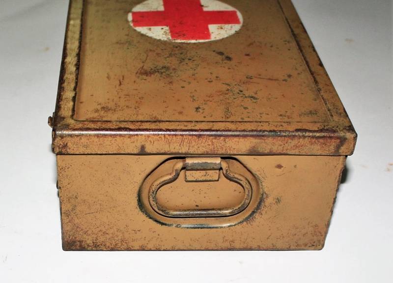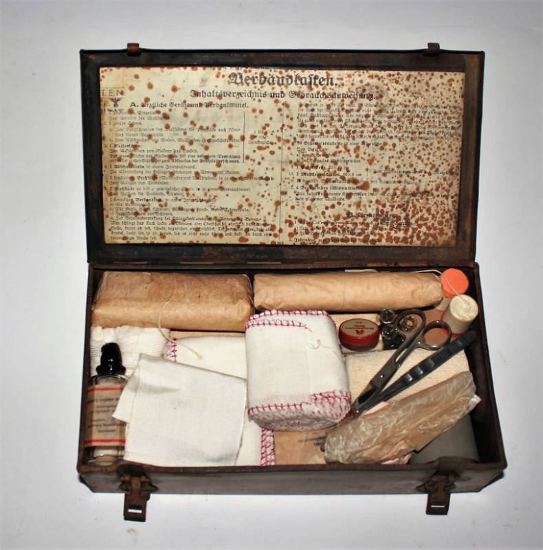 Cassetta di metallo VERBANDSKASTEN mod.1930 in colorazione mimetica gialla fronte del Sud in buone condizioni, con vernice al 90%, leggera patina del tempo e dellŽuso, completa in ogni sua parte, non riparata o restaurata, con allŽinterno tutti gli accessori necessari per il 1°intervento medico (come da foto). Originale 100% WWII periodo.