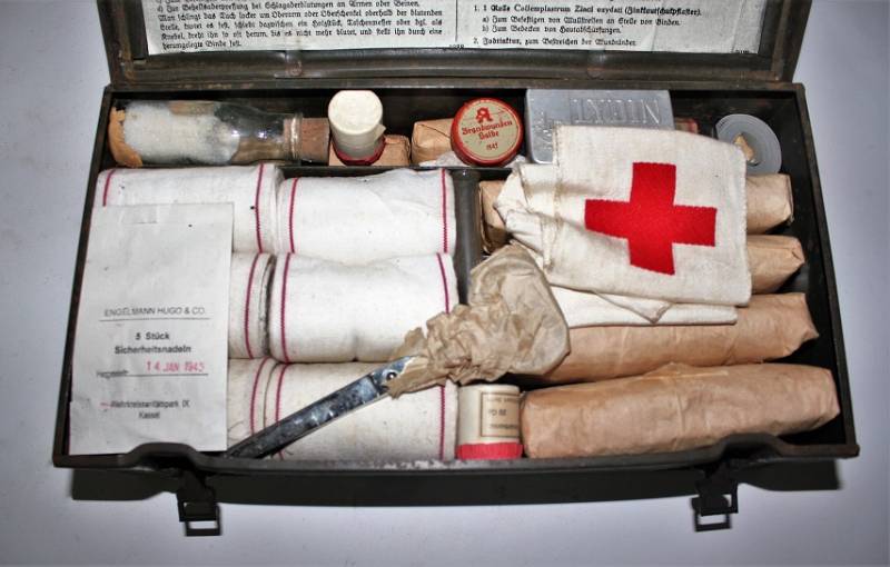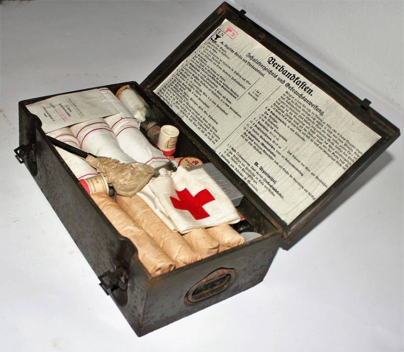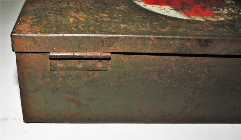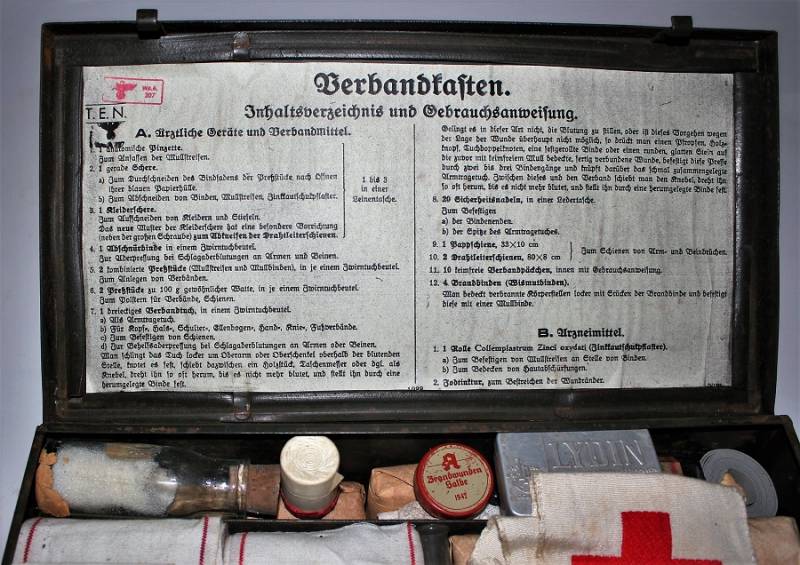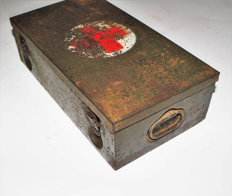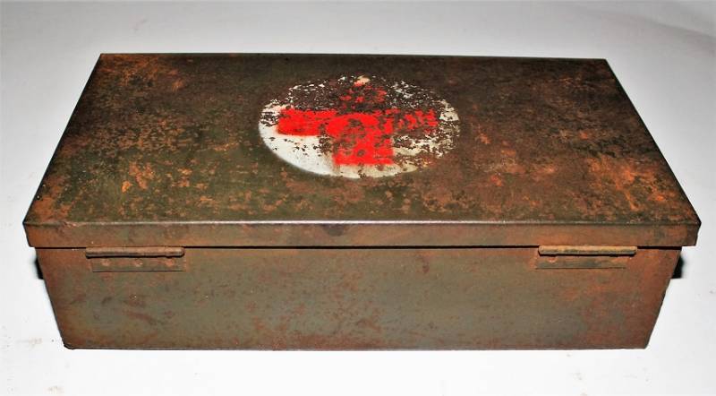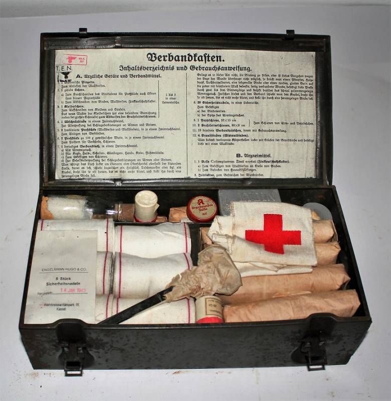 Cassetta di metallo VERBANDSKASTEN mod.1930 in colorazione verde felgrau in buone condizioni, con vernice al 70%, patina del tempo e dellŽuso, completa in ogni sua parte, non riparata o restaurata, con allŽinterno tutti gli accessori necessari per il 1°intervento medico (come da foto). Originale 100% WWII periodo.