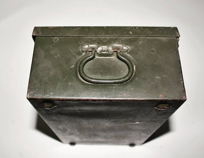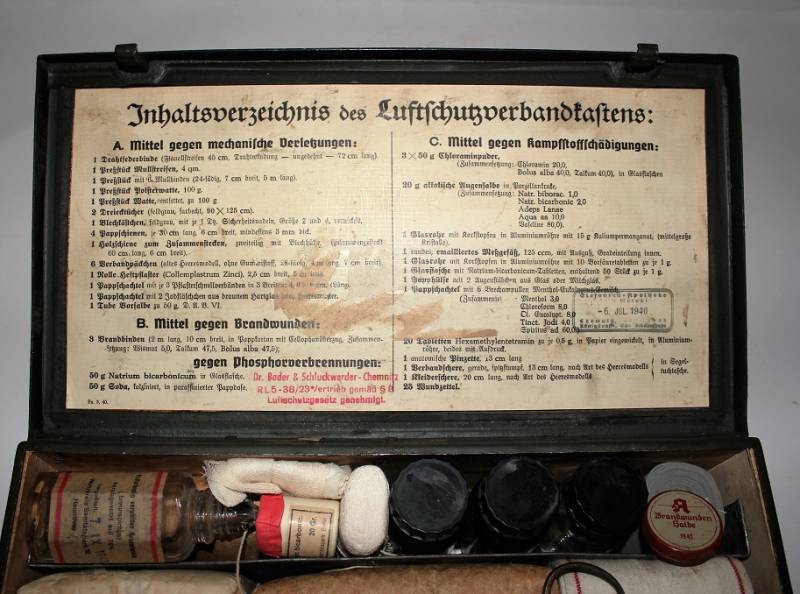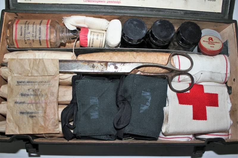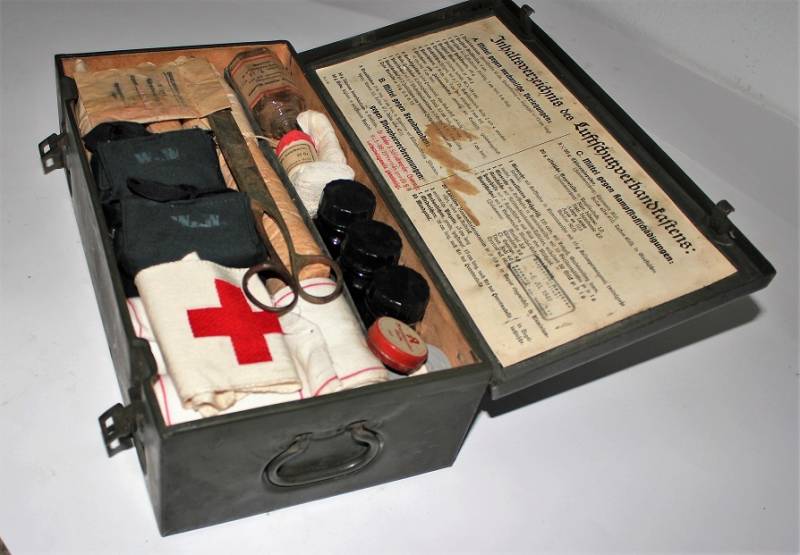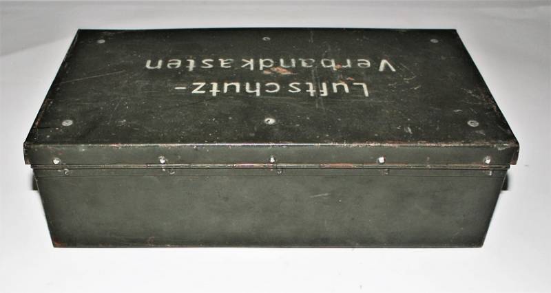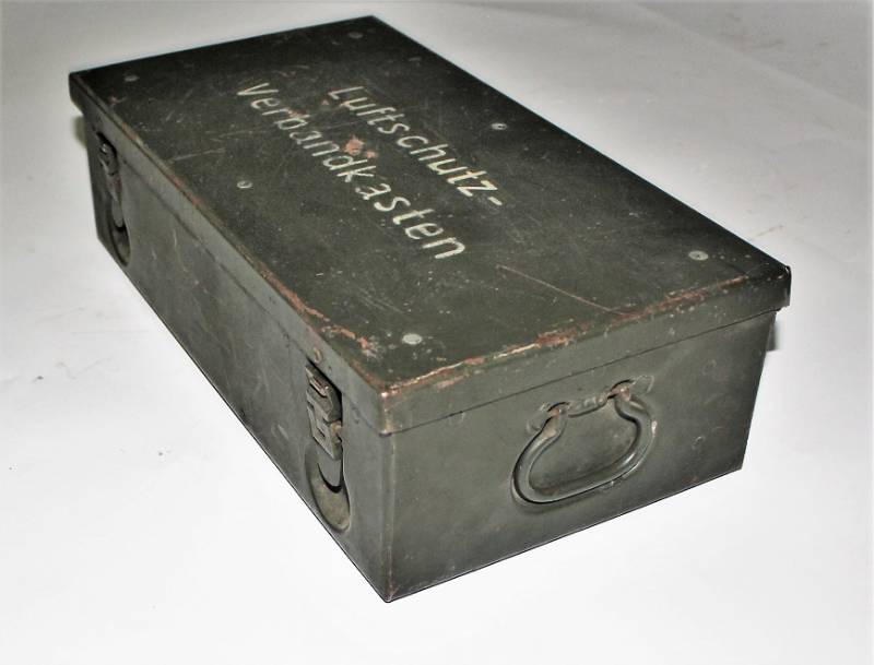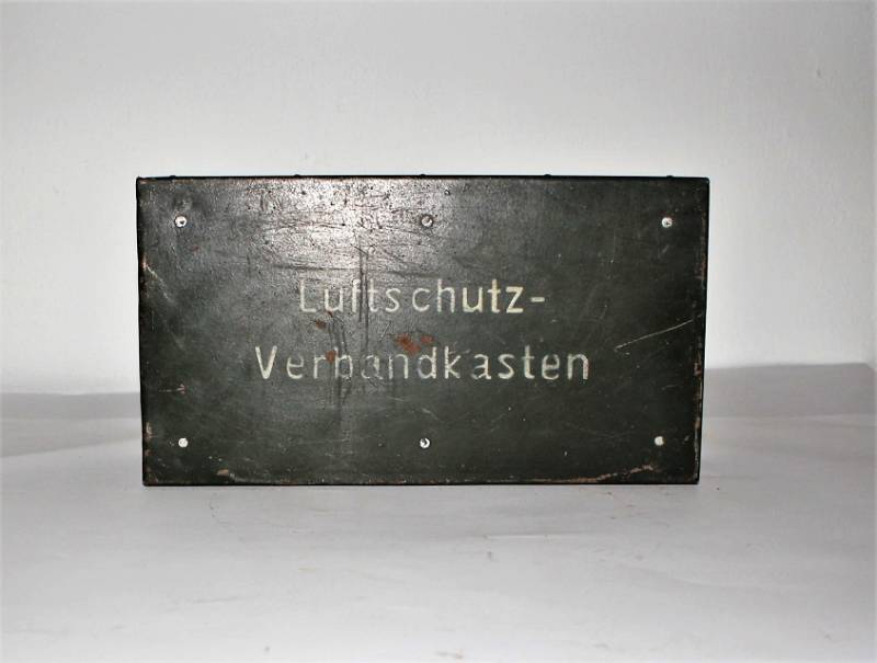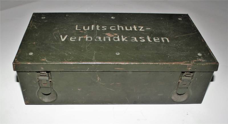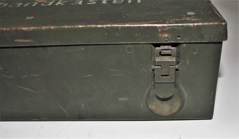 Cassetta di metallo VERBANDSKASTEN mod.1930 in colorazione verde felgrau in buone condizioni, con vernice allŽ85%, patina del tempo e dellŽuso, completa in ogni sua parte, non riparata o restaurata, con allŽinterno tutti gli accessori necessari per il 1°intervento medico (come da foto). Originale 100% WWII periodo.