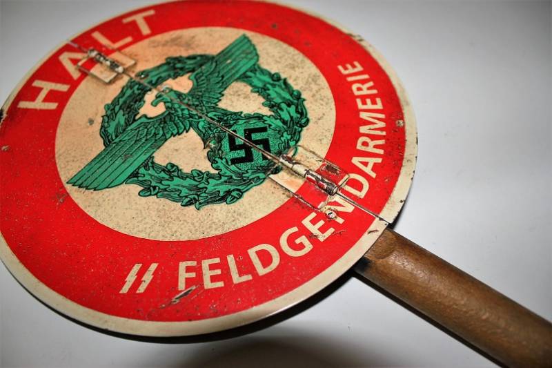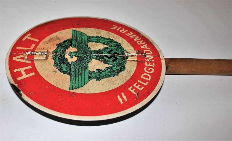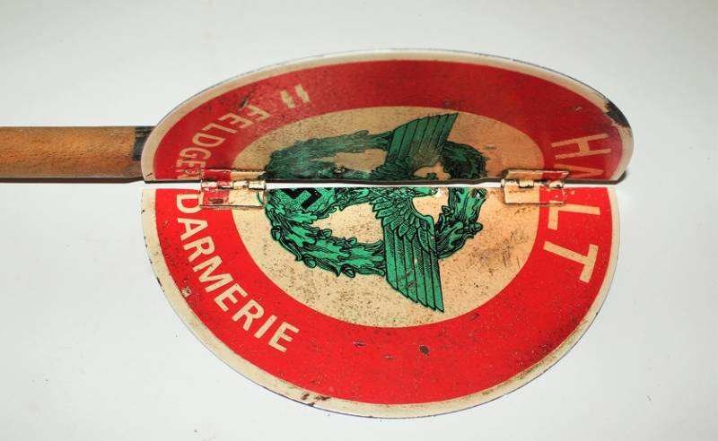 Paletta controllo traffico della "Feldgendarmeria W.SS", in ottime condizioni al 95% di conservazione e colorazione, lŽimmagine "halt, SS Feldgendarmeria e aquila" sono stampate in maniera corretta su base di metallo su entrambe le parti, modello incernierato divisibile per facilitarne il trasporto, leggera patina di usura e del tempo. Oggetto molto raro. Originale 100% WWII periodo.