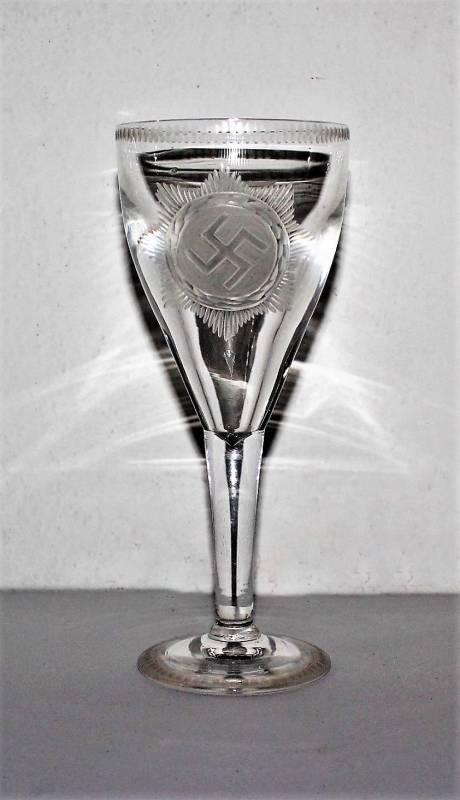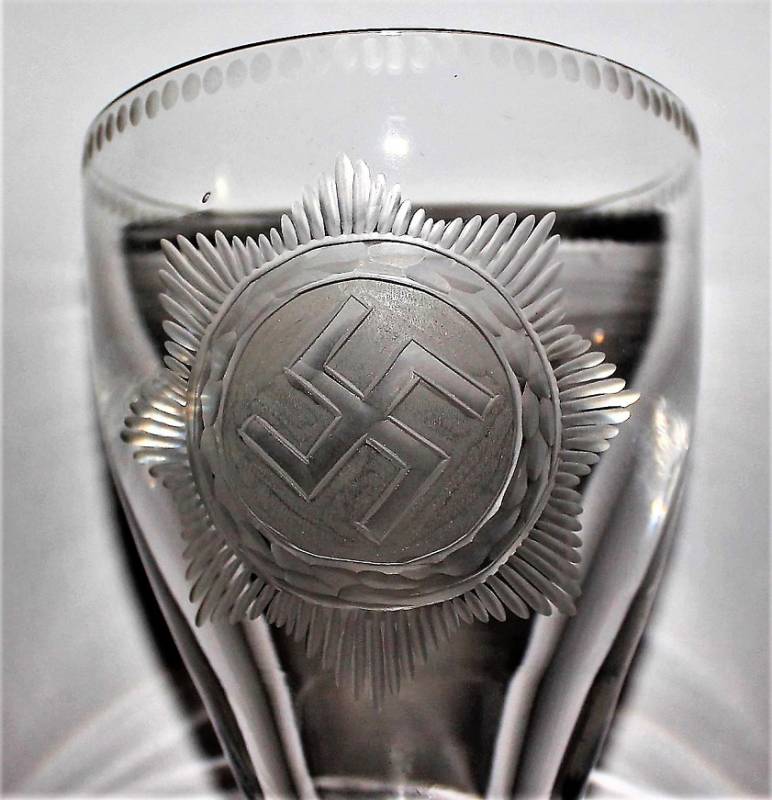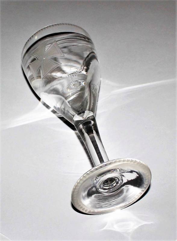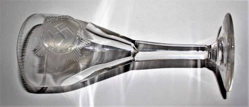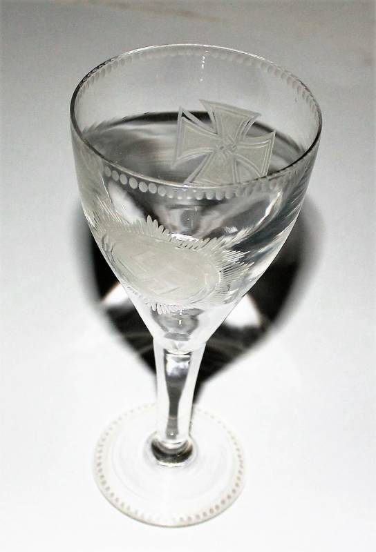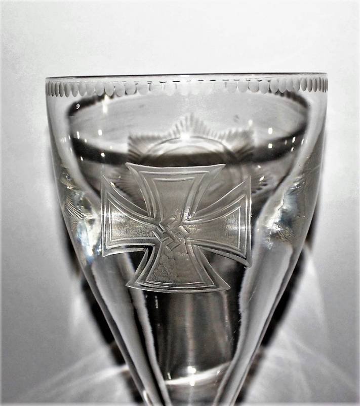 Calice in cristallo commemorativo con croce di ferro e croce di Germania incise a molatura satinata sulla coppa, condizioni perfette. Originale 100% WWII periodo.