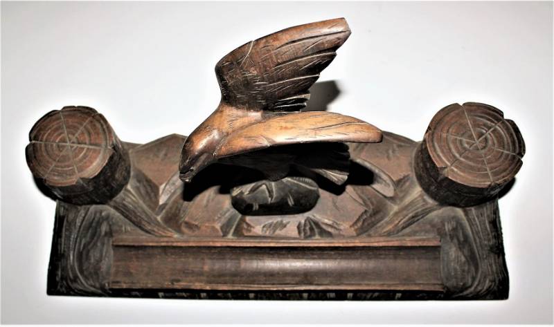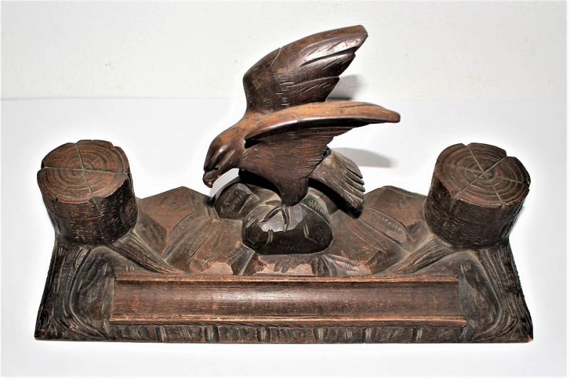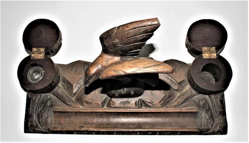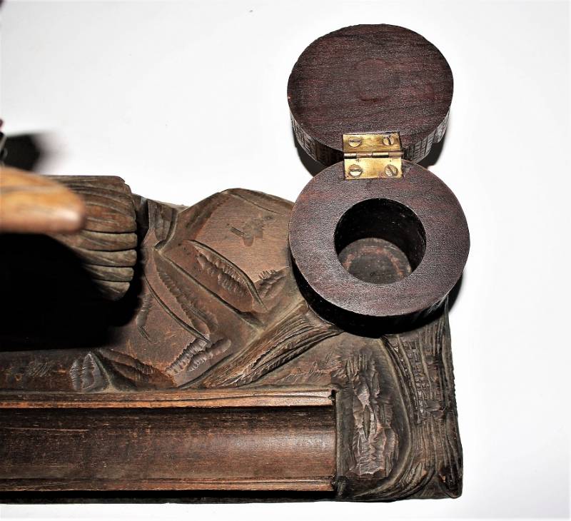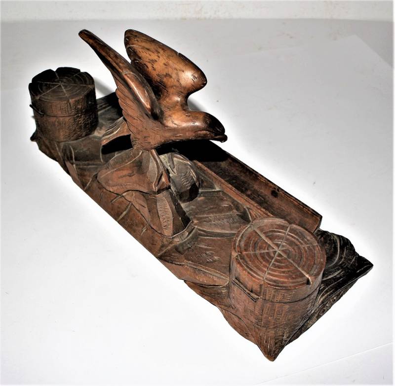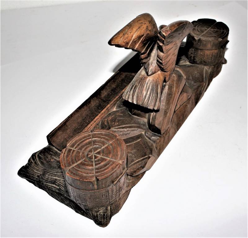 Calamaio da scrivania in legno lavorato a mano in ottime condizioni, non restaurato o riparato, mancante di un contenitore di inchiostro in vetro. Dimensioni 40x15 H19. Originale 100% WWII periodo.