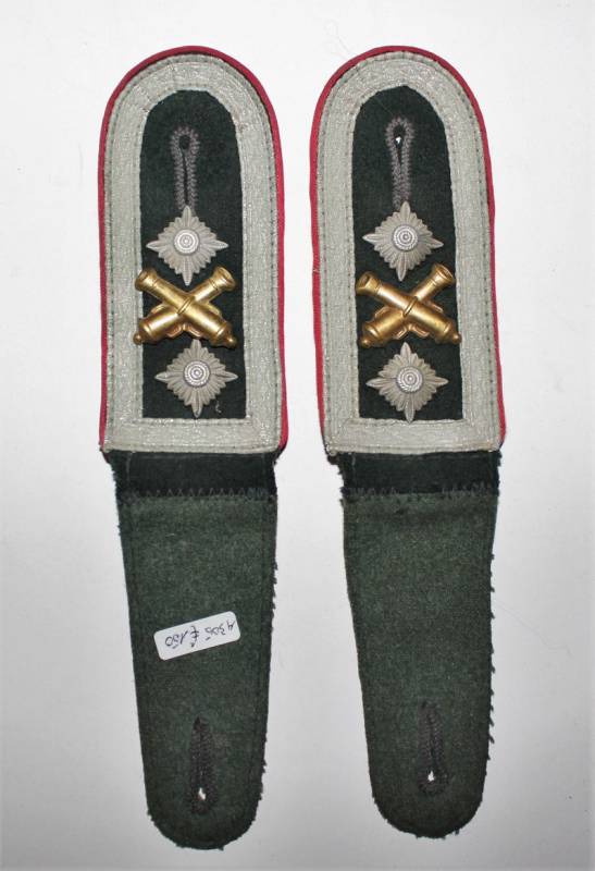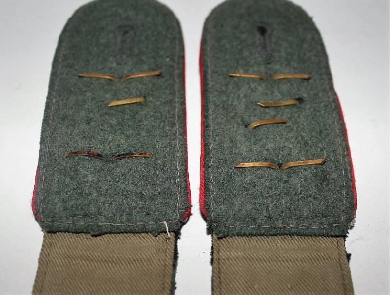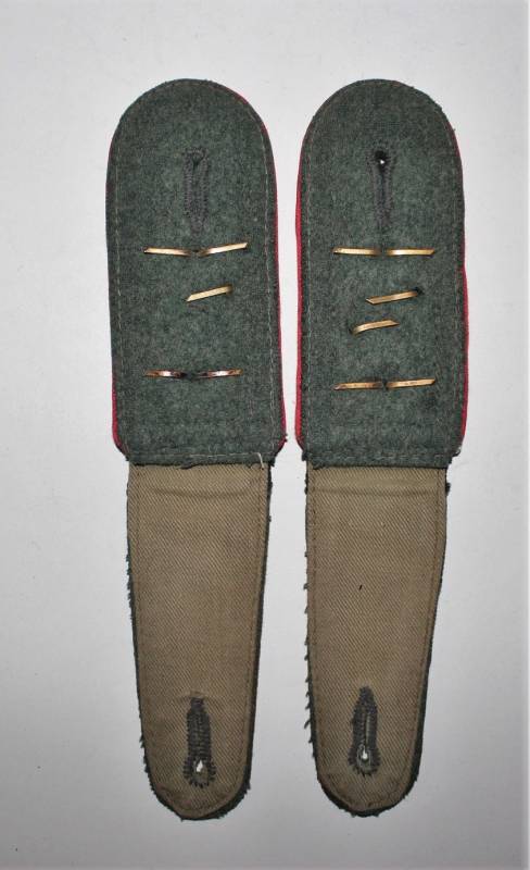 Spalline sottufficiale della WH mod.36, waffenfarbe rosso reparti artiglieria, complete di monogrammi, condizioni ottime, leggera patina del tempo e dellŽuso (unŽastina del monogramma è mancante). Originale 100% WWII periodo.