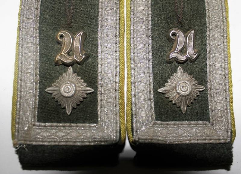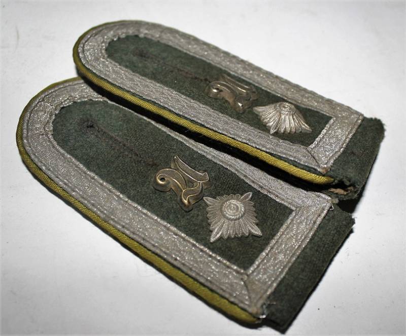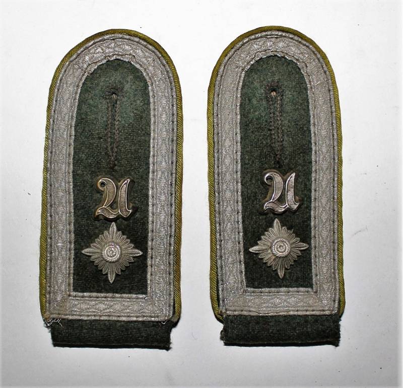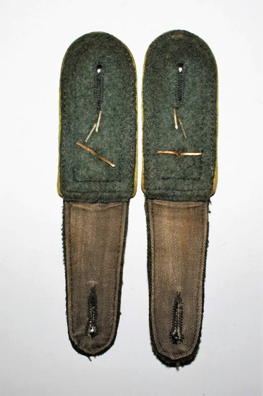 Spalline da sottufficiale WH mod.40 con waffenfarbe verde chiaro per reparti Panzer Grenadier, condizioni ottime quasi pari al nuovo, leggerissima usura, complete di monogrammi. Originale 100% WWII periodo.