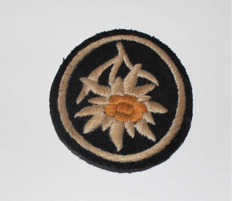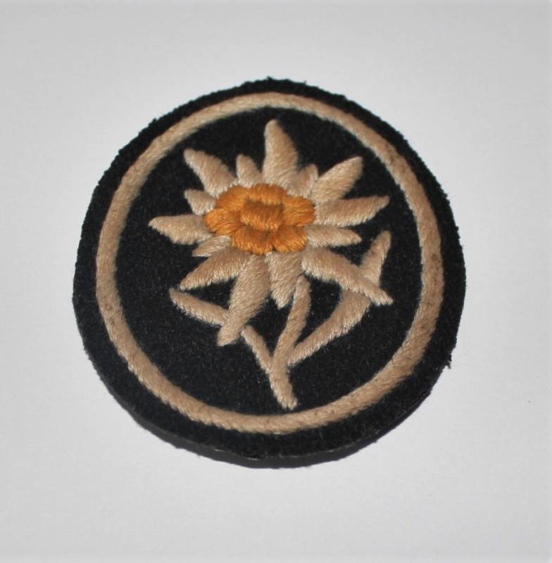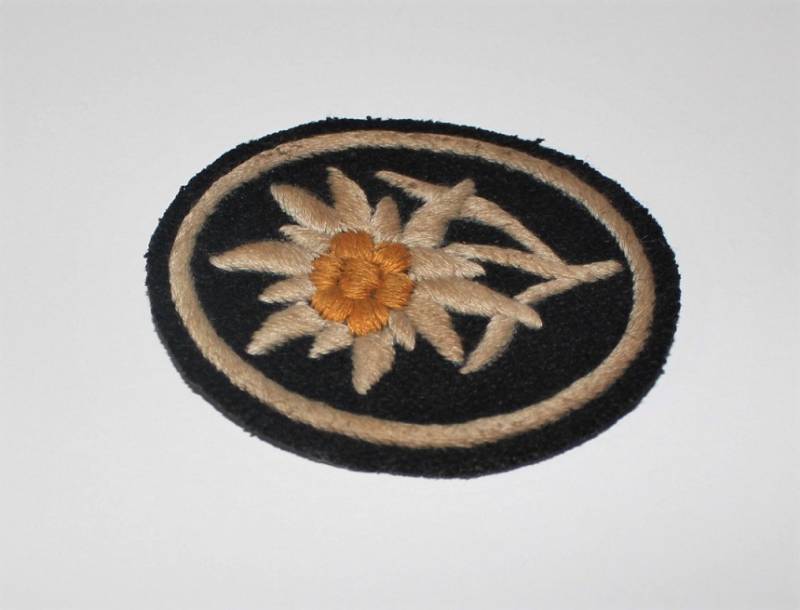 Edelweiss W.SS da giacca, disegno ricamato in filo di cotone bianco, su fondo nero, condizioni ottime, solo patina del tempo, mai montato su giacca, sul retro cartellino di accettazione "RZM SS". Originale 100% WWII periodo.