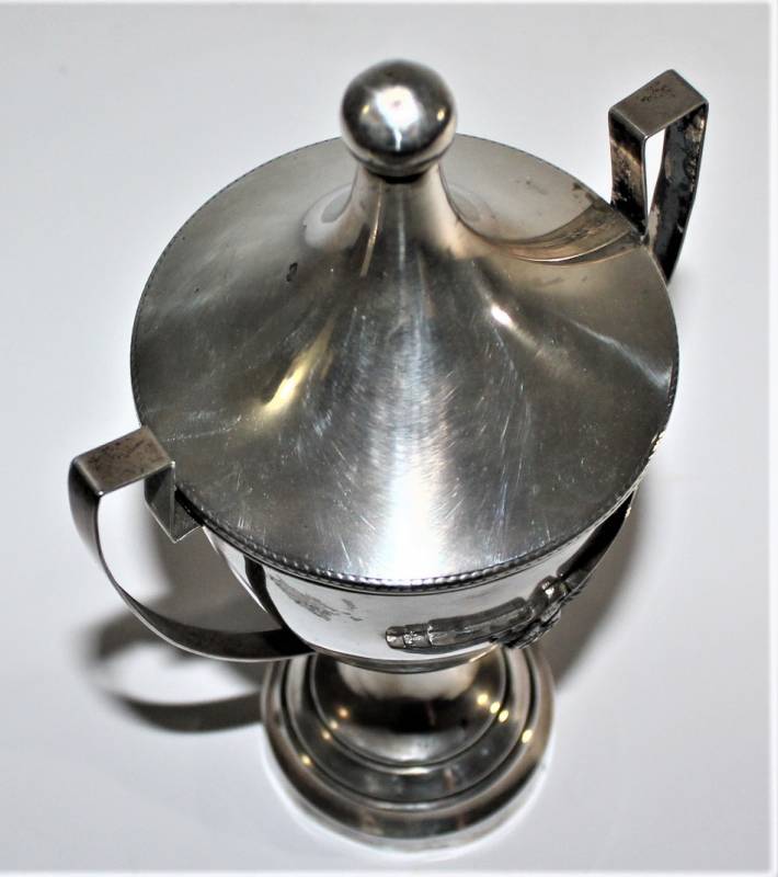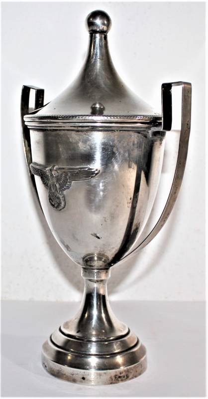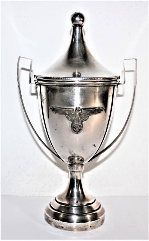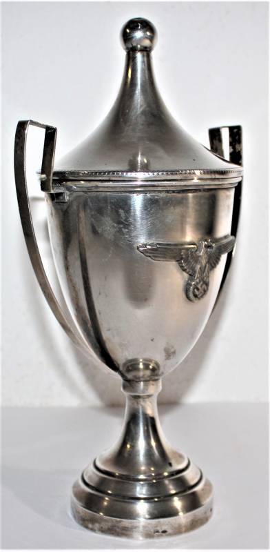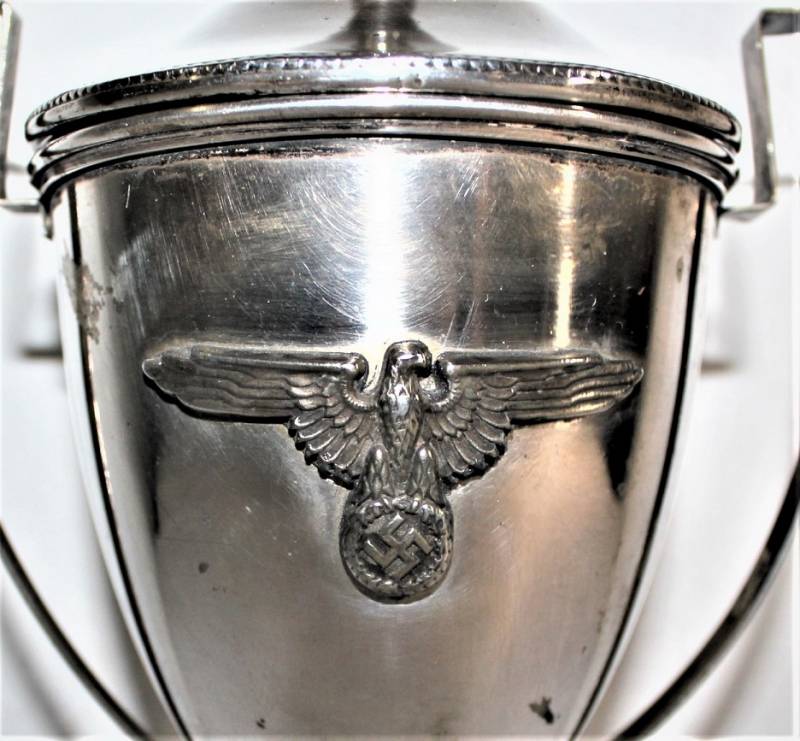 Bellissima coppa in argento per avvenimento sportivo conferimento per SS, ottime condizioni, con leggera patina del tempo e dellŽuso, nata in argento marcato 800, lŽaquila SS è saldata sulla coppa. Dimensioni cm 26x15. Originale 100% WWII periodo.