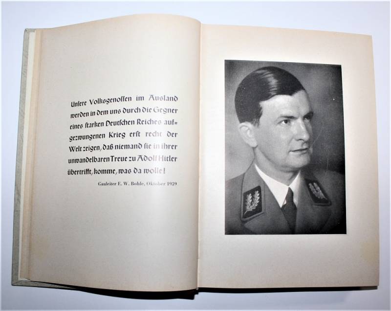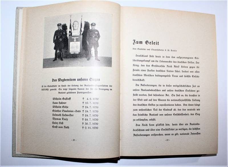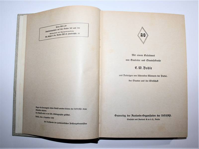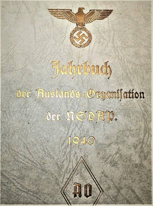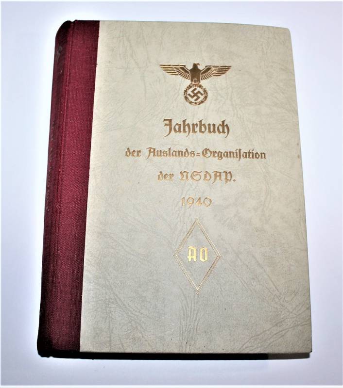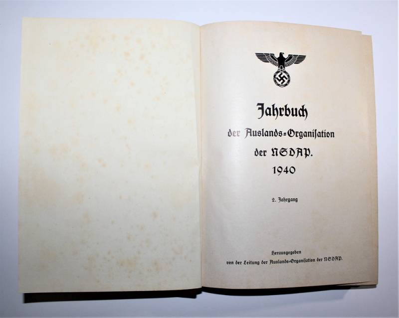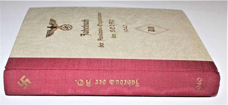 Bellissimo e raro libro dell´organizzazione N.S.D.A.P. edizione del 1940 in ottime condizioni, quasi pari al nuovo, leggera patina del tempo e dell´uso, ma completo in tutte le sue parti, riferito all´organizzazione e storia del Partito, con illustrazioni e descrizioni e anche varie pubblicitŕ dell´epoca, con un totale di 416 pagine, stupendo fronte copertina con titoli in oro. Originale 100% WWII periodo.