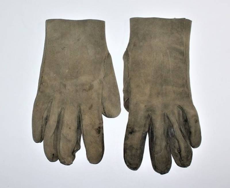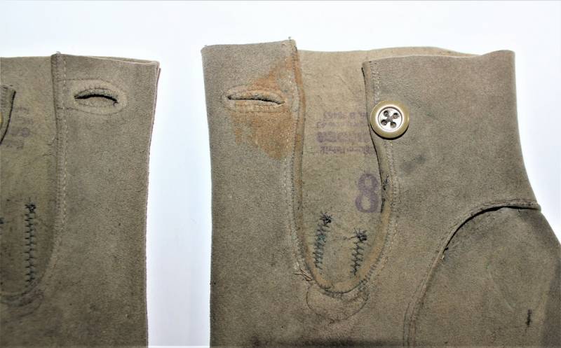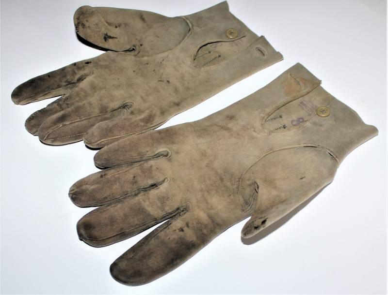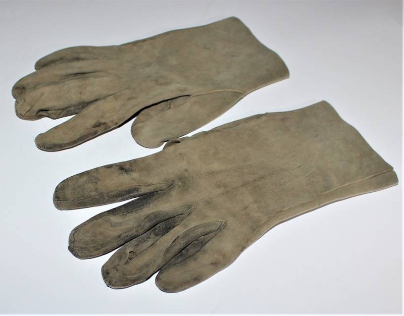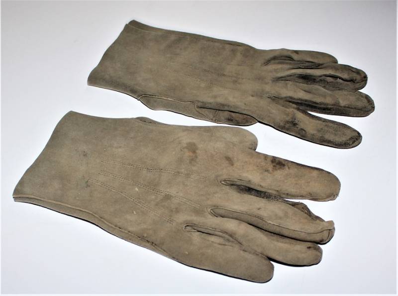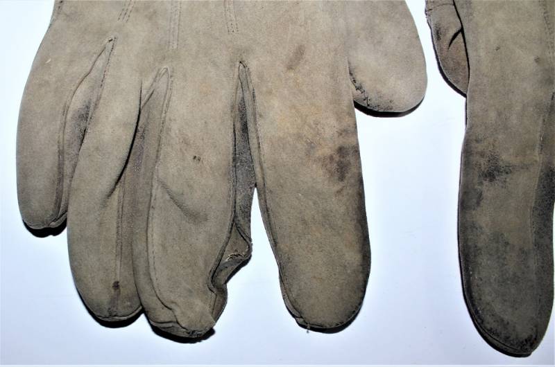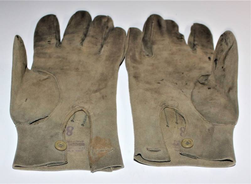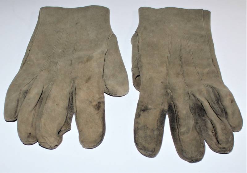 Guanti in pelle scamosciata color beige in dotazione agli Ufficiali WH-LW-SS, condizioni usate, due piccole scuciture sulle dita, taglia medio piccola, marcati internamente con nome fabbricante e numero taglia (8). Molto rari. Originale 100% WWII periodo.