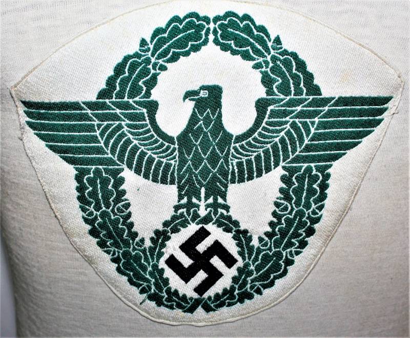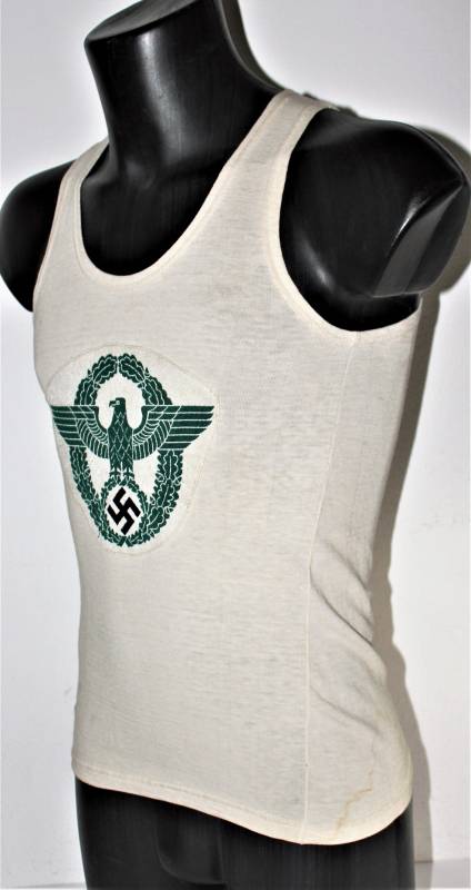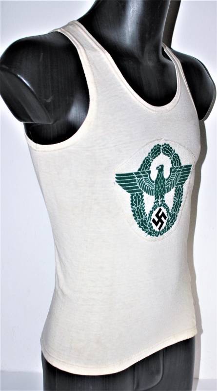 Rara canottiera sportiva della Polizia, non facile da trovare, ottime condizioni quasi pari al nuovo, solo con leggera patina del tempo, senza buchi o strappi e con cuciture perfette, acquila in ricamo BEVO in colorazione verde, cucita in epoca. Nata in stoffa di cotone, taglia circa 46-48. Originale 100% WWII periodo.