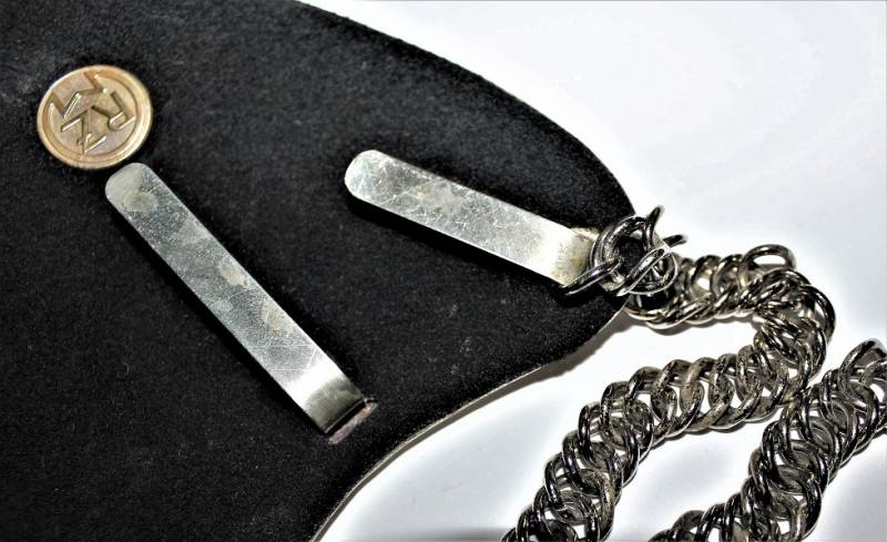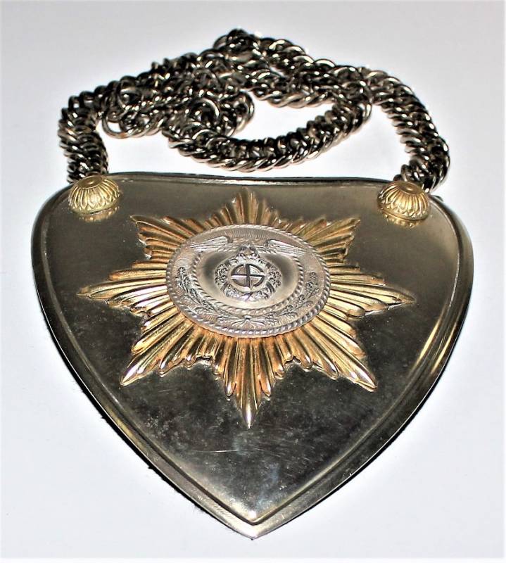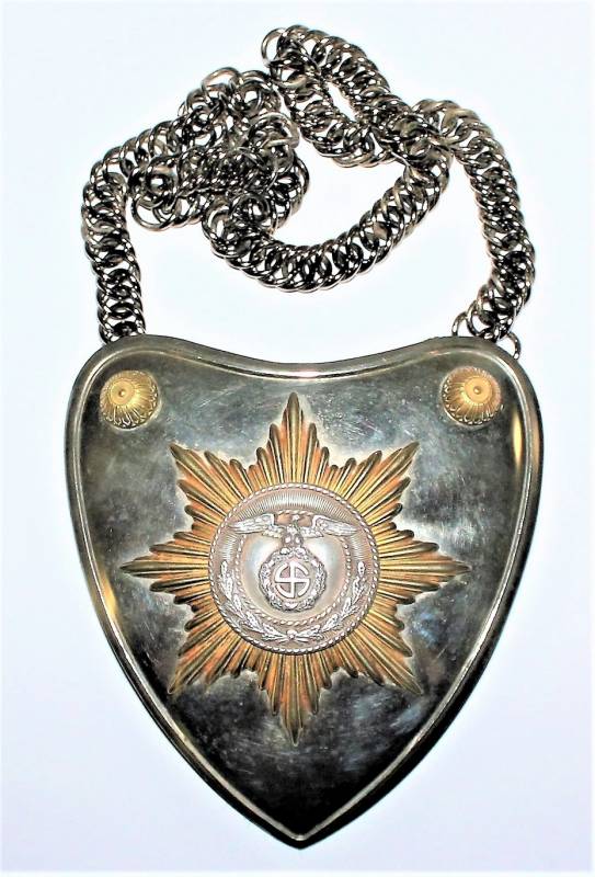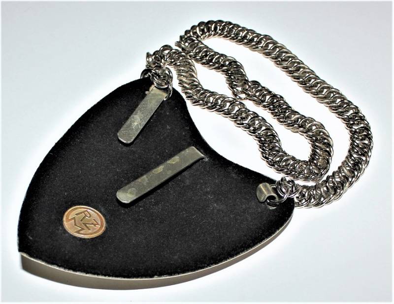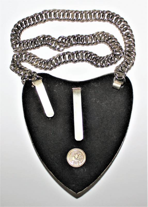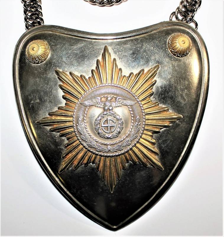 Bellissima Gorgiera delle SA pettorale per porta bandiera in ottime condizioni solo con leggerissima patina del tempo e dellŽuso, completa in ogni sua parte, non restaurata o riparata, sul retro rivestita con panno nero e distintivo RZM. Originale 100% WWII periodo.