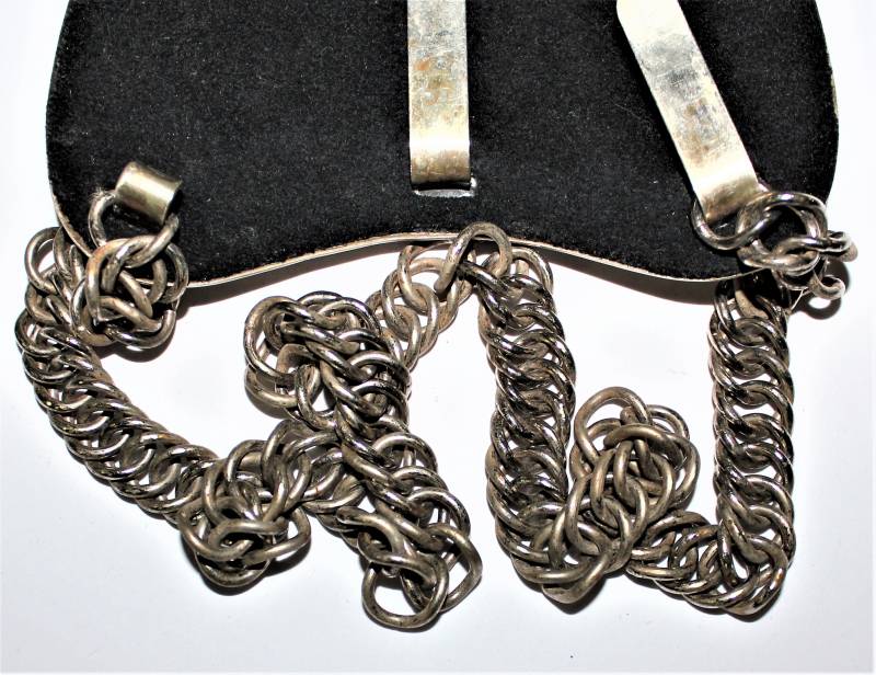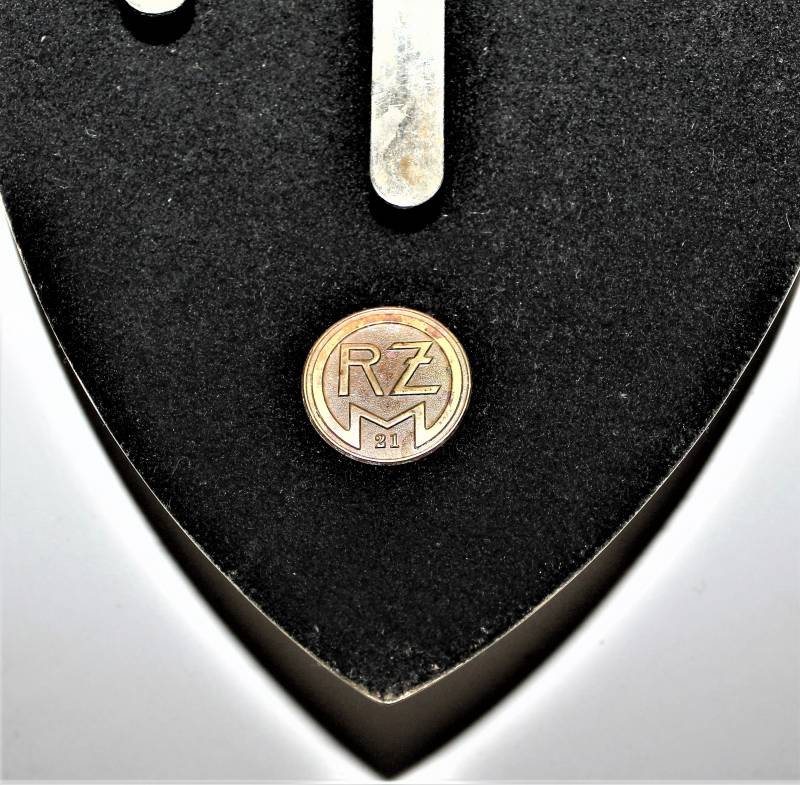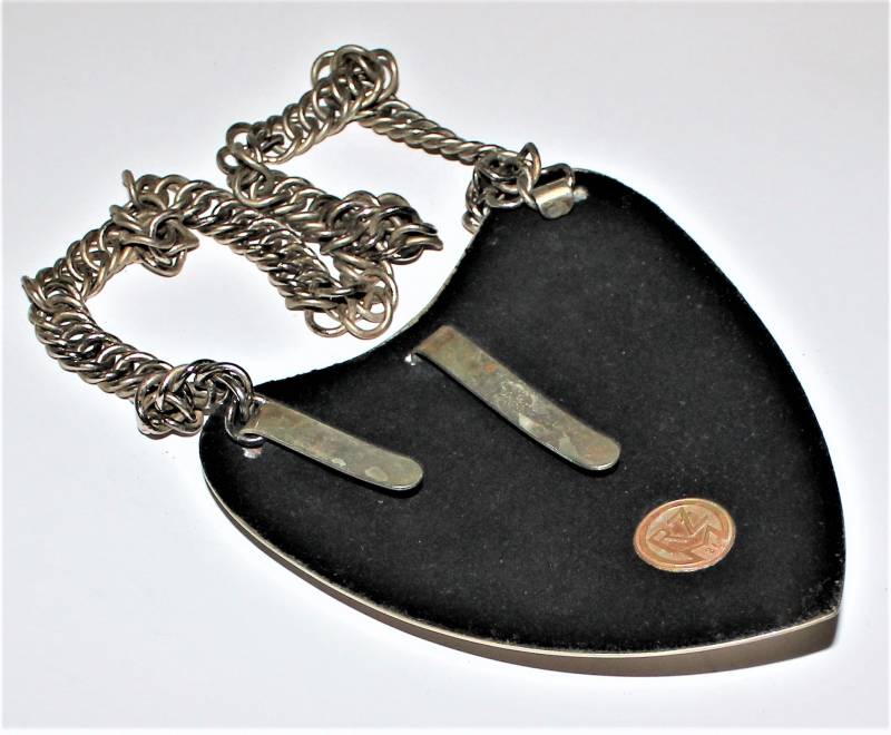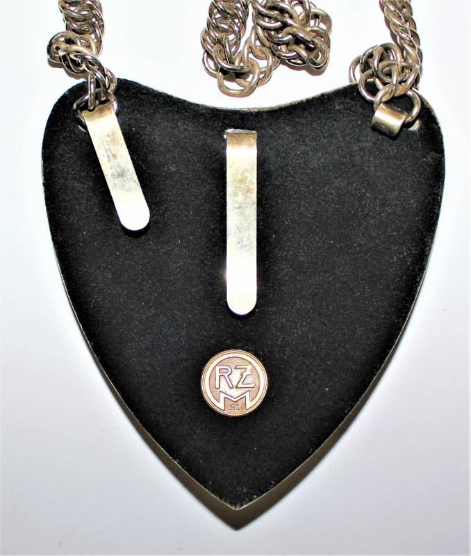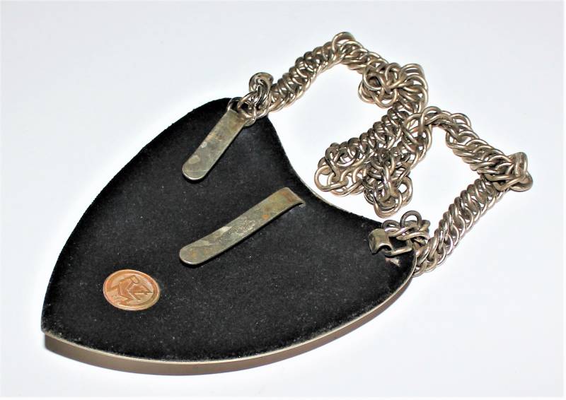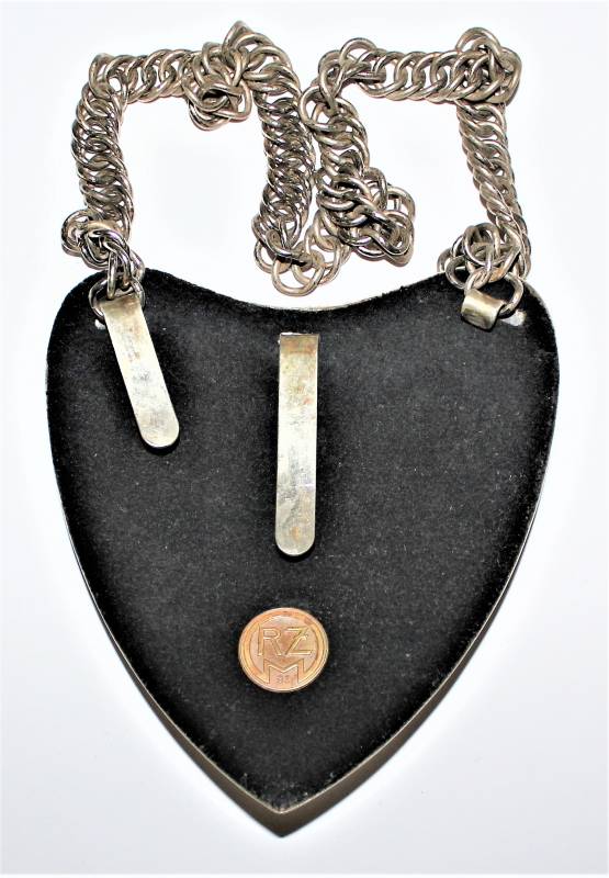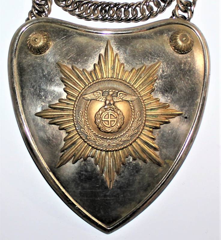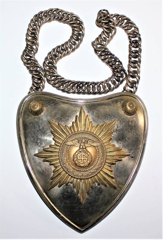 Bellissima Gorgiera delle SA pettorale per porta bandiera in ottime condizioni solo con leggerissima patina del tempo e dellŽuso, completa in ogni sua parte, non restaurata o riparata, sul retro rivestita con panno nero e distintivo RZM con numero 21 di riferimento del costruttore. Originale 100% WWII periodo.