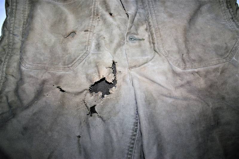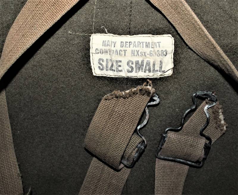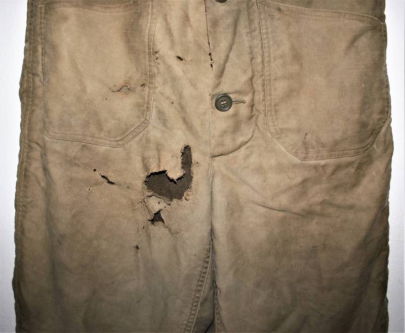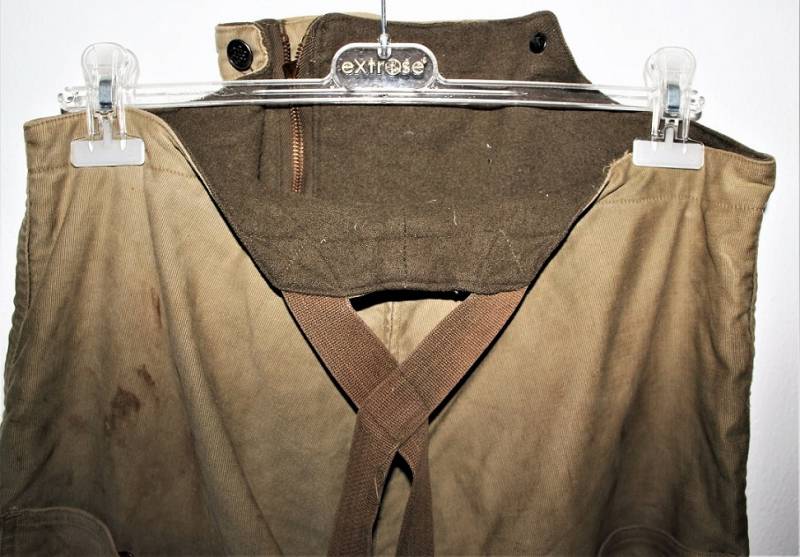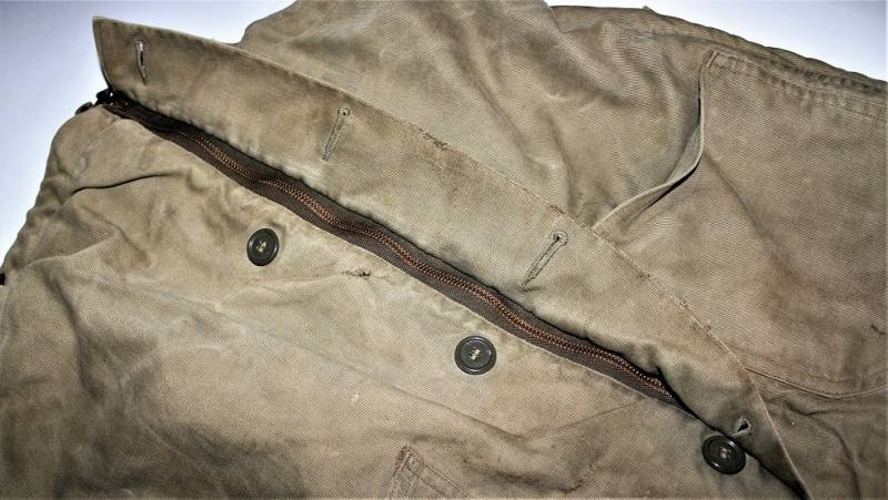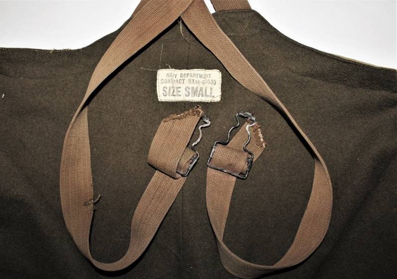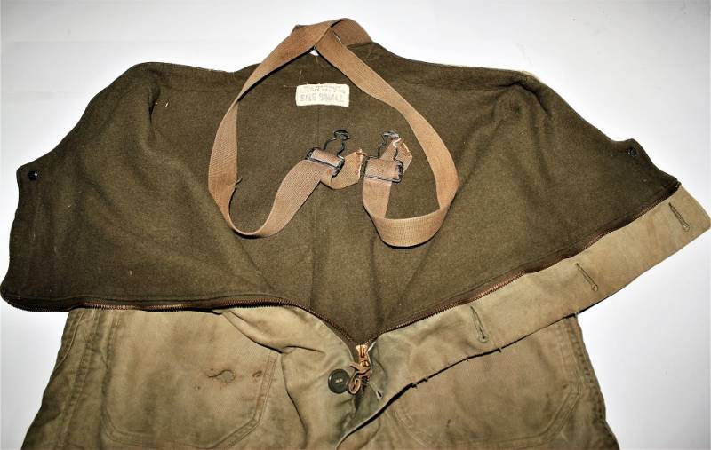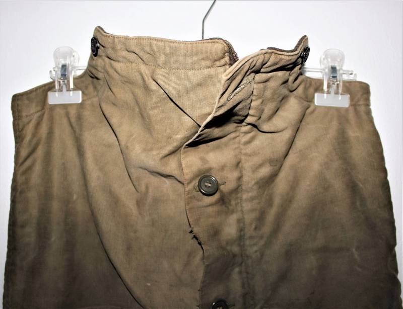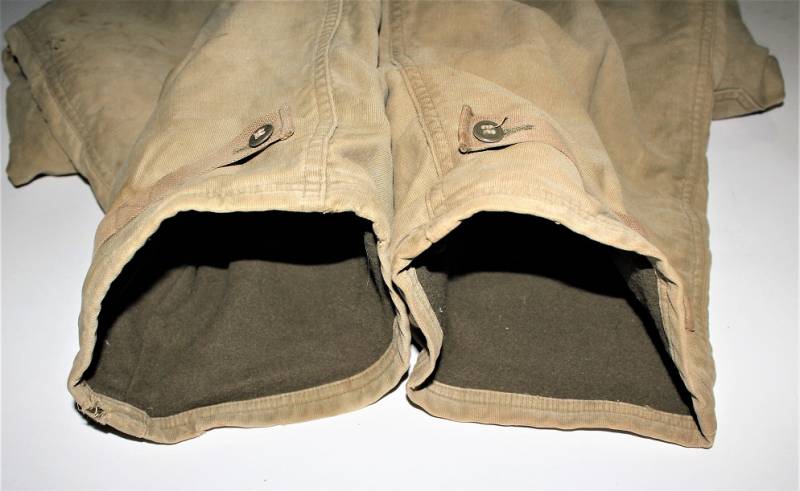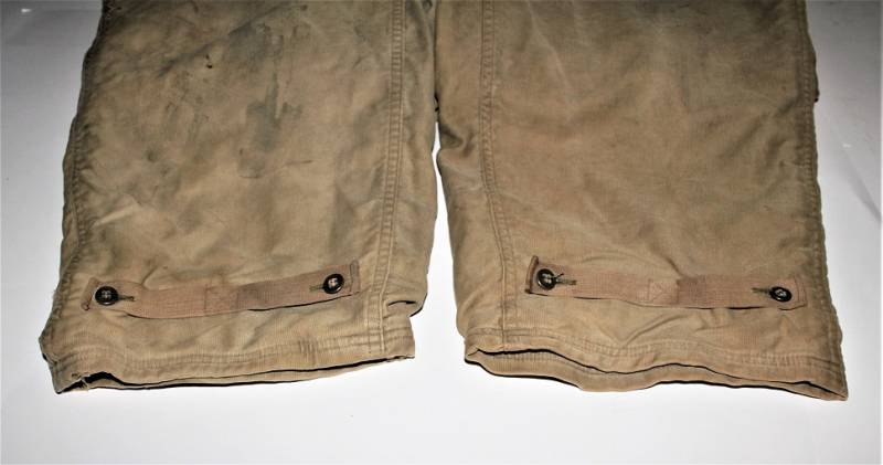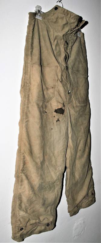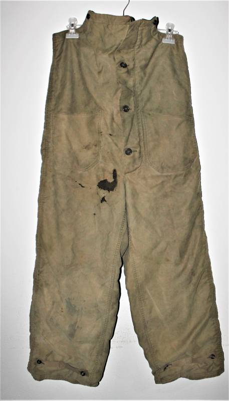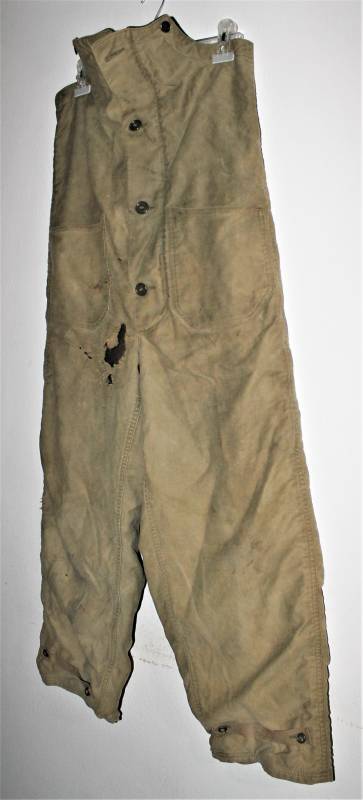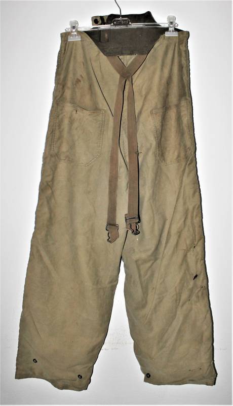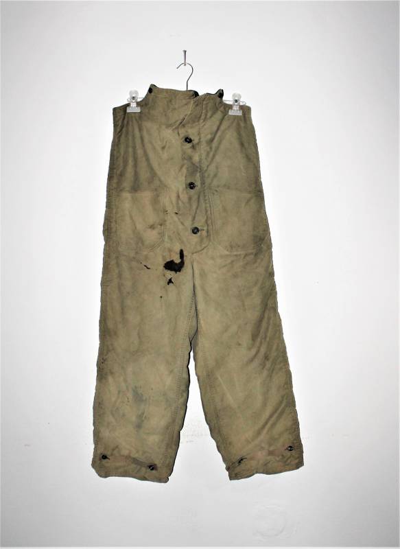 Pantaloni pesanti invernali della Marina in discrete condizioni nati in tela di cotone beige e imbottiti con peltro, non restaurati o riparati ma molto vissuti, sulla parte anteriore è presente un grosso strappo, allŽinterno cartellino con numero di lotto e taglia. Taglia piccola.