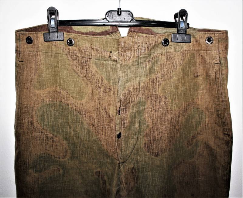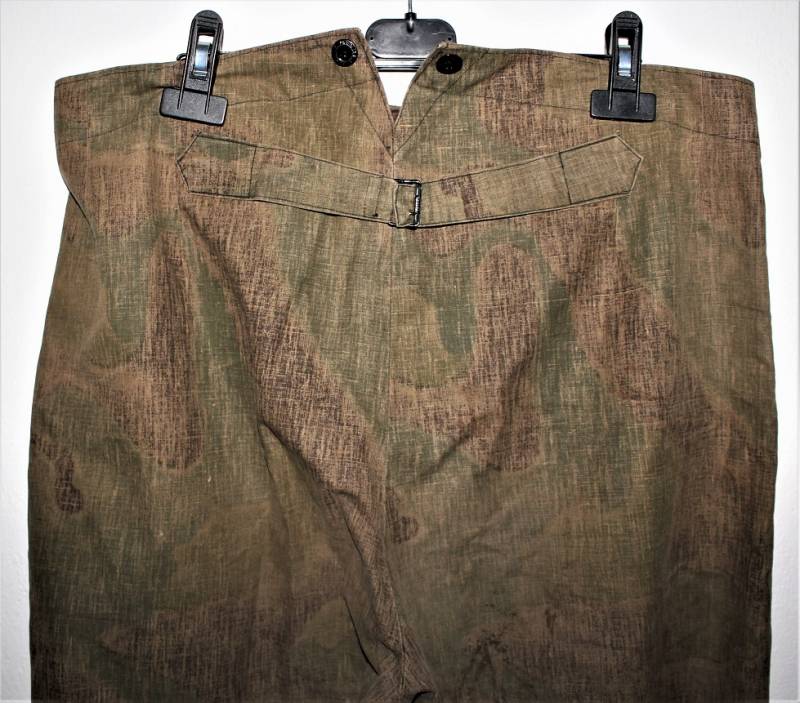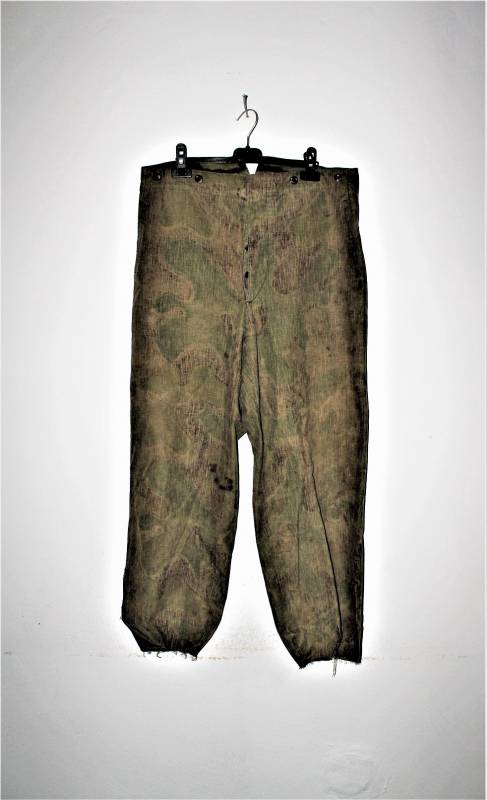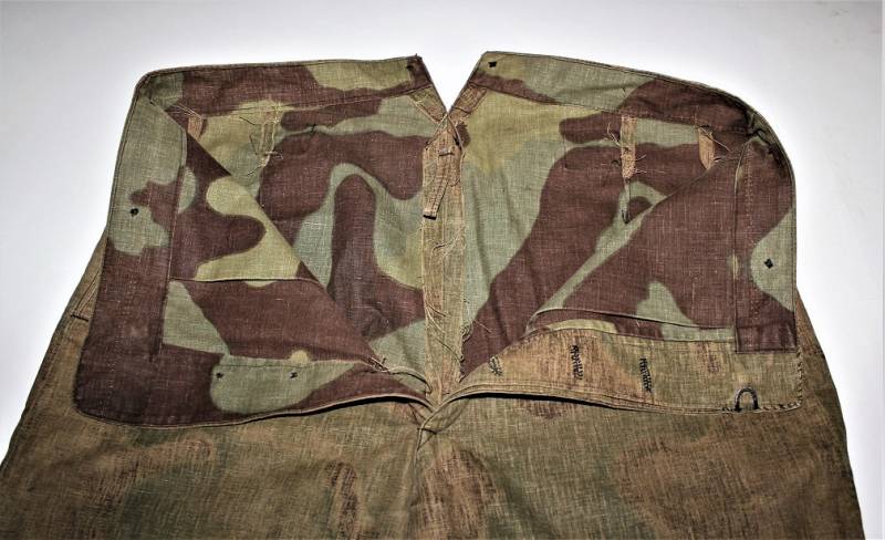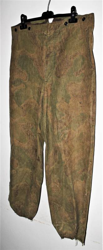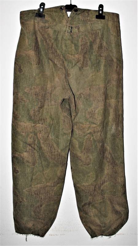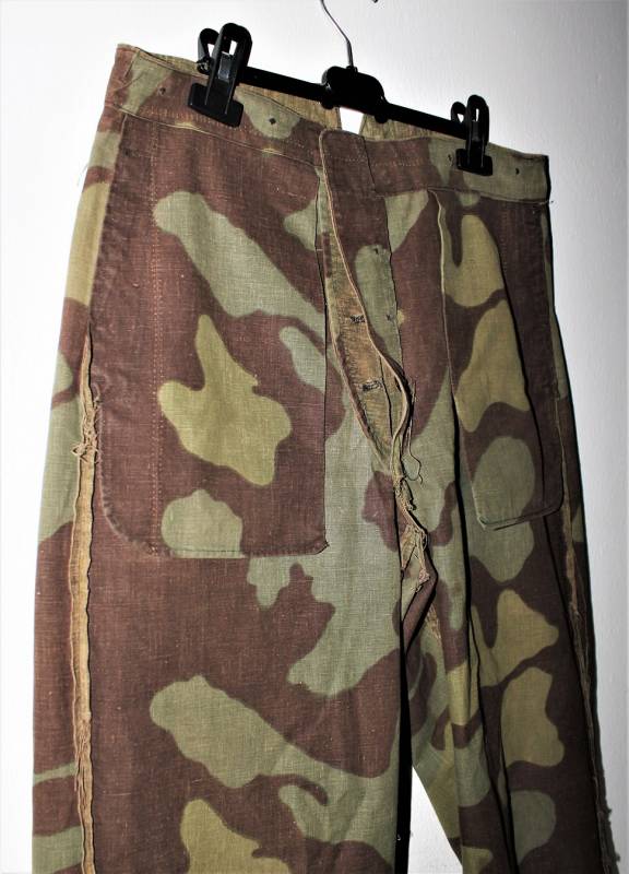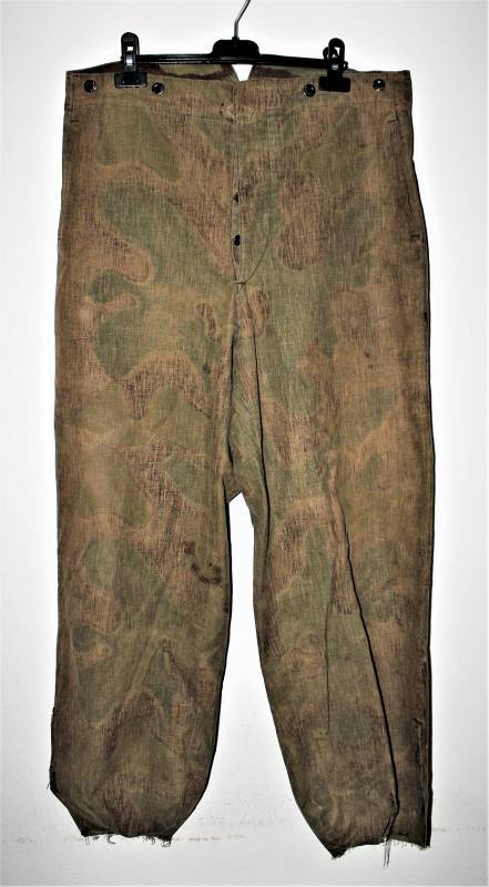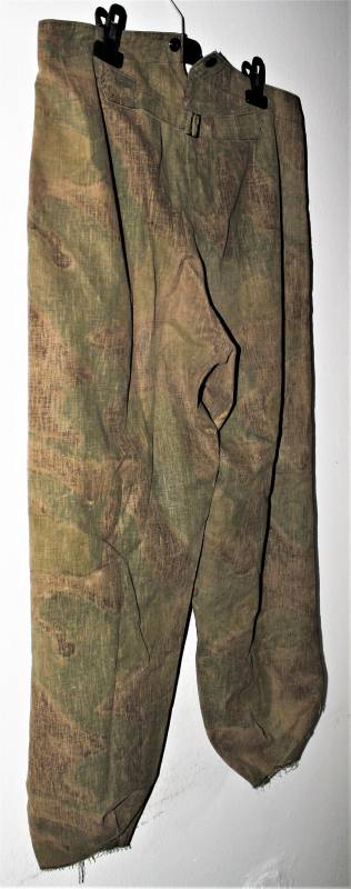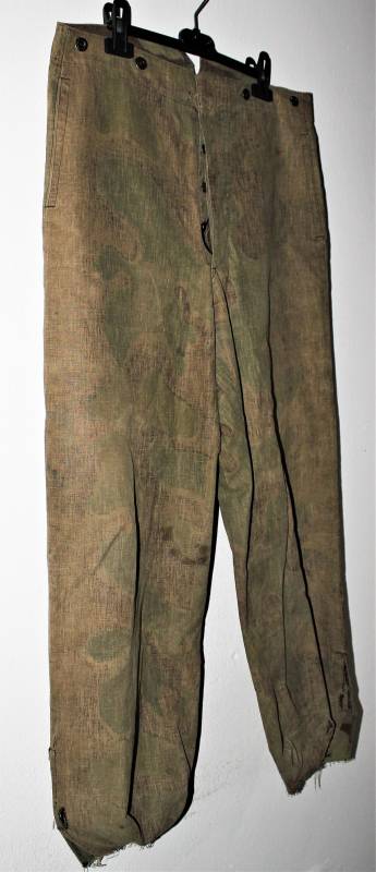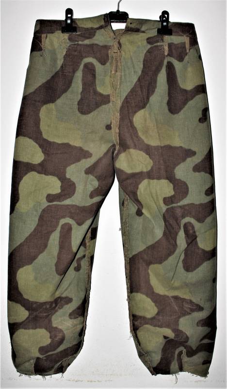 Rari pantaloni da combattimento nati in tessuto mimetico Italiano usati ma in buone condizioni con leggera patina del tempo e dellŽuso, completi in ogni sua parte, non restaurati o riparati, piccolo taglio in fondo alla gamba sinistra.