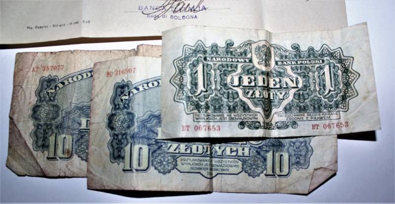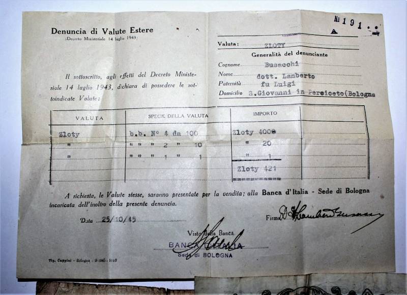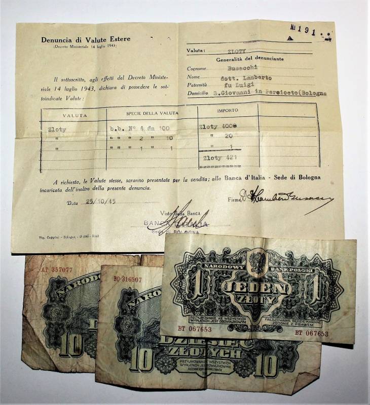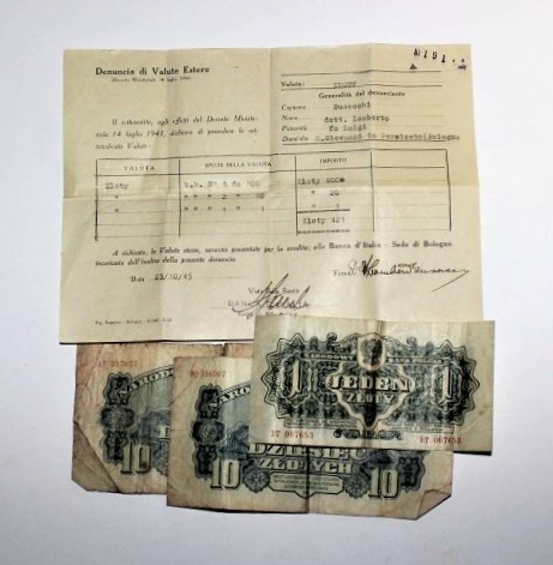 Banconote Polacche per un totale di 421 "Zloty" accompagnate da denuncia di banconote valuta estera in cambio di moneta Italiana presso la banca dŽItalia con sede in Bologna, appartenute ad un medico Italiano della provincia di Bologna, il tutto in buone condizioni.