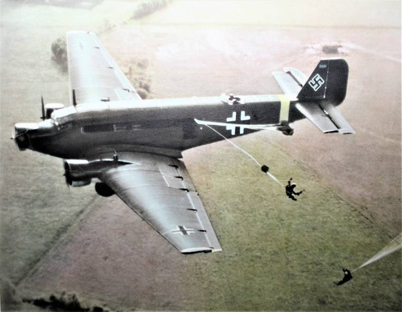 Bella foto a colori di Junkers Ju 52 con salto paracadutisti in buone condizioni, ottimi colori, solo piccola riparazione nella parte in alto.
