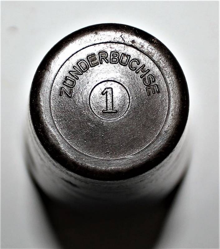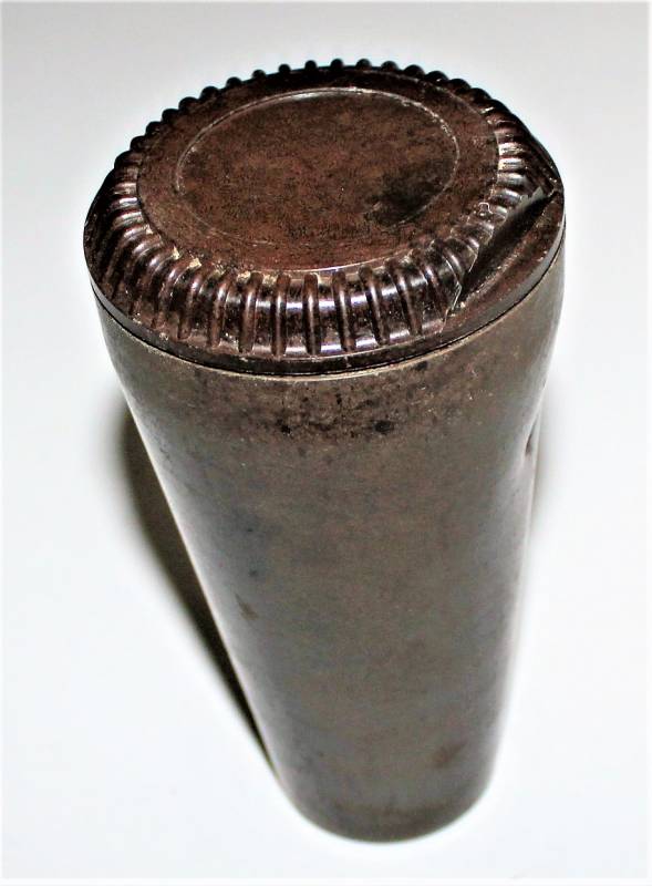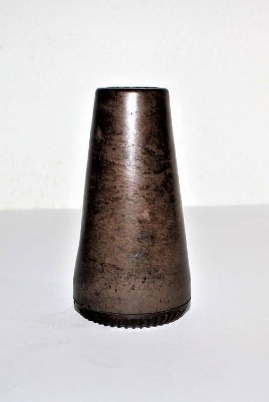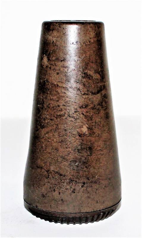 Contenitore in bachelite marrone per spoletta dŽartiglieria in ottime condizioni, non danneggiato, solo con leggera patina del tempo e dellŽuso, marcato con codice produttore, altri codici di produzione e data.
