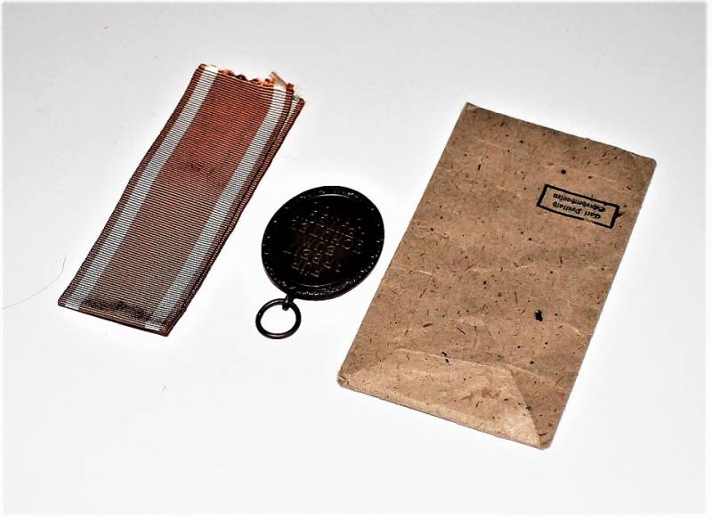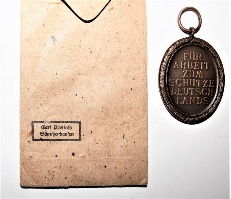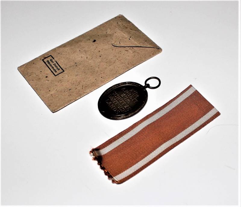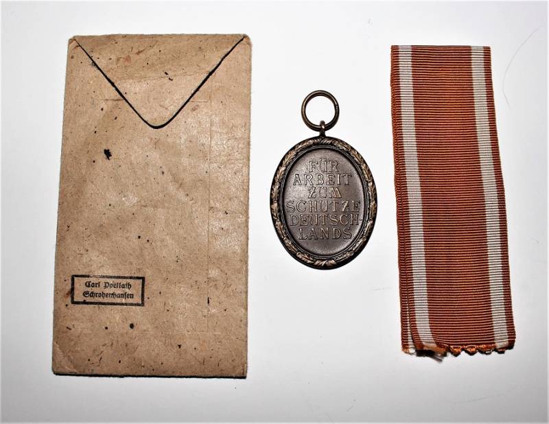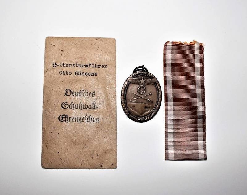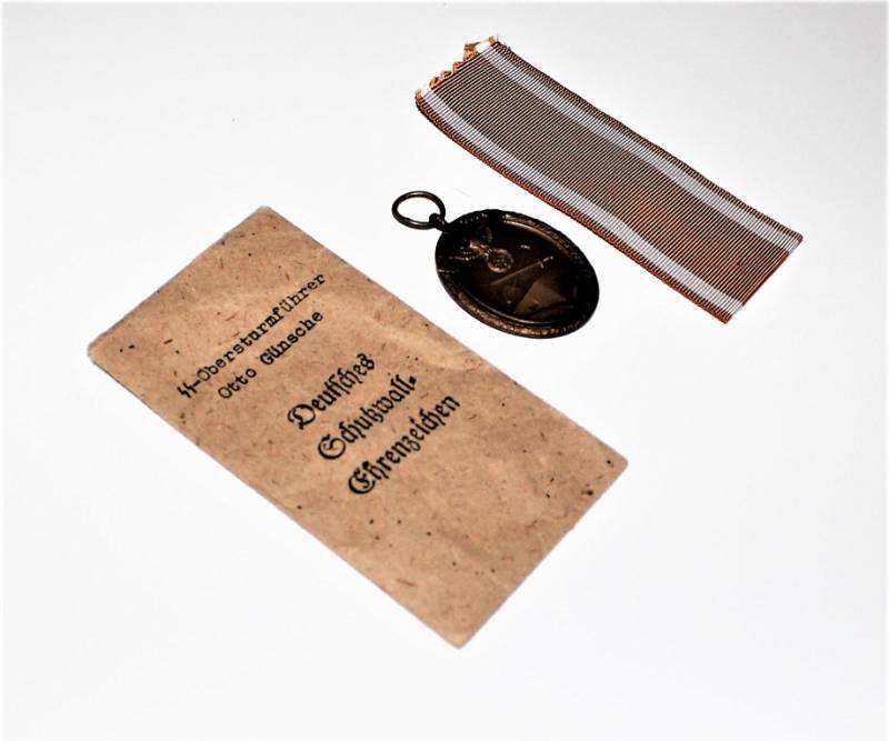 Medaglia della difesa tedesca completa di nastrino in condizioni perfette pari al nuovo, completa della sua busta di carta con il nome del fabbricante con cui veniva consegnata in origine. Il distintivo apparteneva a SS OBERSTURMFUHRER OTTO GUNSCHE, auiutante personale di Adolf Hitler, sulla busta è inciso il nome e il grado scritti a macchina. Originale 100% WWII periodo.