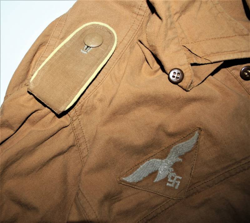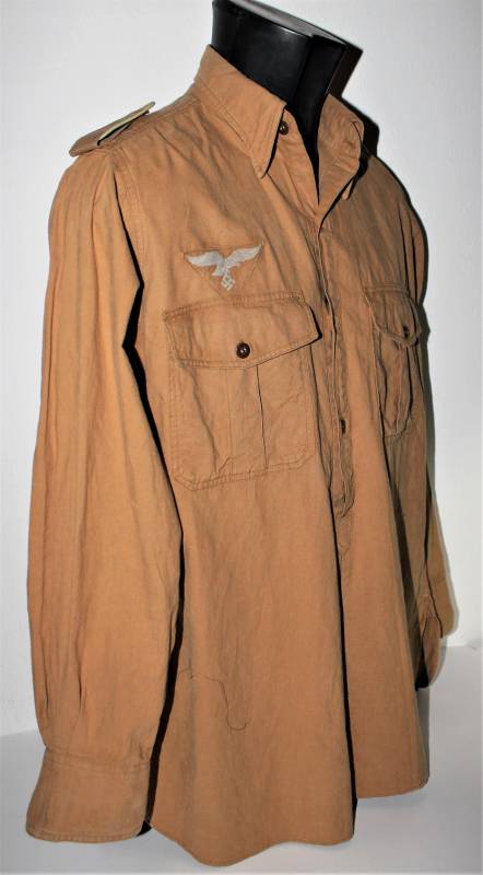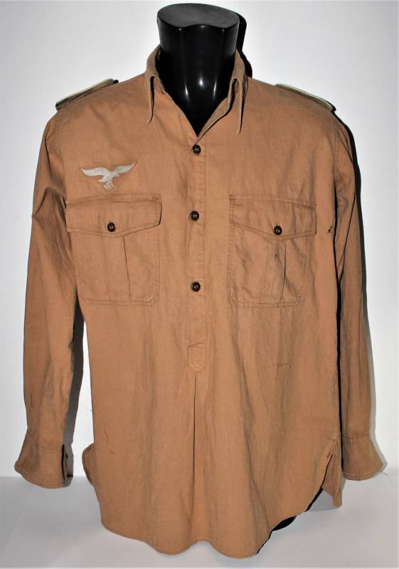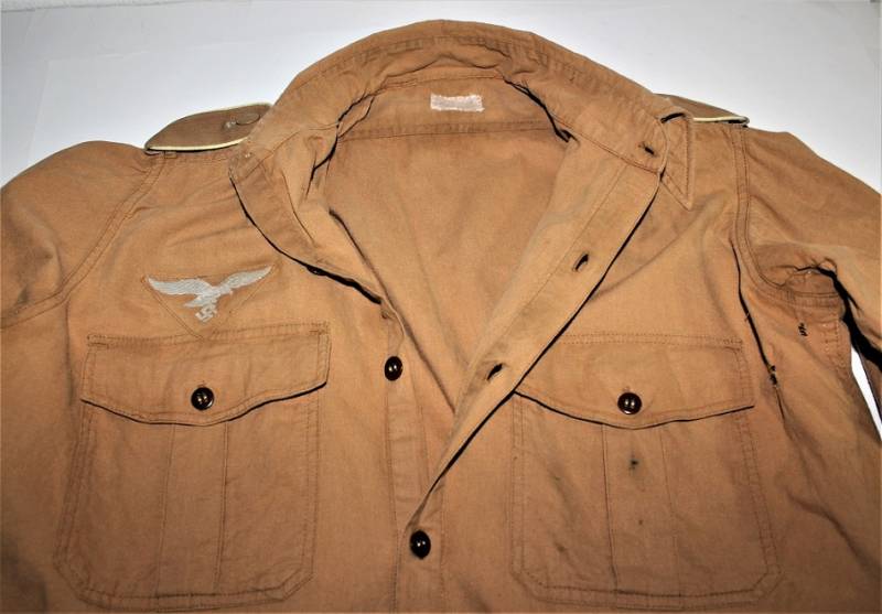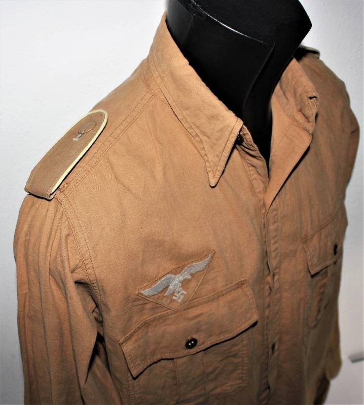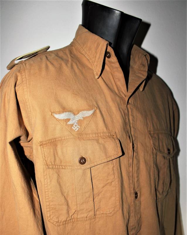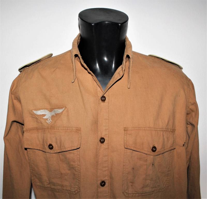 Tropical shirt of the Luftwaffe born in yellow cotton, long-sleeved model, complete with vintage machine-stitched eagle and yellow waffenfarbe shoulder board, very good condition, slightly used, two small mending on the left side near the sleeve (see photo), perfect seams . Fabric label with soldierīs name. Large size about 50.