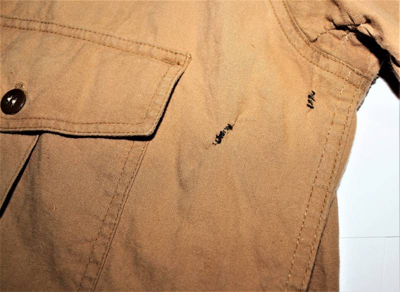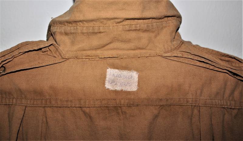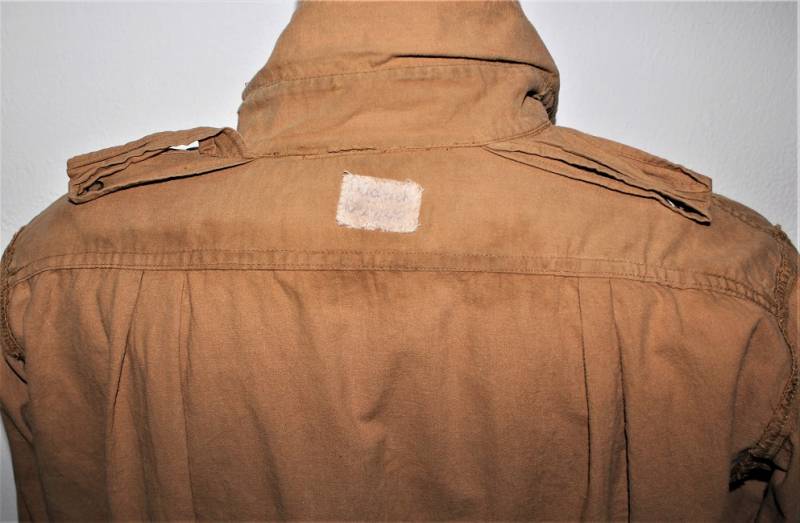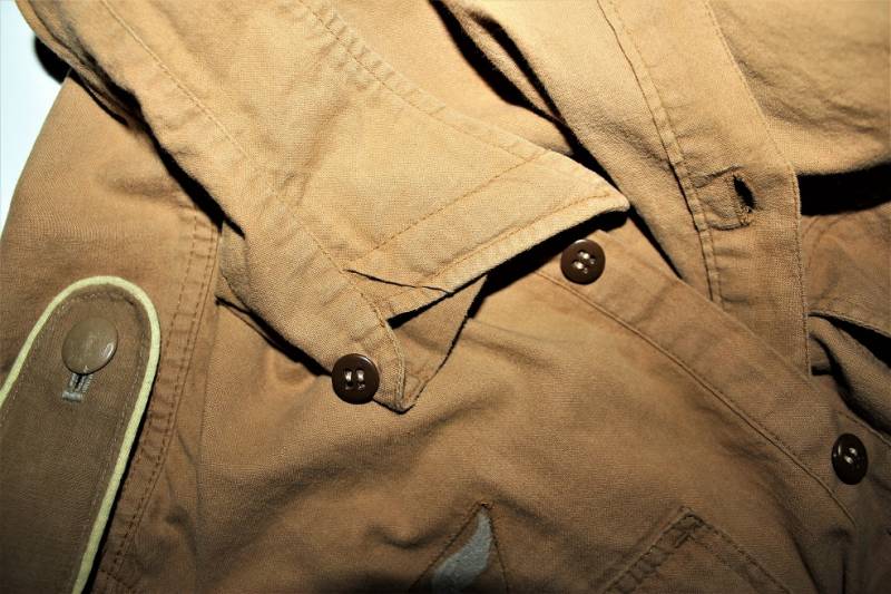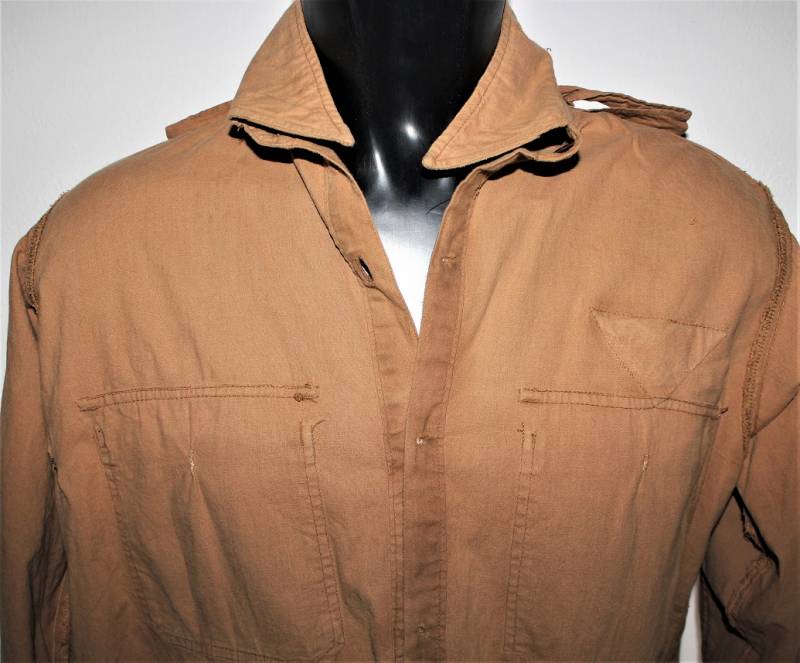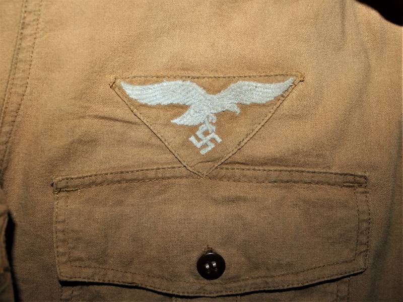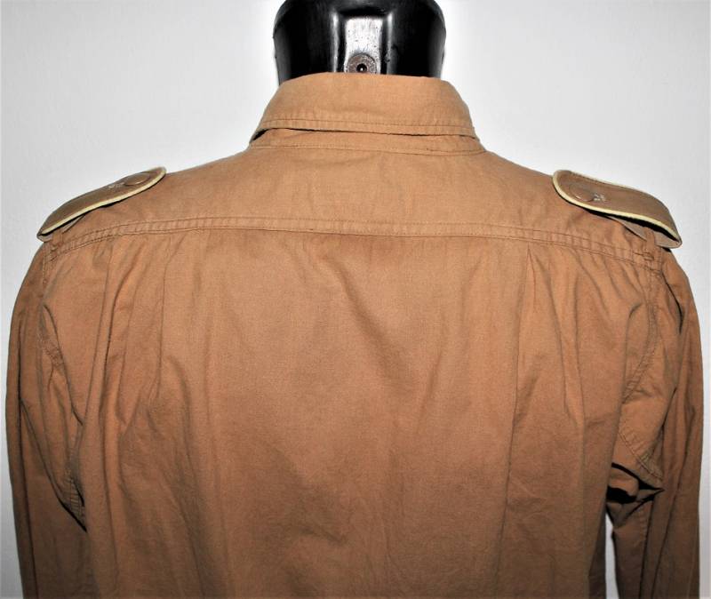 Tropical shirt of the Luftwaffe born in yellow cotton, long-sleeved model, complete with vintage machine-stitched eagle and yellow waffenfarbe shoulder board, very good condition, slightly used, two small mending on the left side near the sleeve (see photo), perfect seams . Fabric label with soldierīs name. Large size about 50.
