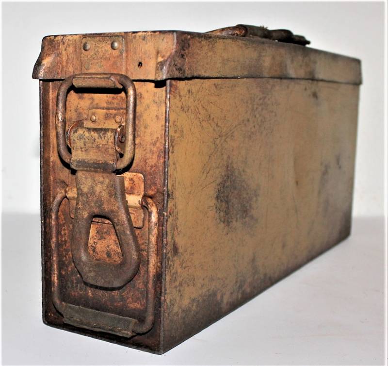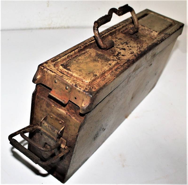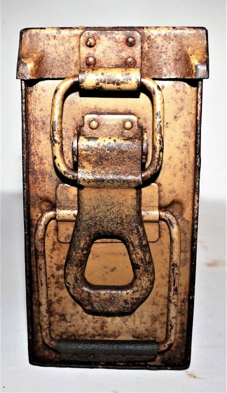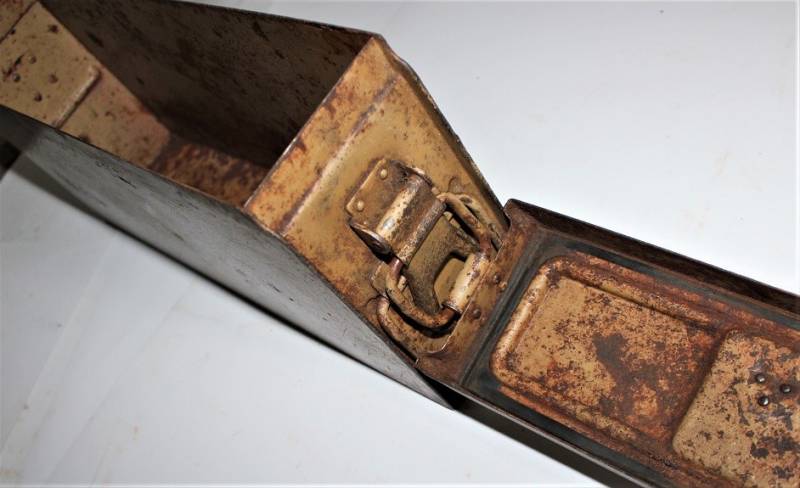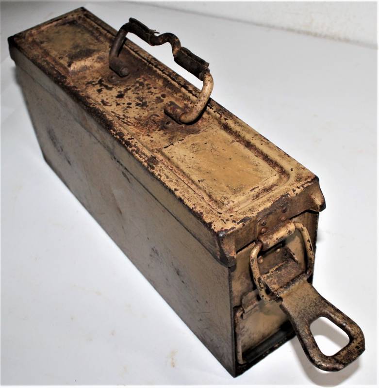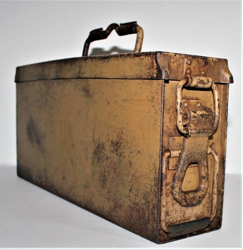 Ammunition metal case for MG34-42 in yellow color tropical DAK or Italian front, varnish at 80%, complete in all its parts, not restored or repaired, marked with manufacturer code and date 1943. Original 100% WWII period.