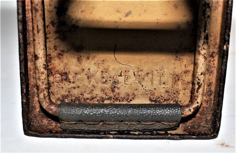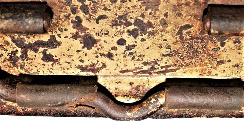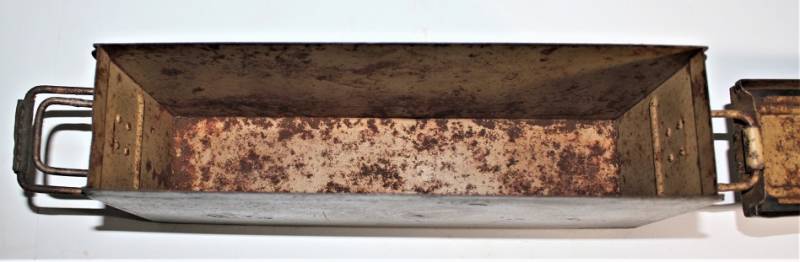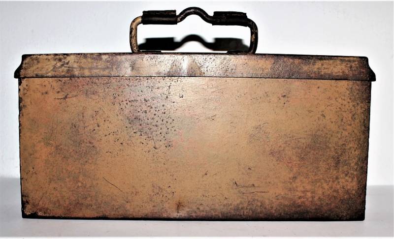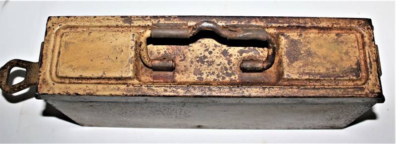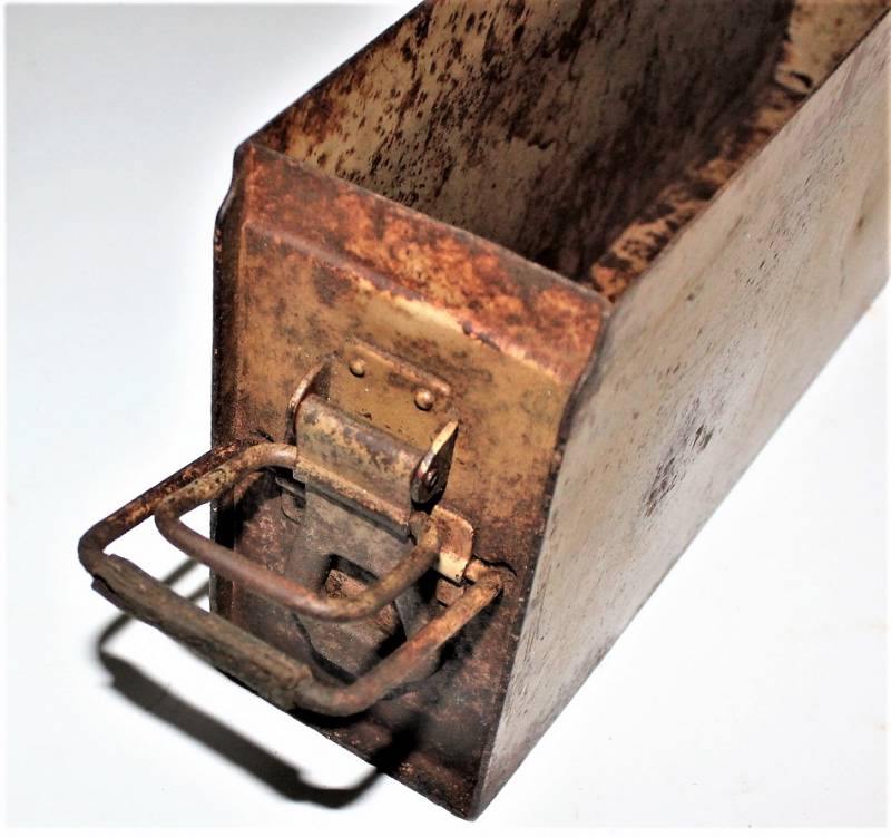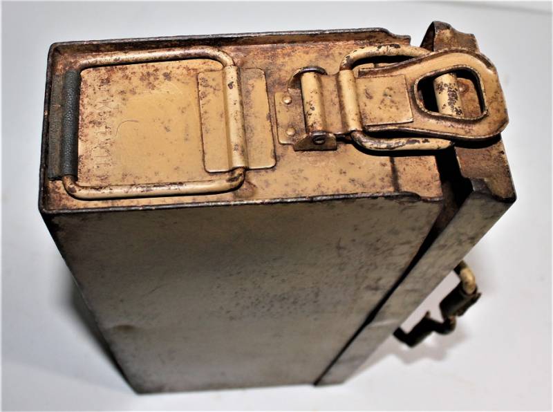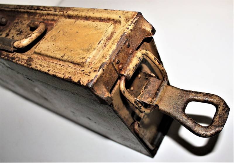 Ammunition metal case for MG34-42 in yellow color tropical DAK or Italian front, varnish at 80%, complete in all its parts, not restored or repaired, marked with manufacturer code and date 1943. Original 100% WWII period.