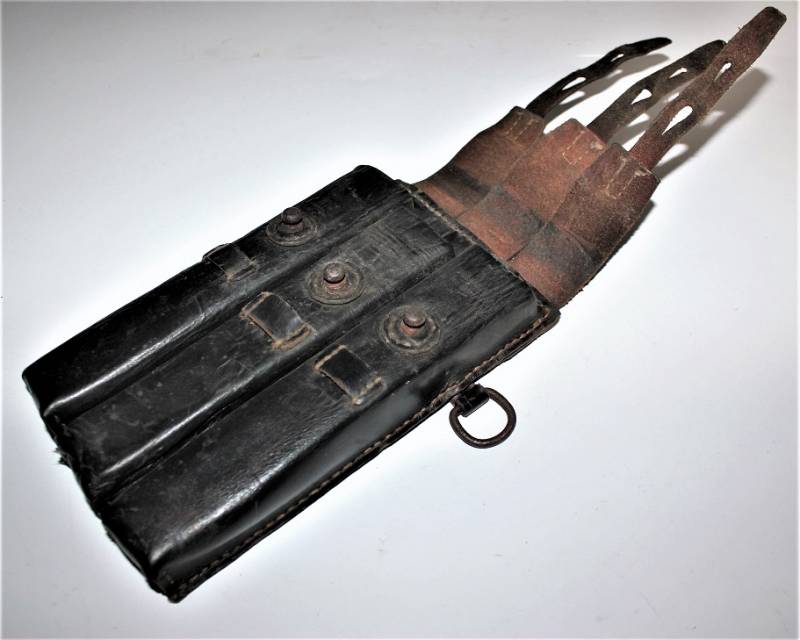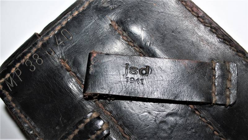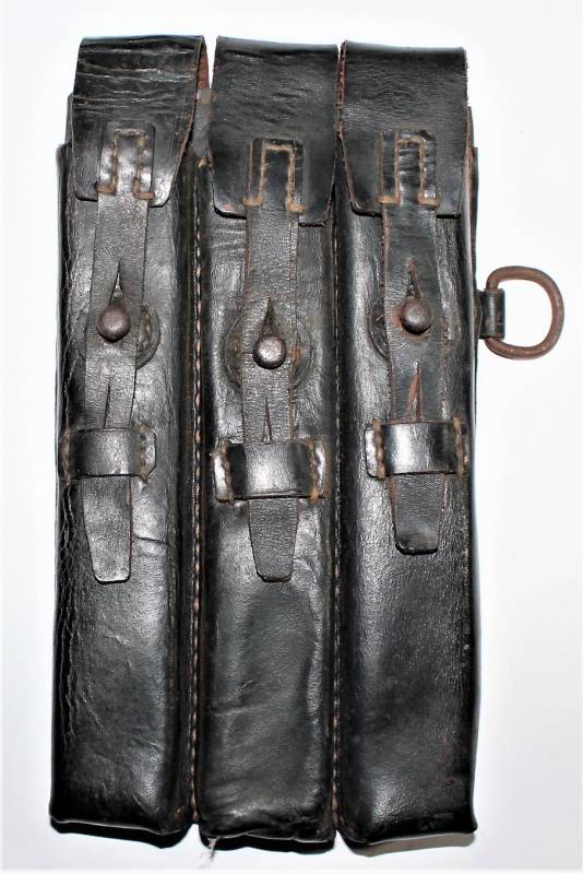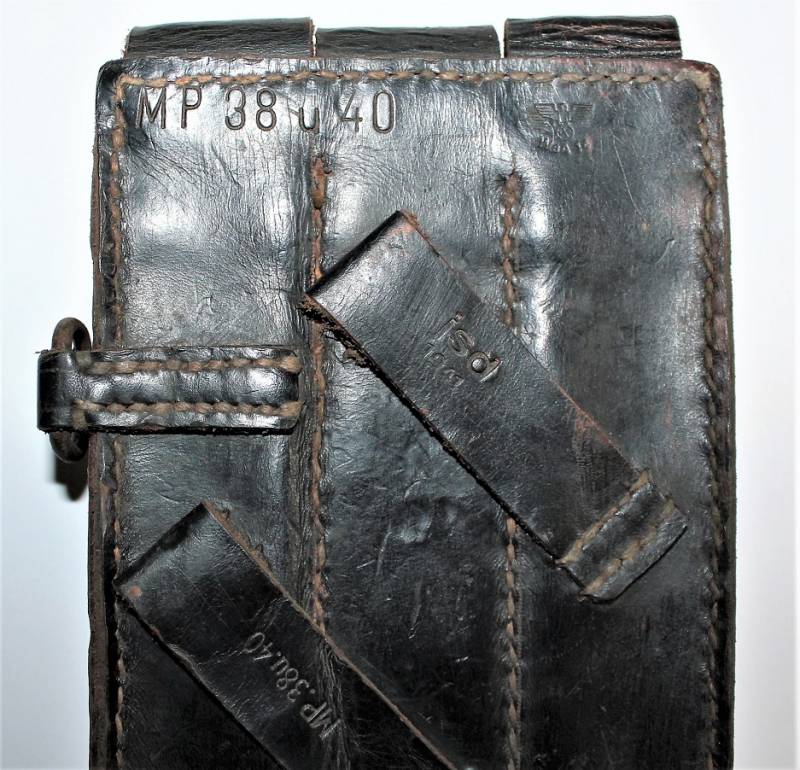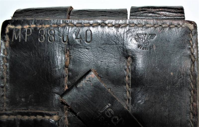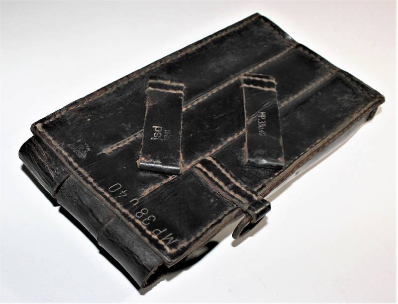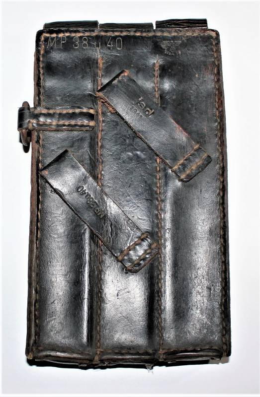 Leather magazine pouches of the 1st type for MP38-MP40, right side, discreet condition, complete in all its parts, with signs of time and use, leather still in good condition discreetly soft, perfect seams, marked on the back "MP38 u 40", waffenamt, manufacturer code and date 1941. Original 100% WWII period.