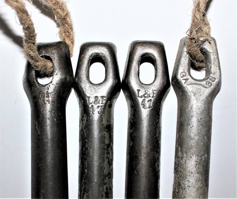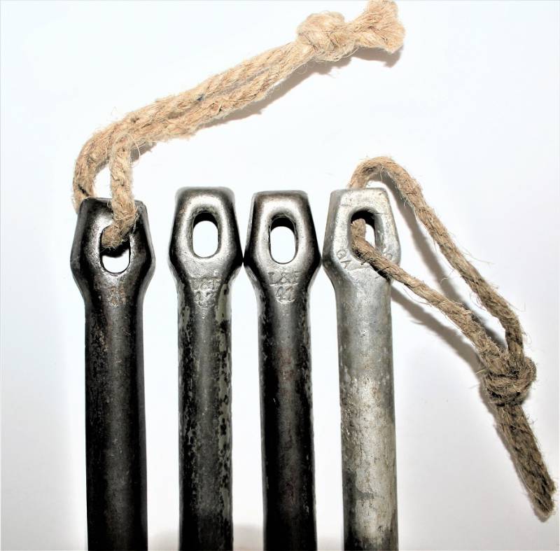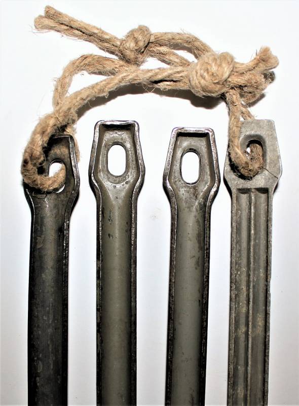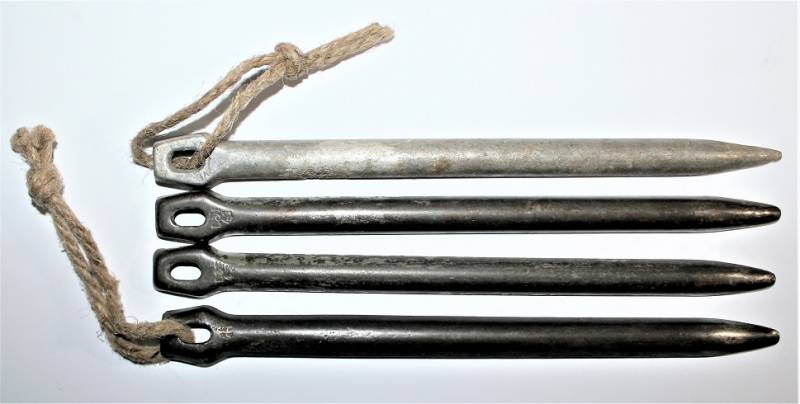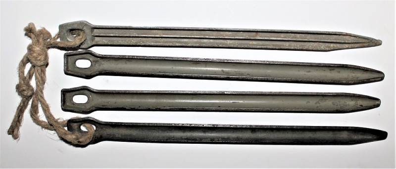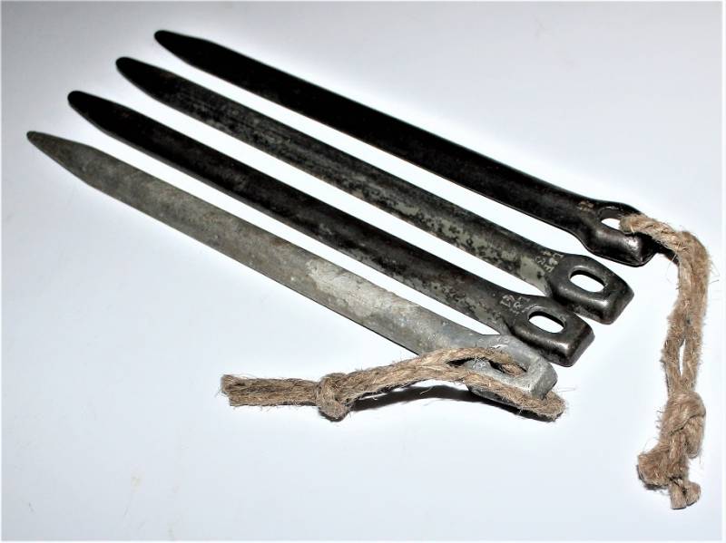 Metal pegs for tent in good condition, marked with manufacturer code and date. 100% original WWII period.