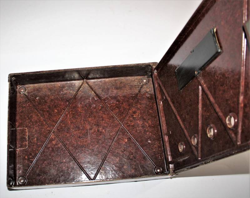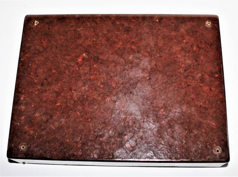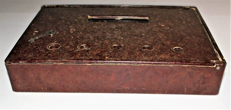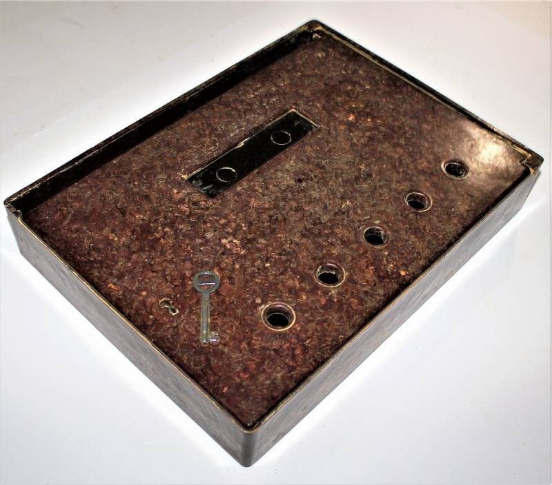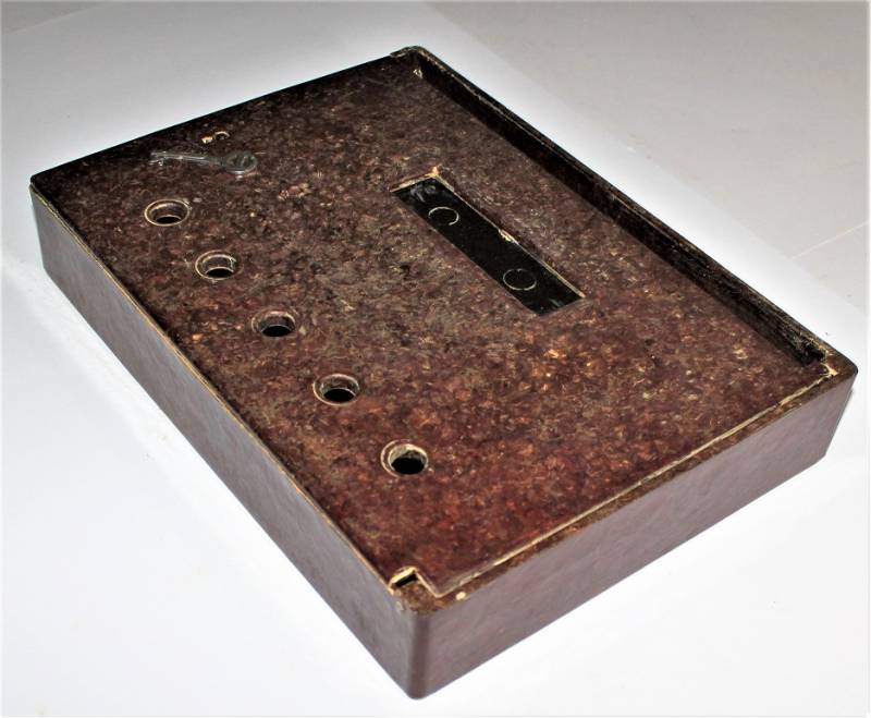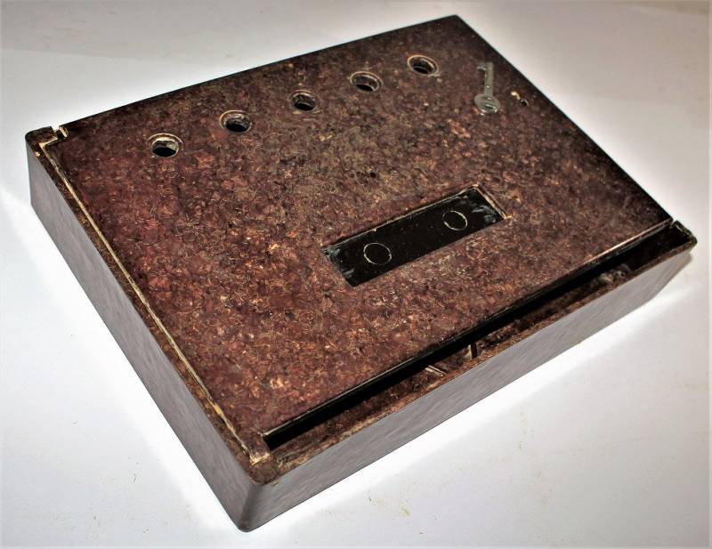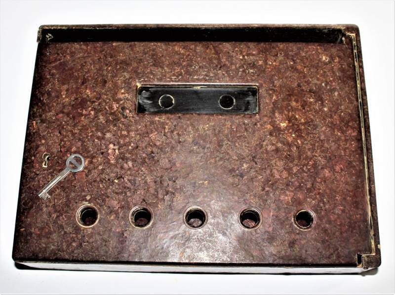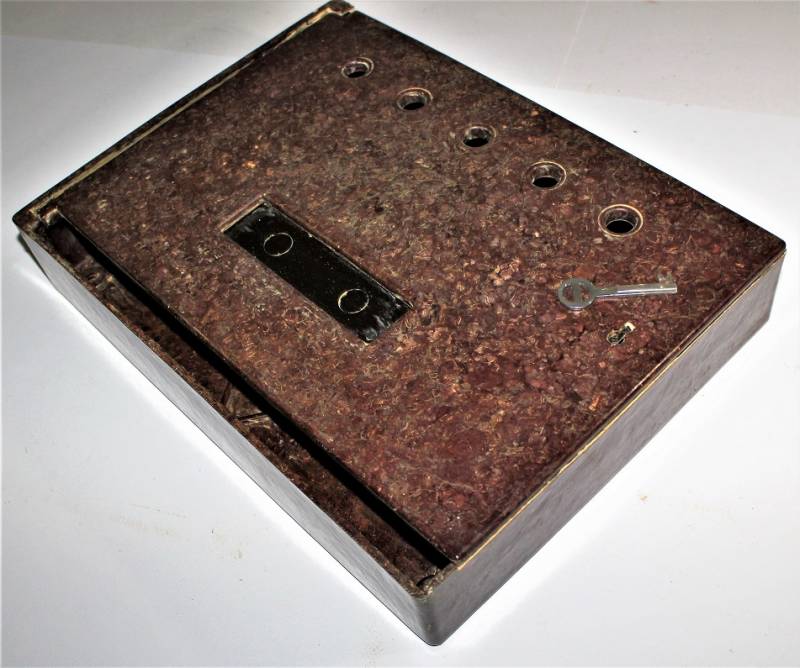 Brown-red bakelite letterbox in perfect condition, undamaged, unrestored or repaired only with a slight patina of time and use and complete with its key.