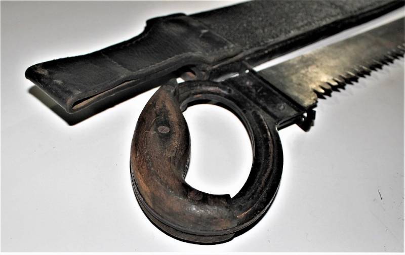 WH Pioneer saw and scabard very nice condition, not restored or repaired, the leather and the seams of the scabbard are intact, the wooden handle is perfect, all with patina of time and use, marked on the blade with the name of the manufacturer and date 1941. Original 100% WWII period.