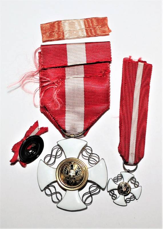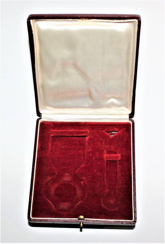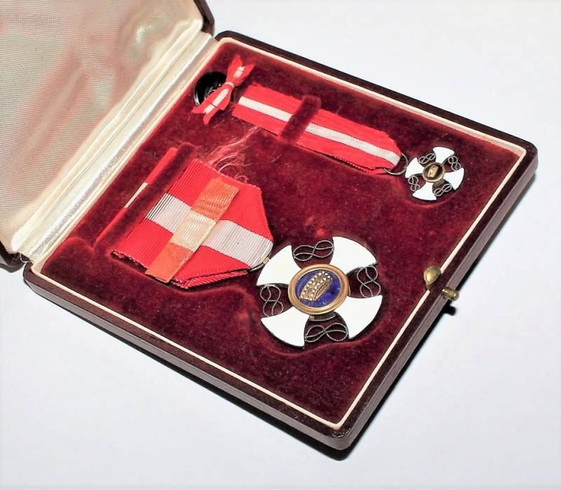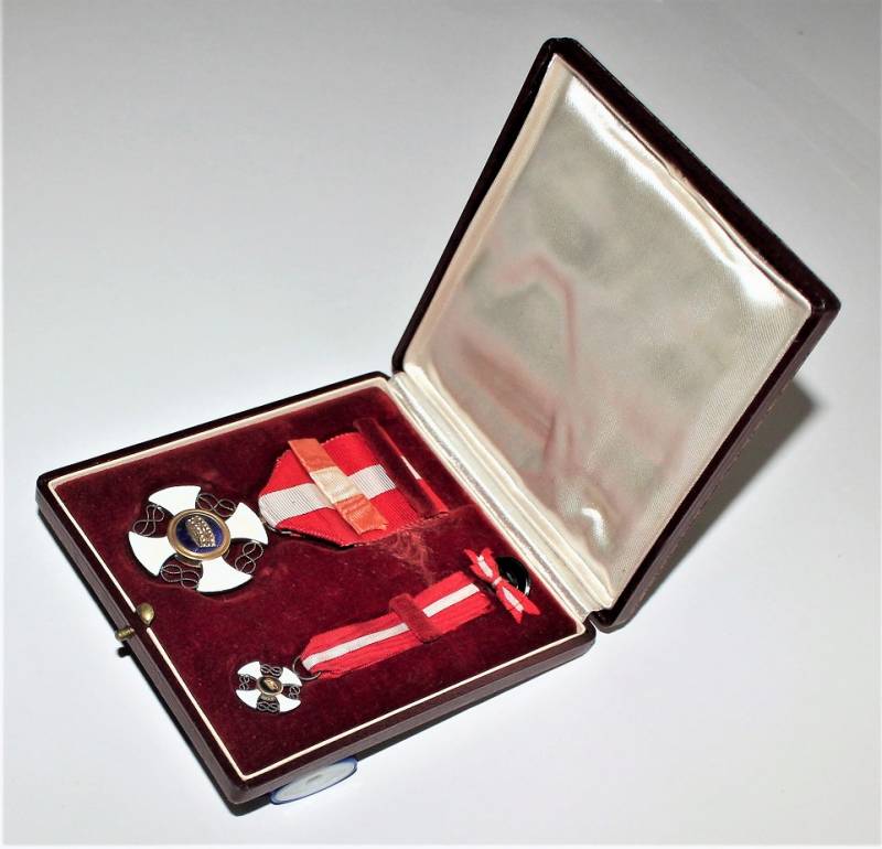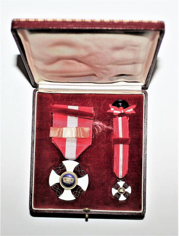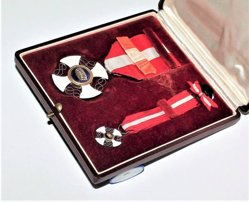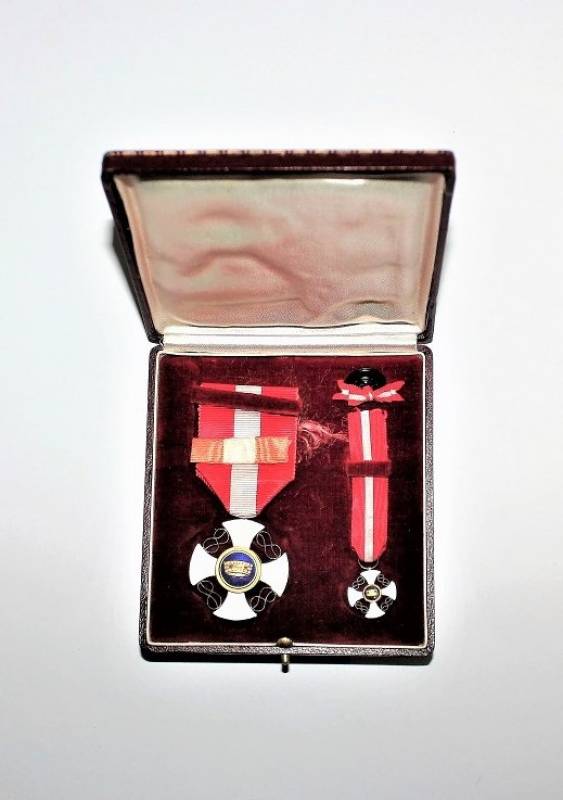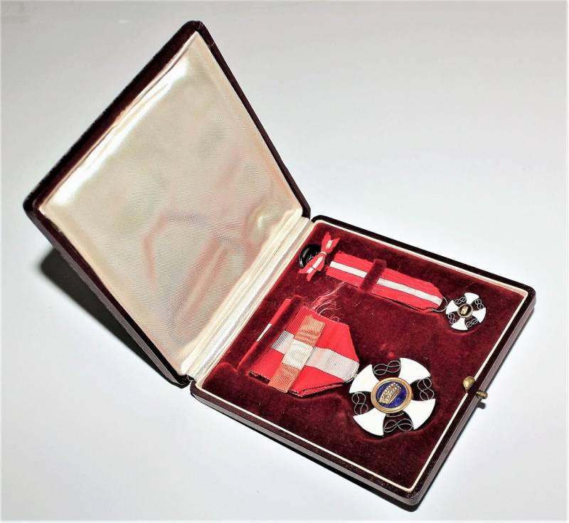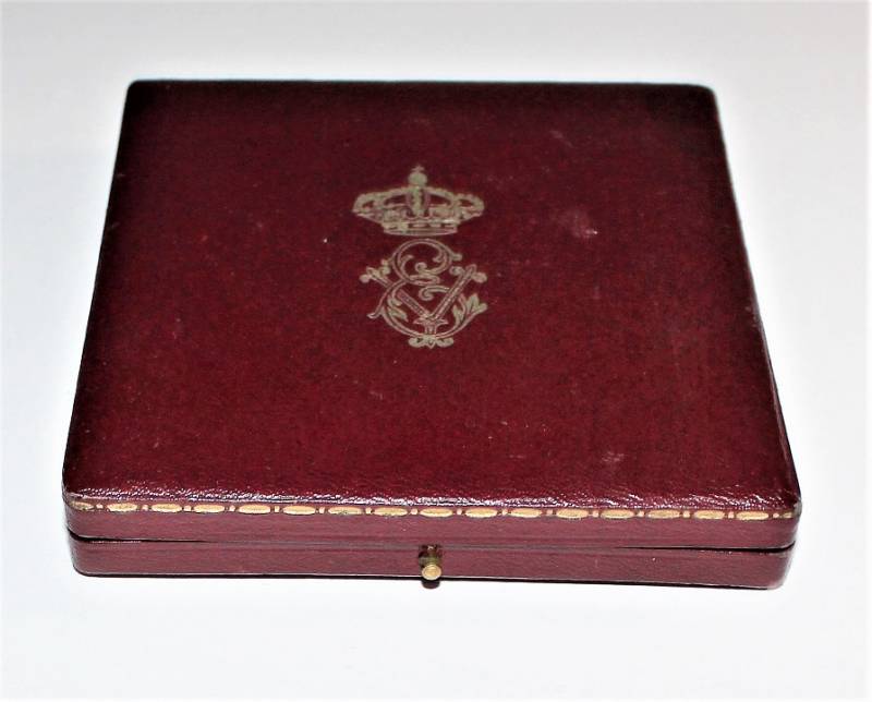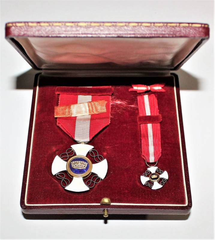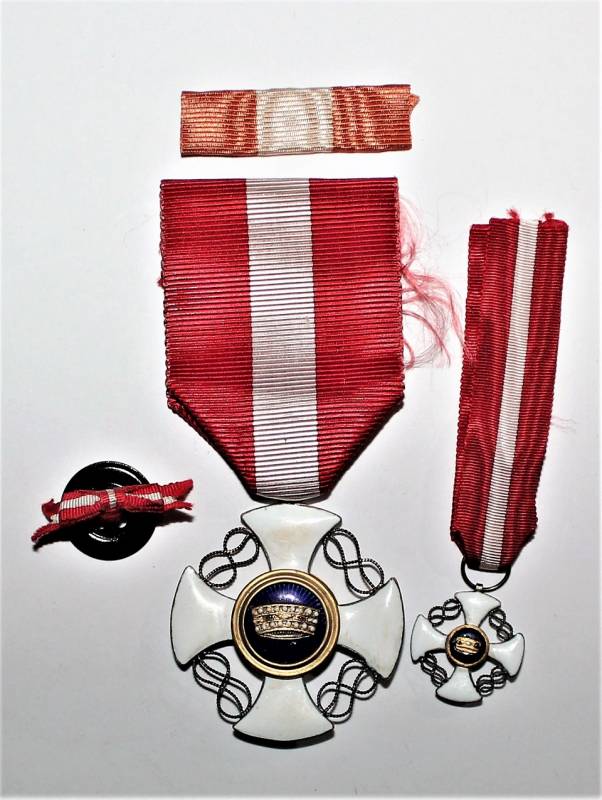 Beautiful decoration Vittorio Emanuele 3rd - Crown of Italy Order in box in excellent condition almost like new, only with very slight patina of time, the enamels and paints of the badges are perfect, the set includes medal Order of the Crown of Italy, miniature of the same, button ribbon and box.