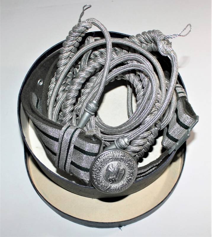 Beautiful set of aiguillette plus belt and parade buckle for WH Officer in its cardboard box, very good condition, almost like new, only light patina on the cardboard box, lanyard and belt are in perfect condition. 100% original WWII period.