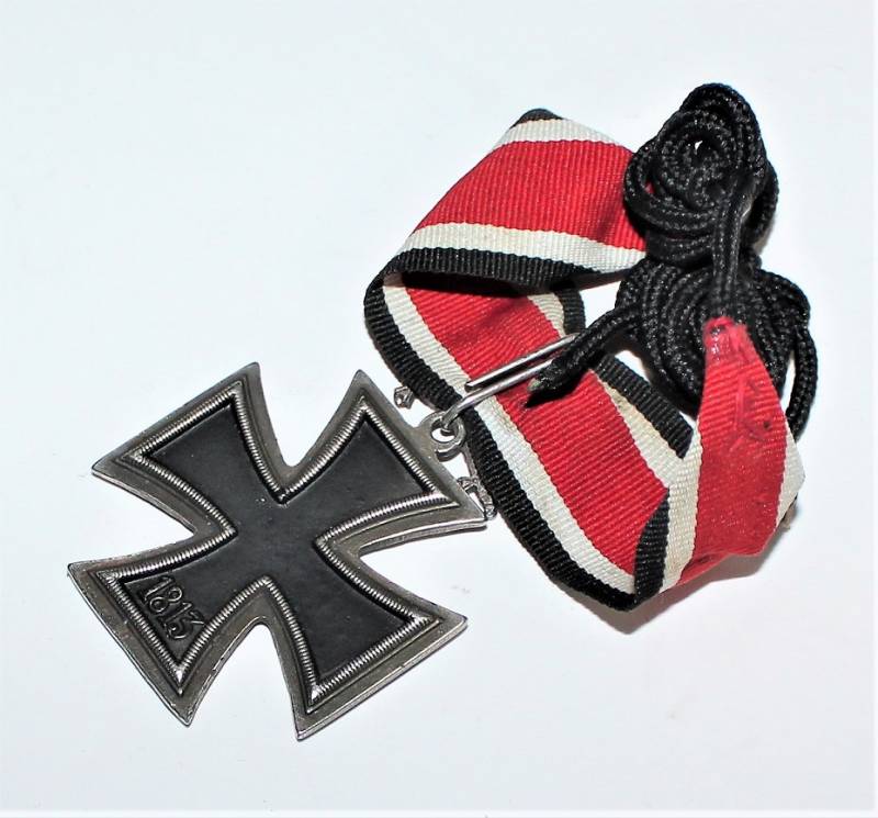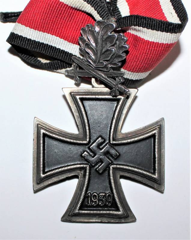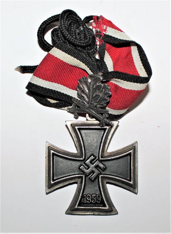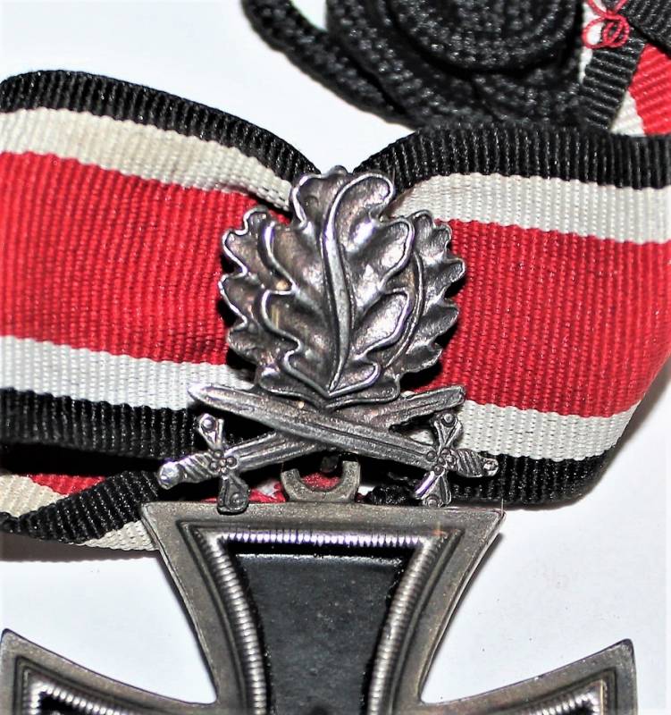 Nice copy of Knight“s Cross with oak leaves and swords, complete with ribbon and with patina of wear. Not marked.
