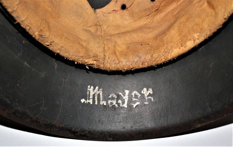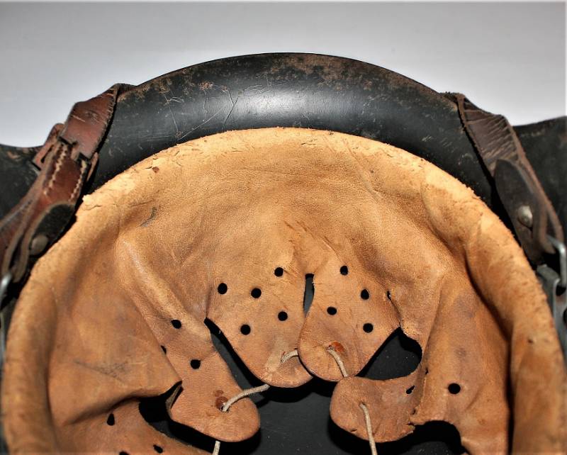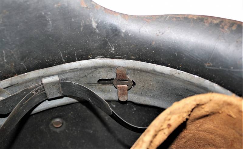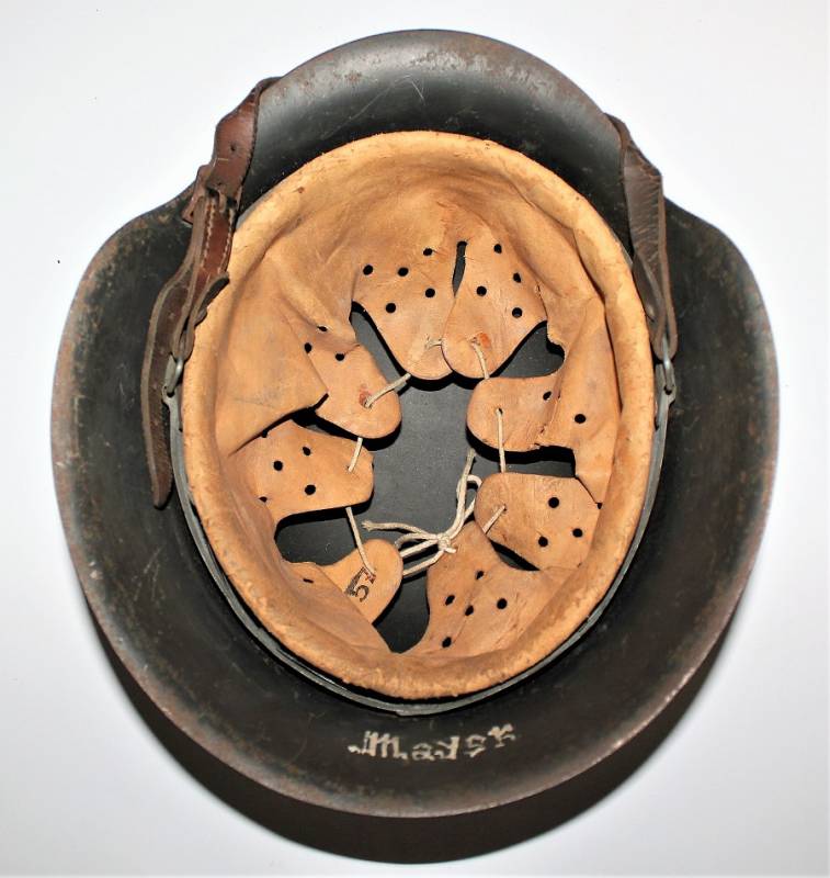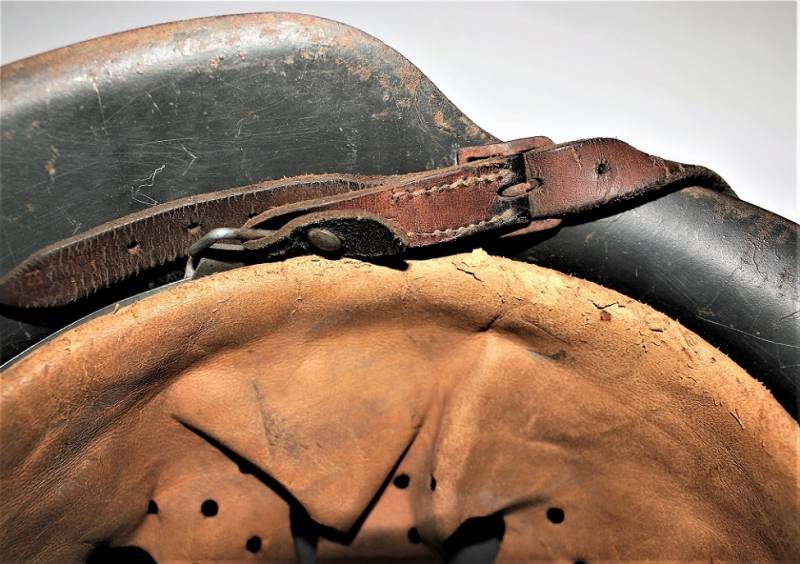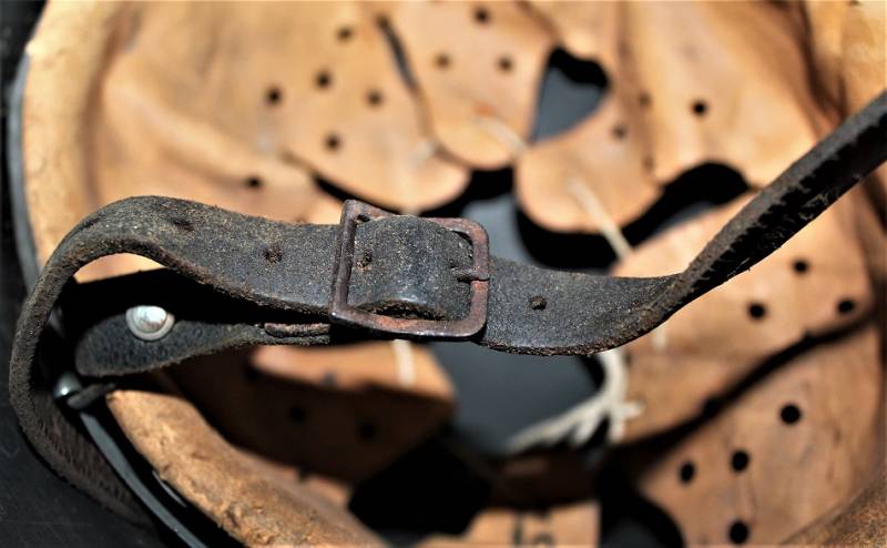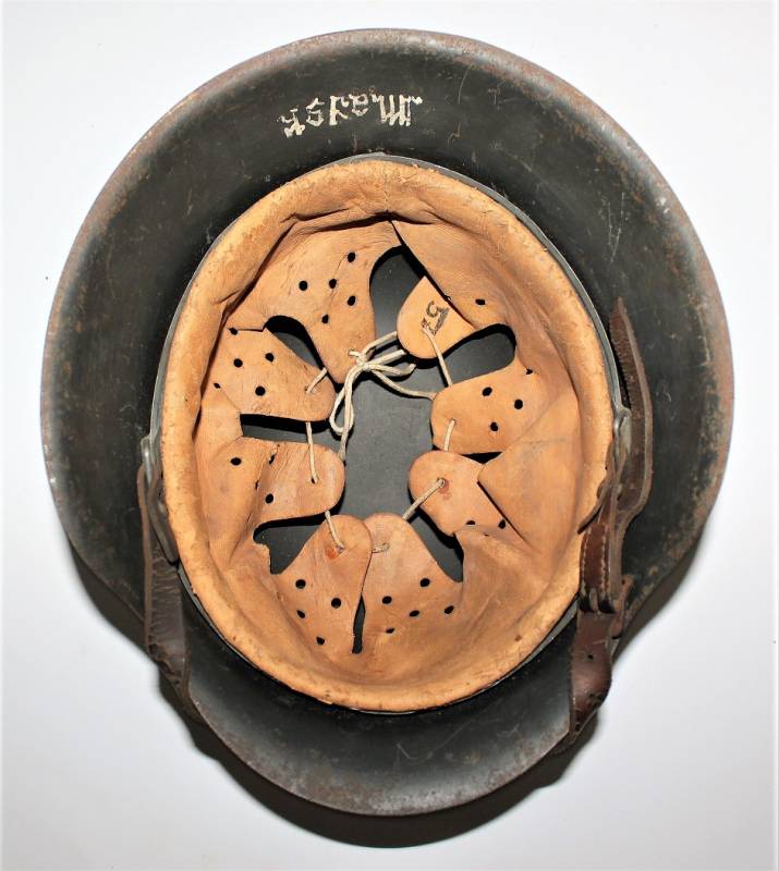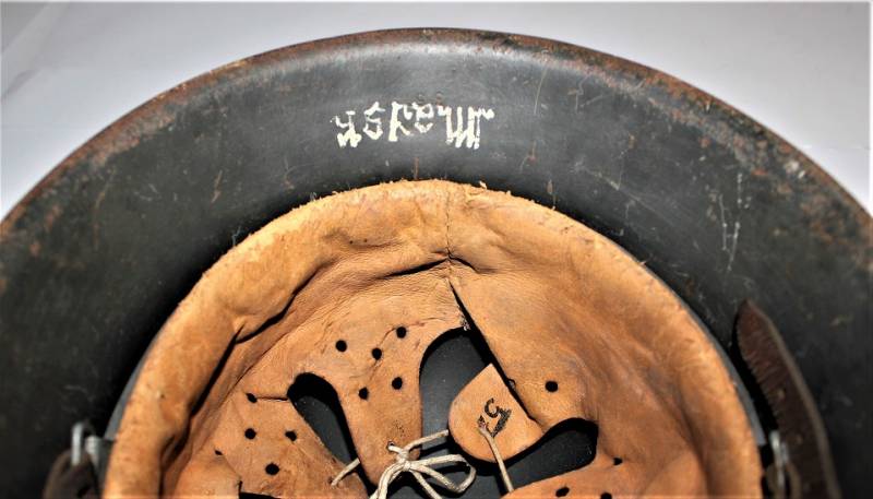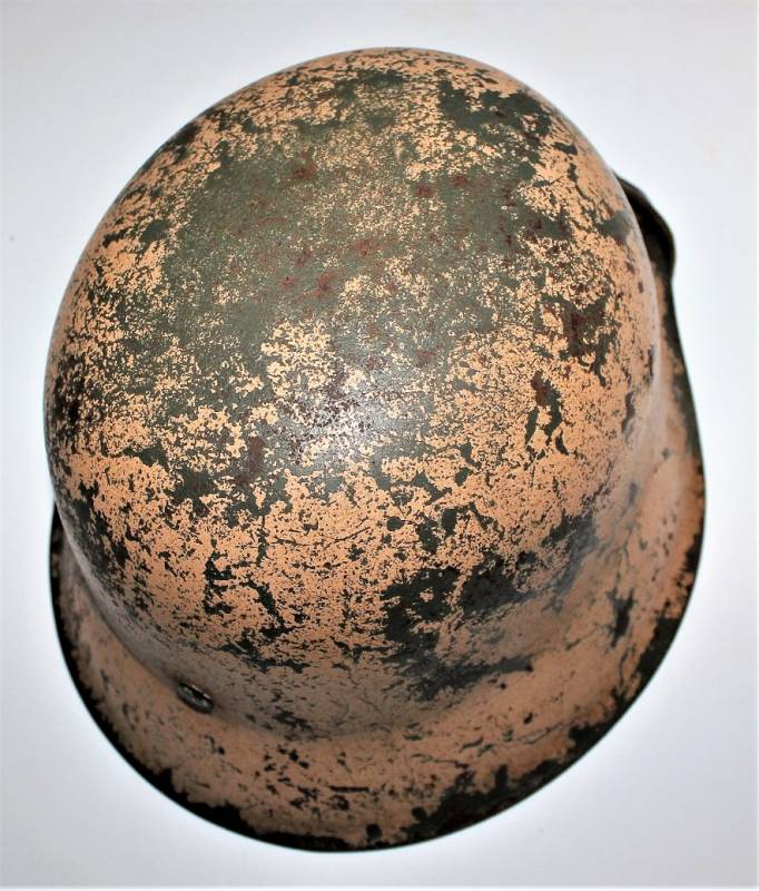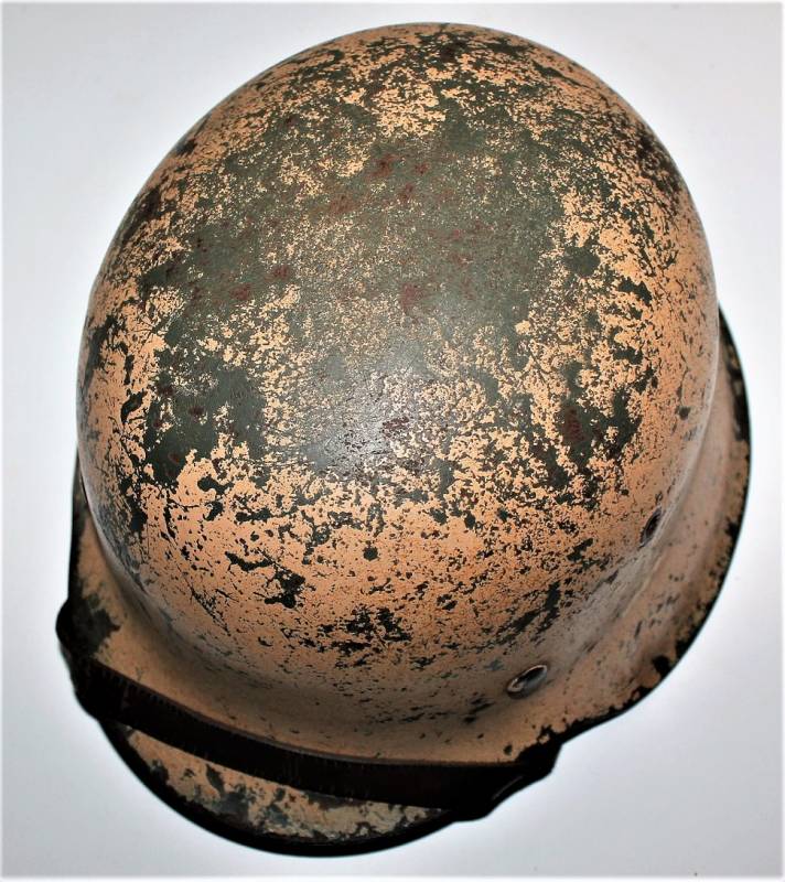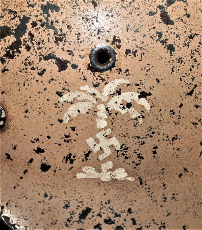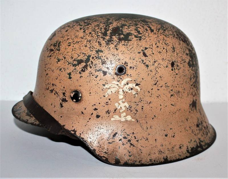 M42 tropical helmet DAK of the LW in excellent condition with slight patina of time and use, 80% DAK yellow camouflage paint with palmette designed by the soldier on the left side, complete in all its parts, inside and chinstrap never disassembled or damaged, marked on the iron with manufacturer´s code and iron size 64, leather size 57, chinstrap marked with manufacturer´s name and date. Internally on the iron the name of the soldier written in paint. Original 100% WWII period.